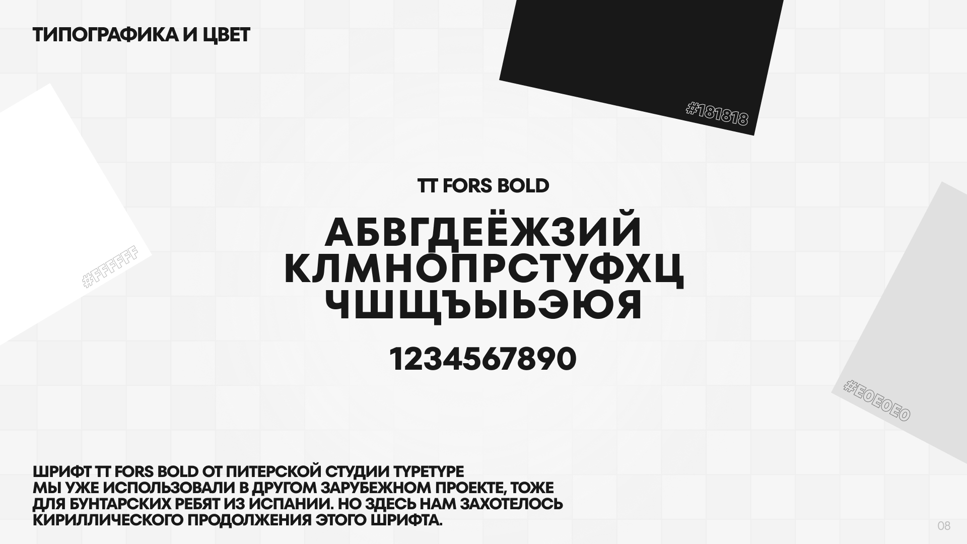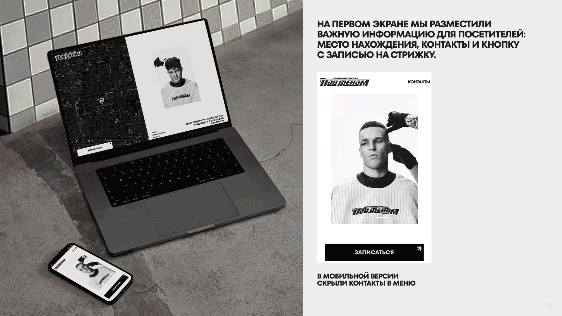 Все перечисленные элементы нашли своё отражение в веб-дизайне и анимации проекта. На первом экране мы разместили важную информацию для посетителей: адрес, контакты и кнопку с возможностью записаться онлайн на стрижку или бритьё. Акценты помог расставить шрифт TT Fors Bold от питерской студии TypeType, который мы уже использовали на другом проекте для зарубежного заказчика, но нам захотелось продолжения в кириллице!