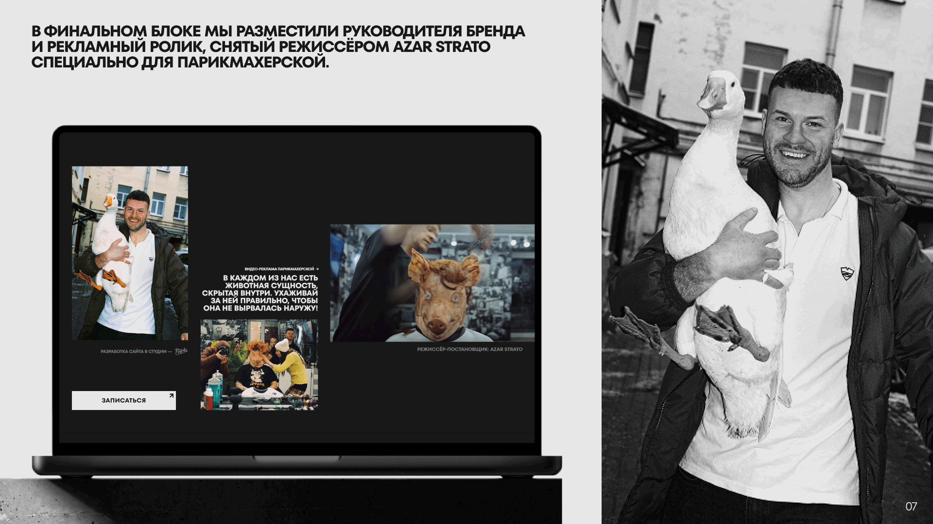 В финальном блоке мы разместили руководителя бренда и рекламный ролик, снятый режиссёром Azar Strato. Кстати, видео идёт неполные полторы минуты, быстро загружается и помогает тоньше понять философский подход парней к клиентам и к жизни.