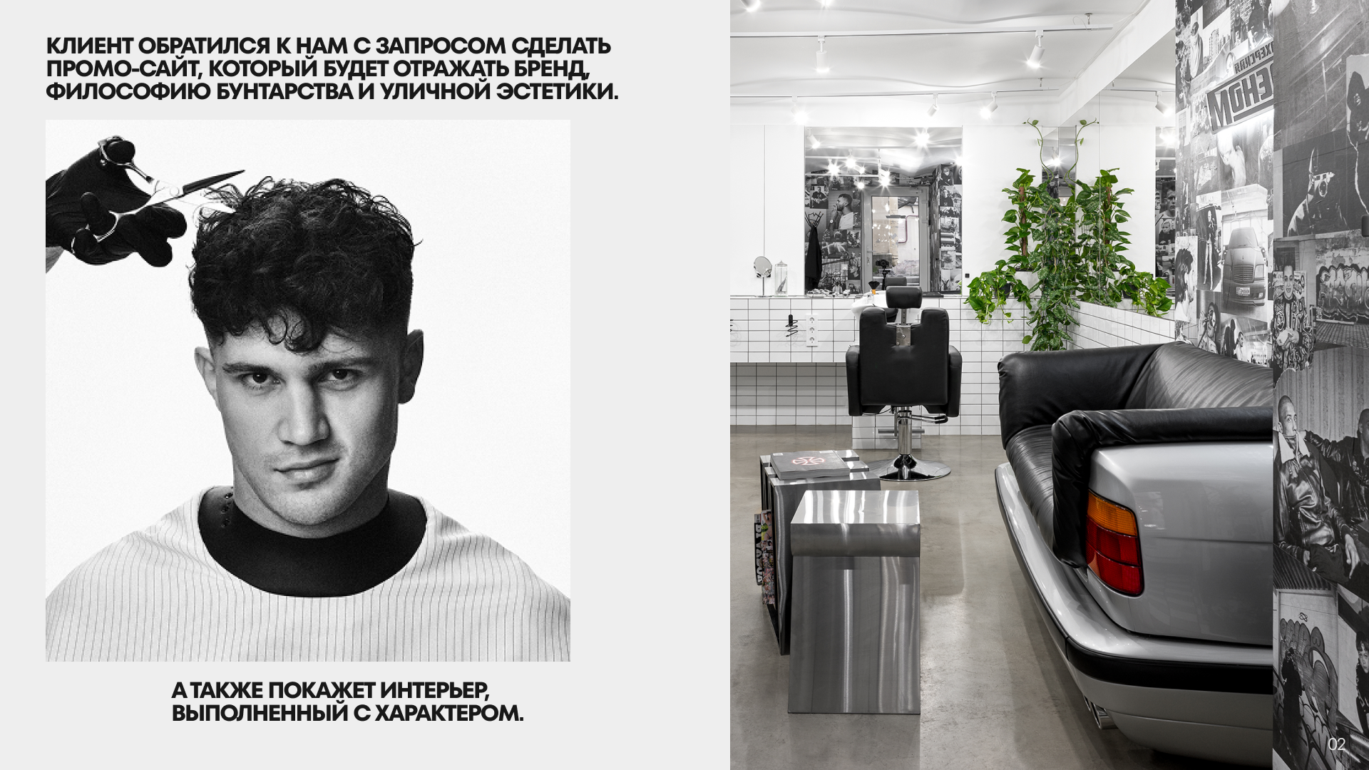Клиент обратился к нам с запросом сделать промо-сайт, который покажет аутентичный интерьер и будет отражать тот самый стиль бренда: философию бунтарства и уличной эстетики. Смелая и интересная задача для нашей студии!