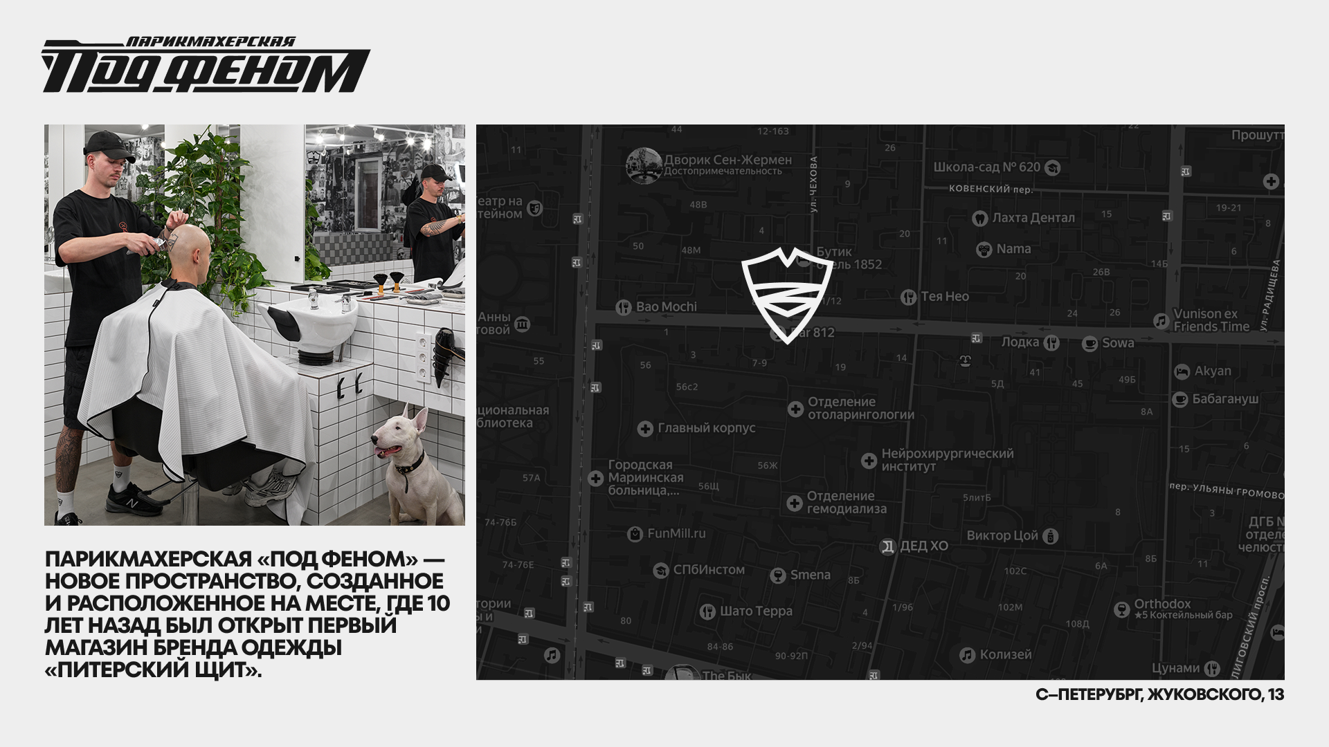 Парикмахерская «Под феном» — это новое пространство в Санкт-Петербурге, возникшее на улице Жуковского, в доме 13. Оно создано и расположено именно на том месте, где десять лет назад был открыт первый магазин бренда одежды «Питерский щит».