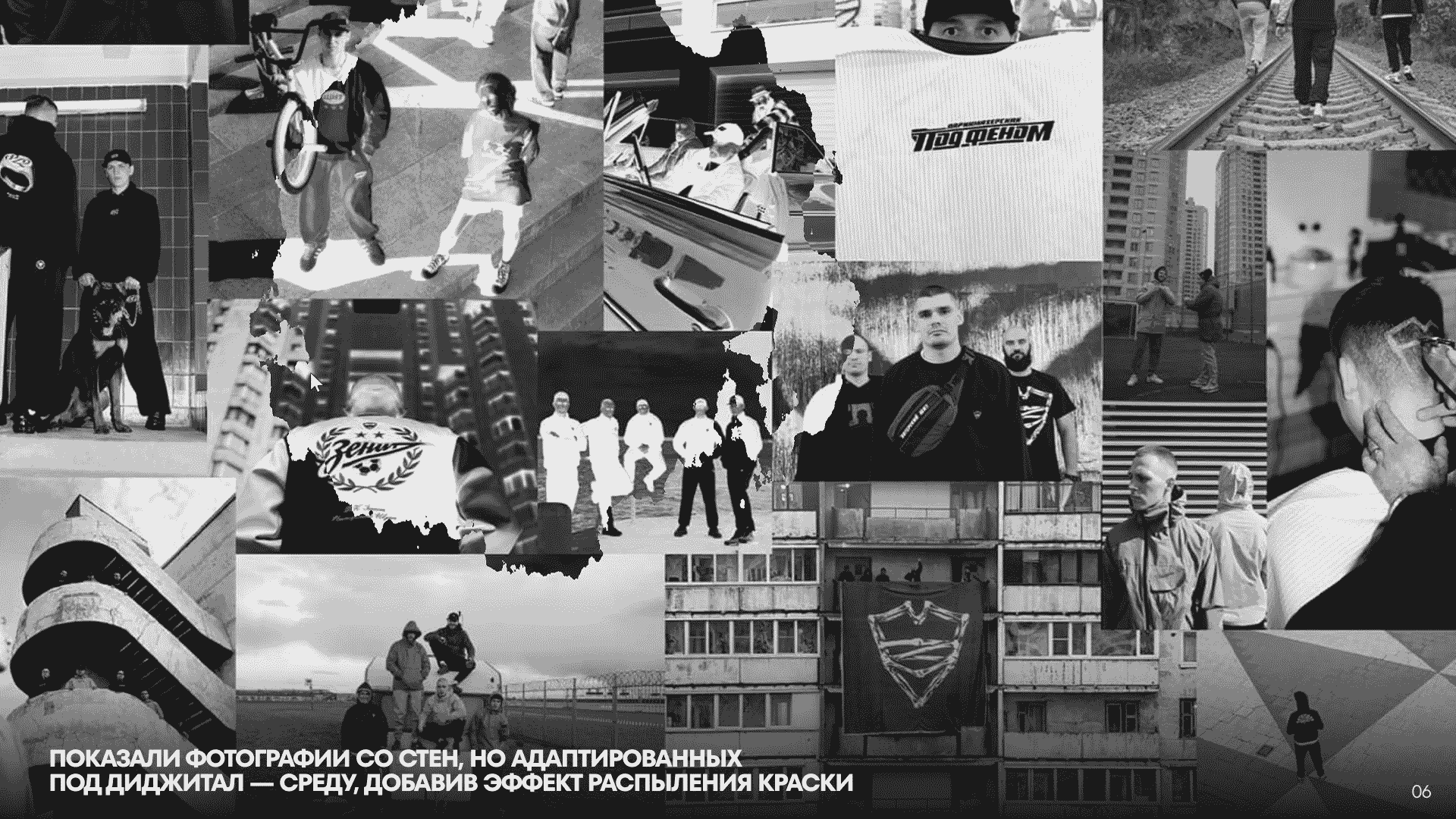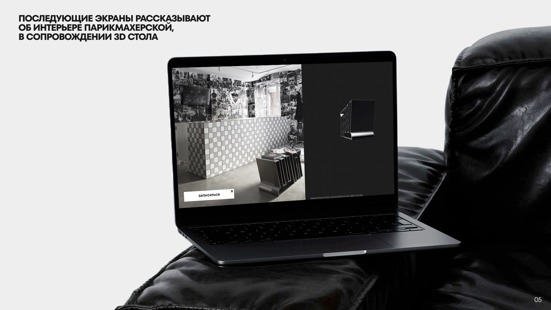 Следующие экраны рассказывают посетителю об интерьере парикмахерской и её планировке. Это фотогалерея на WebGL и висящий рядом 3D-стол с аббревиатурой «ПЩ», отсылающий к бренду-родоначальнику. Далее зрителя встречают фотографии из уличной жизни, перенесённые со стен заведения, но адаптированные под диджитал-среду.