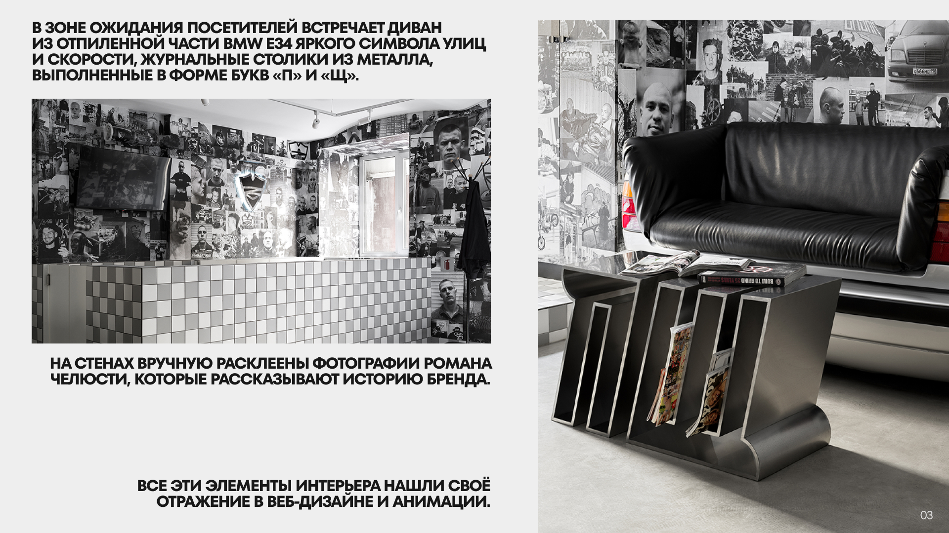 Характер заведения противопоставляется бездушным сетевым барбершопам. Пространство разделено на две зоны. Первая — зона ожидания, оформленная плиткой в шашечку с диваном из отпиленной части BMW E34 — яркого символа улиц и скорости. Журнальные столики выполнены из металла в форме букв «П» и «Щ», а на стенах вручную расклеены фотографии Романа Челюсти, которые рассказывают историю бренда «Питерский щит». Вторая зона — рабочая. Раковины для мытья головы расположены прямо напротив кресел — это решение восходит к традициям старых парикмахерских, где всё делалось на одном месте для максимального удобства и скорости. Дизайн каждого элемента отражает брутальный, честный стиль, без лишнего пафоса.