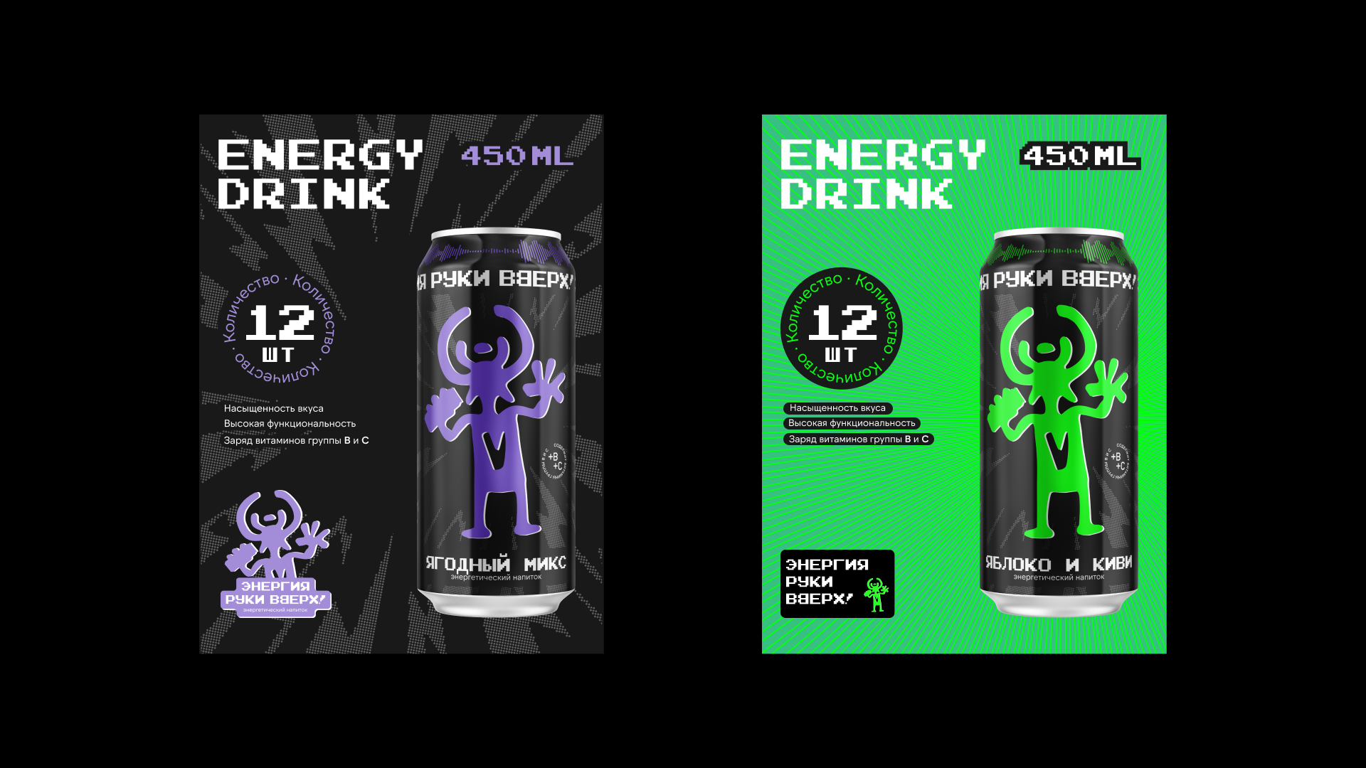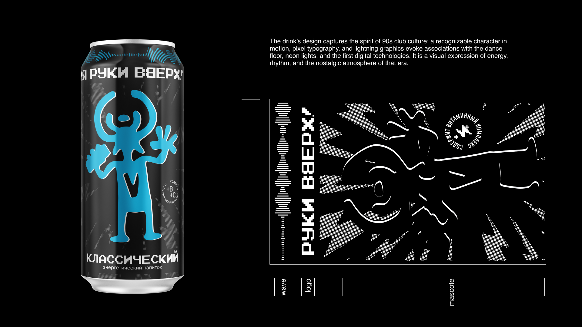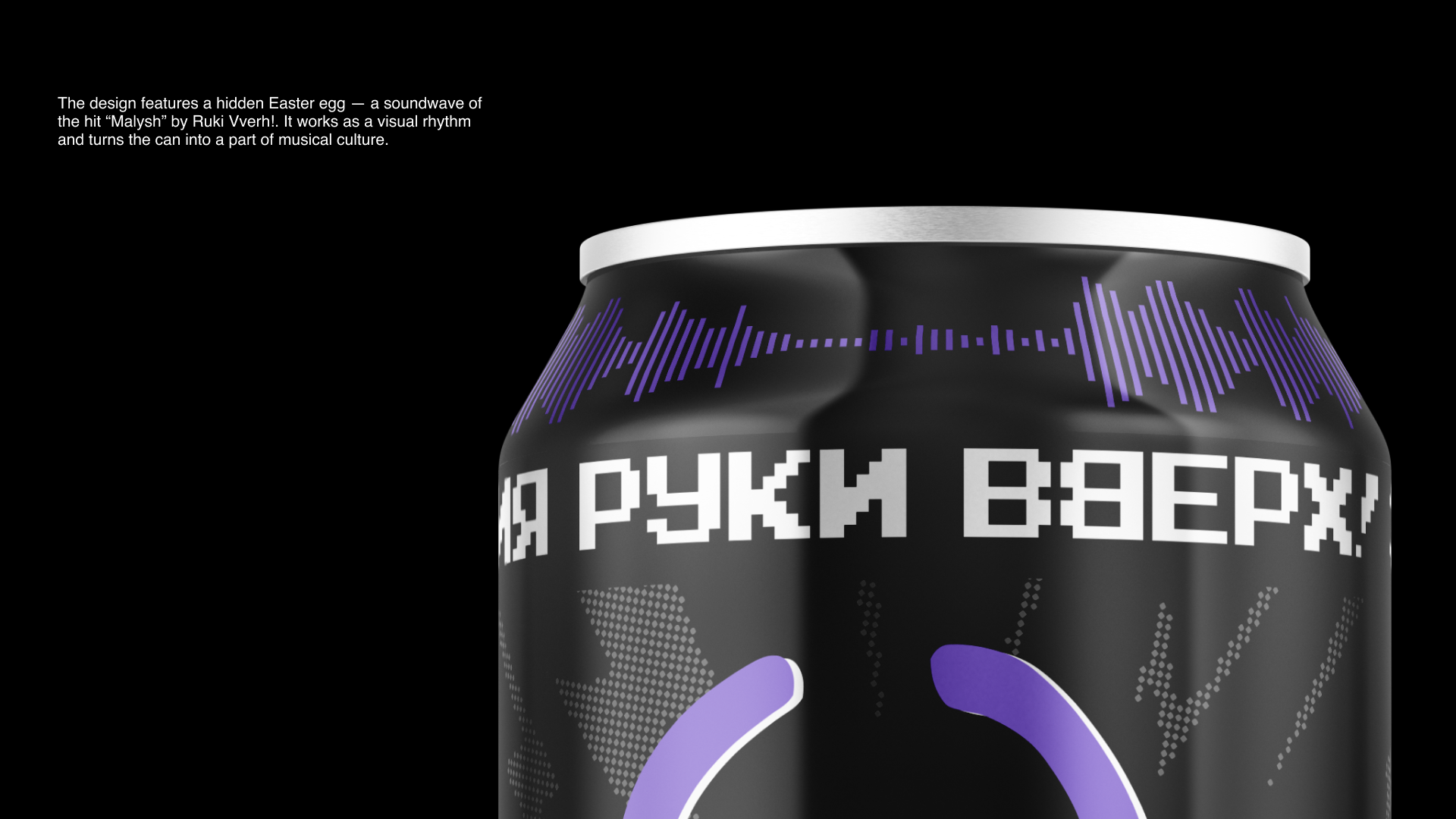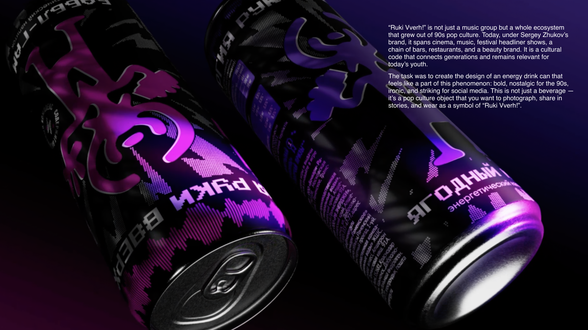 «Сделайте мне такую банку, которую круто держать в руках», — сказал Сергей Жуков. Этот запрос стал ключевым для создания дизайна энергетика «Руки Вверх!». Мы ответили на него тактильной формой и сдержанной палитрой, уйдя от кричащих цветов в пользу взрослого, премиального ощущения.