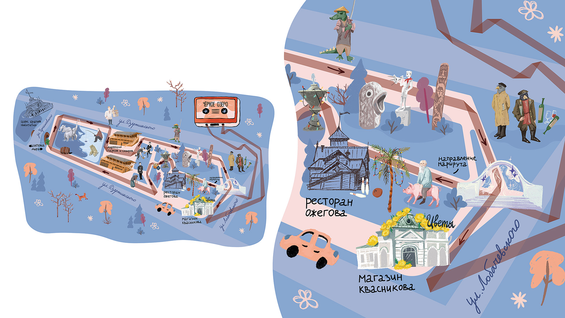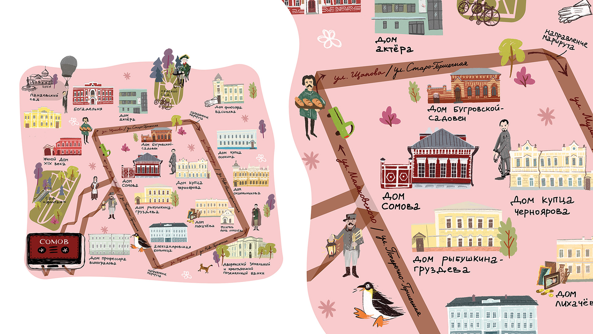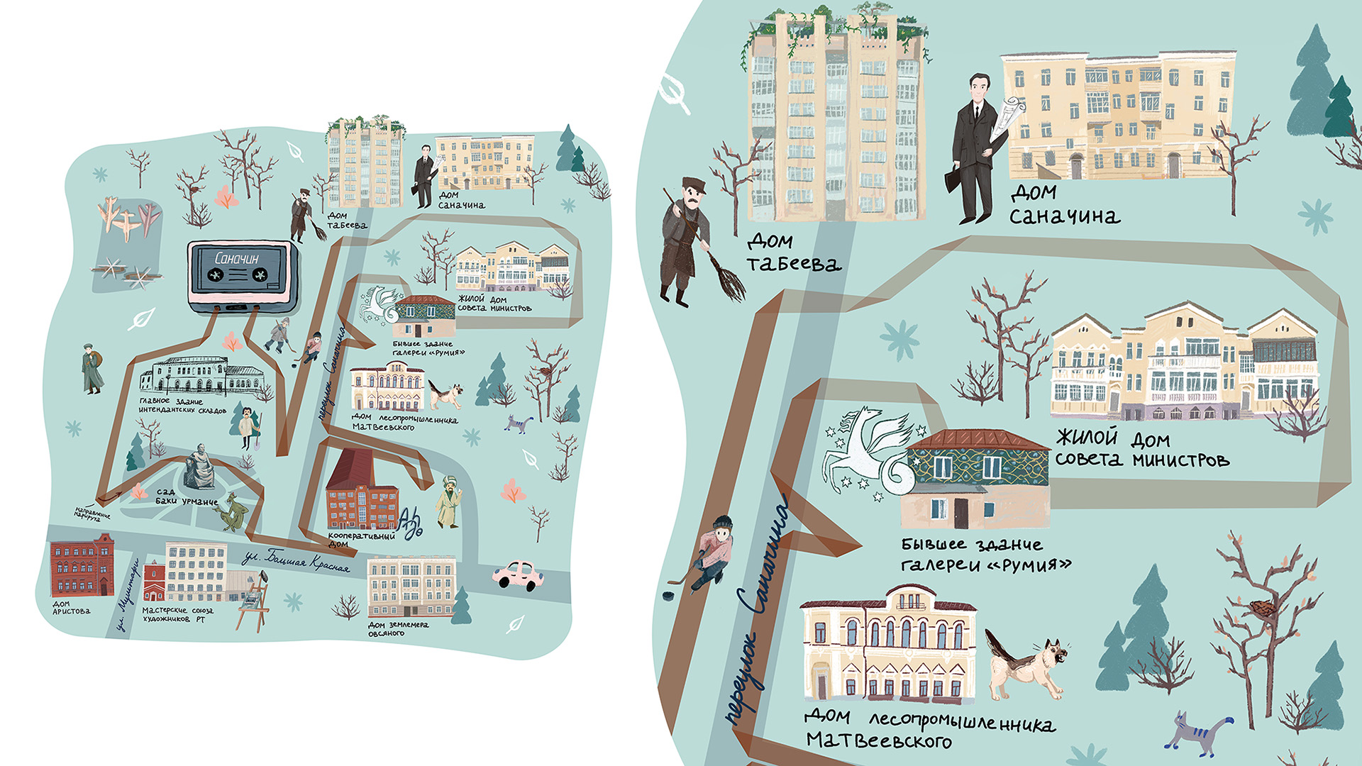 Особенность проекта — визуальная концепция, напоминающая полку с кассетами, где каждая «кассета» — это отдельный маршрут, оформленный иллюстрациями. Каждая карта маршрута иллюстрирована с отрисовками исторических фасадов и архитектурных деталей, позволяя слушателю лучше понять историю места. Иллюстрации не только украшают карту, но и рассказывают сюжетные зарисовки — здесь оживают увлекательные истории и малоизвестные факты из содержания аудиогида. Иллюстрации делают визуальный ряд насыщенным, создавая ощущение настоящего путешествия во времени. Каждая карта — уникальна: иллюстрации никогда не повторяются, а шрифты для названия кассет разрабатываются отдельно для каждой.