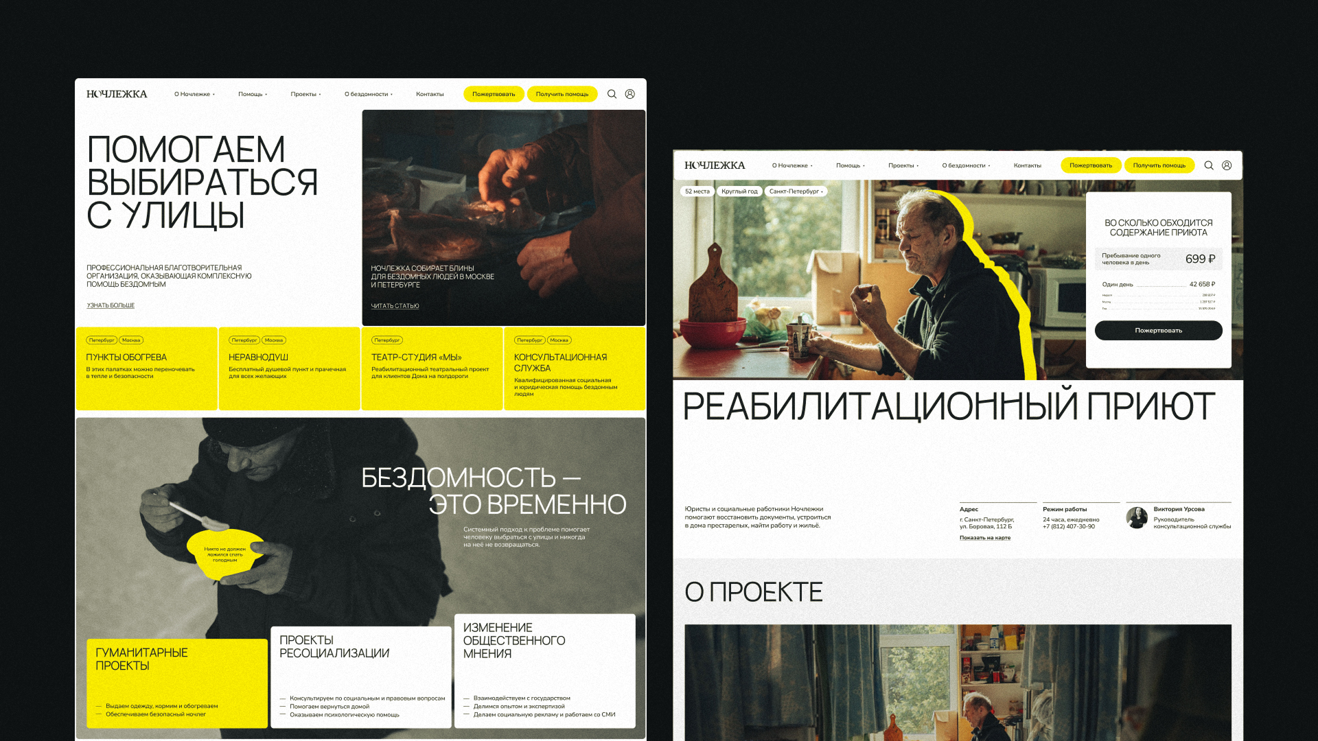 Ночлежка была и остается самой крупной организацией в России, которая помогает бездомным. Годы работы масштабировали проект, командра росла, коммуникация менялась. Вместе с этим появился запрос в поиске нового фирменного стиля, который без надрыва, но с достоинством, отражал бы суть и разнонаправленность деятельности Ночлежки.