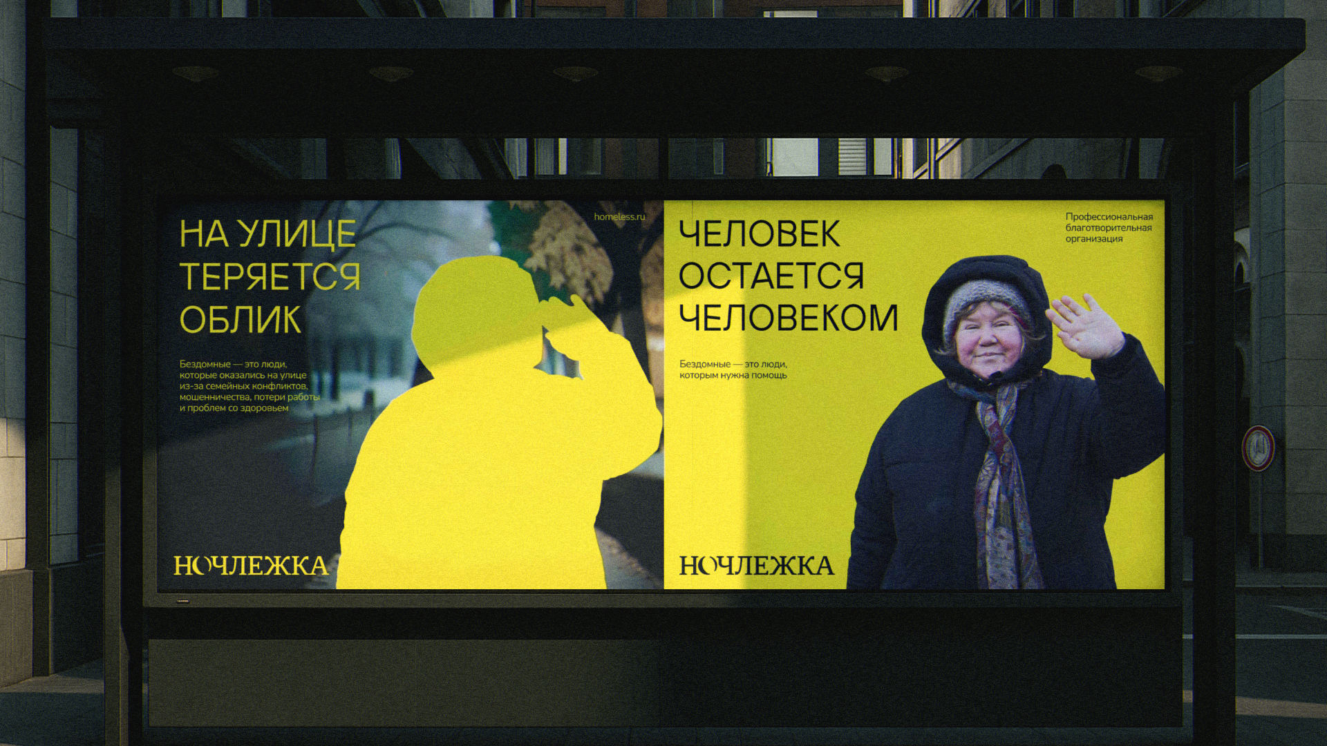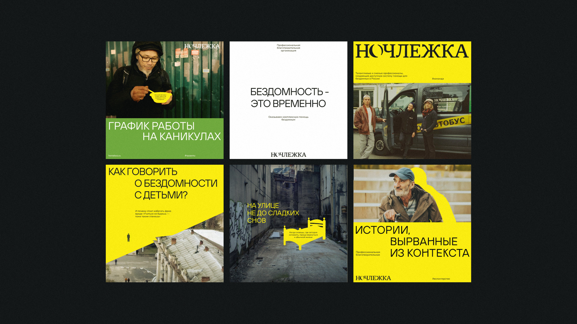 Ночлежка была и остается самой крупной организацией в России, которая помогает бездомным. Годы работы масштабировали проект, командра росла, коммуникация менялась. Вместе с этим появился запрос в поиске нового фирменного стиля, который без надрыва, но с достоинством, отражал бы суть и разнонаправленность деятельности Ночлежки.