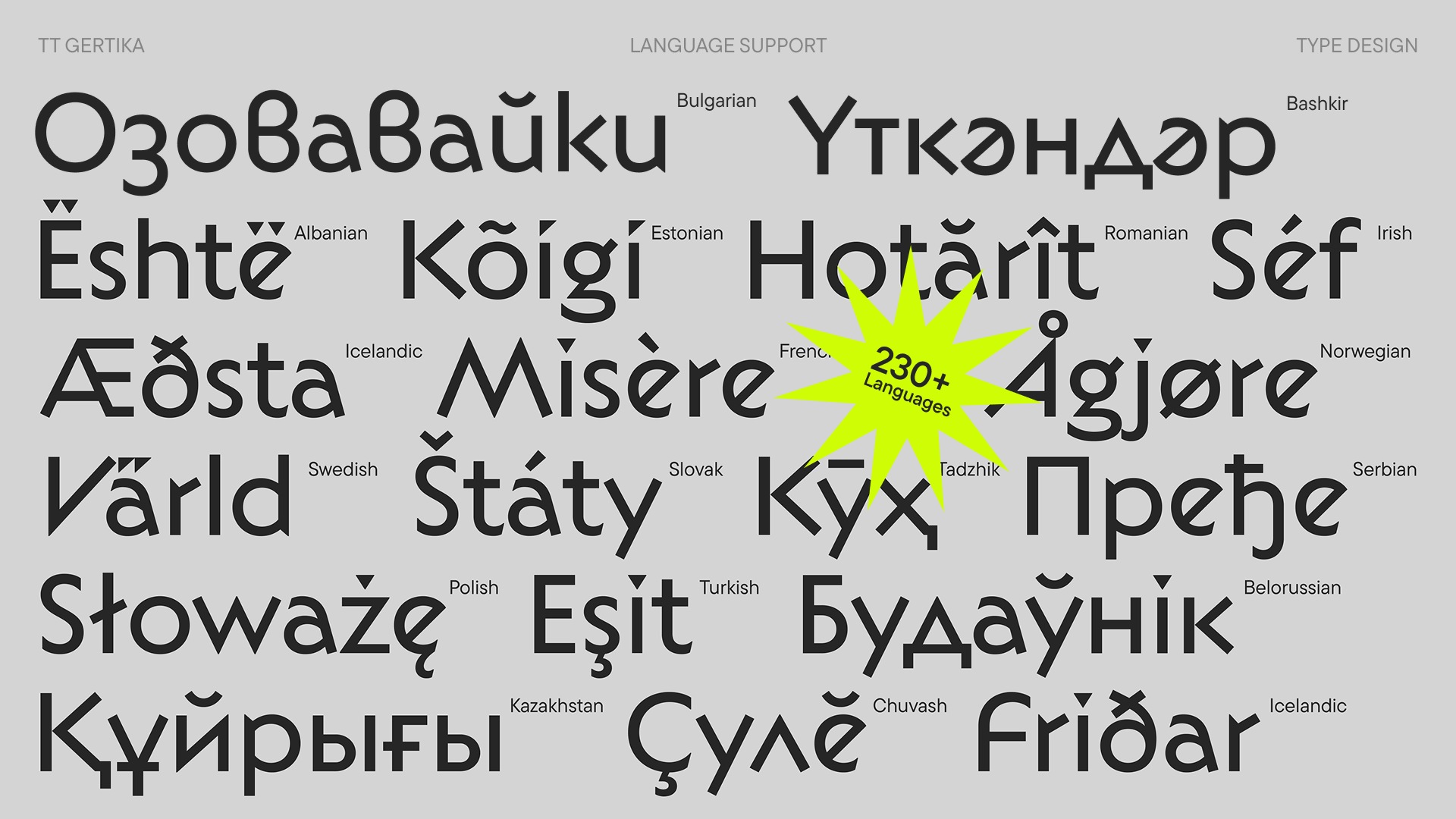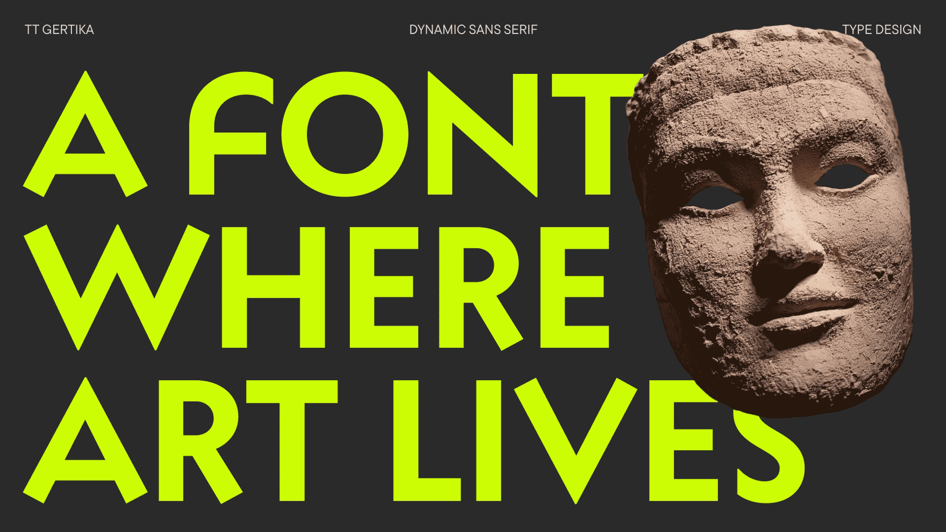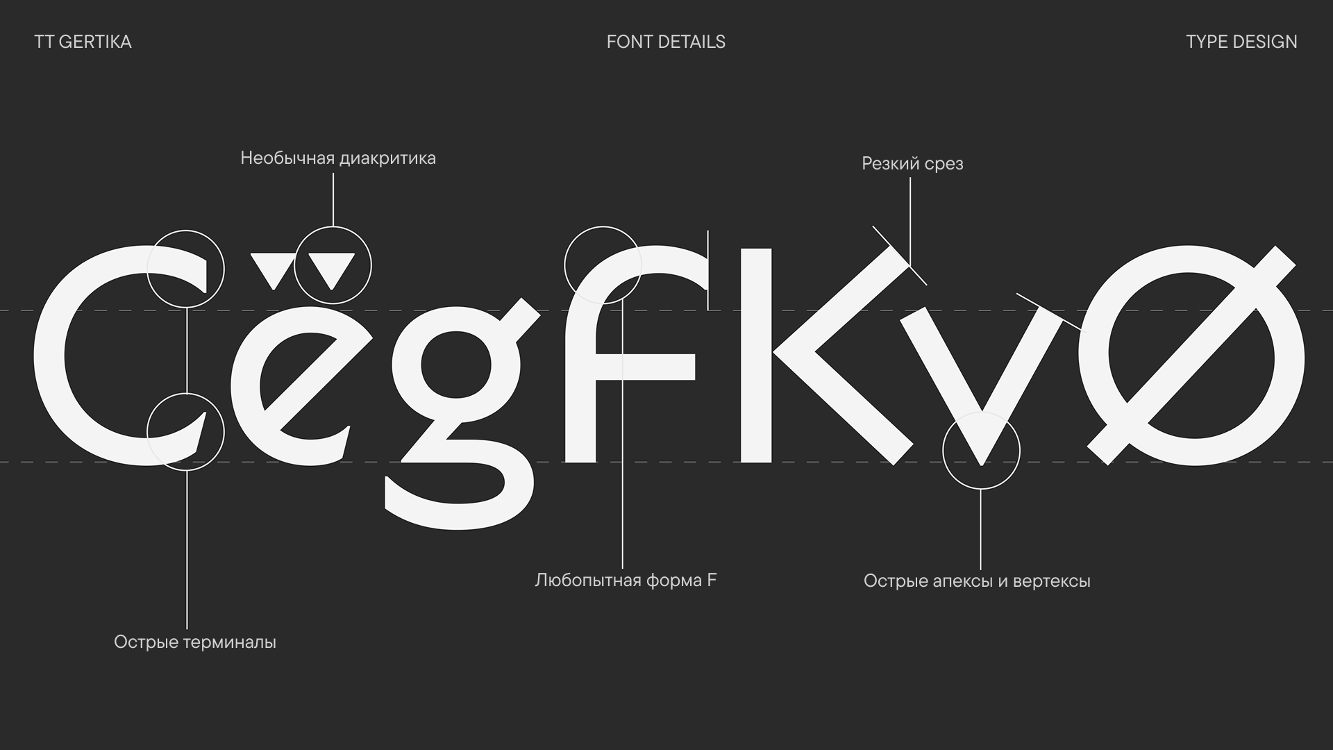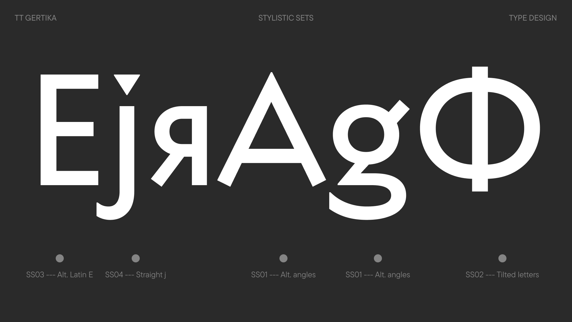 TT Gertika — геометрический гротеск с танцующим ритмом, в котором удивительным образом сочетаются архаичная мощь и современная динамика. Идея его создания зародилась из леттеринга на американском плакате 30-х годов.