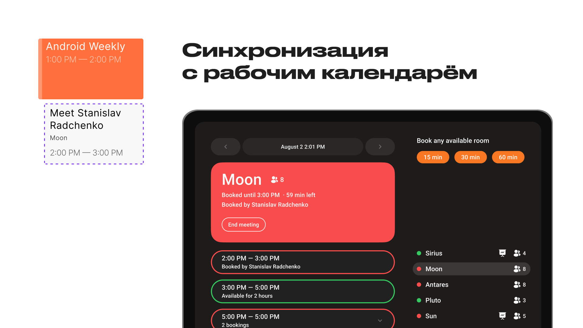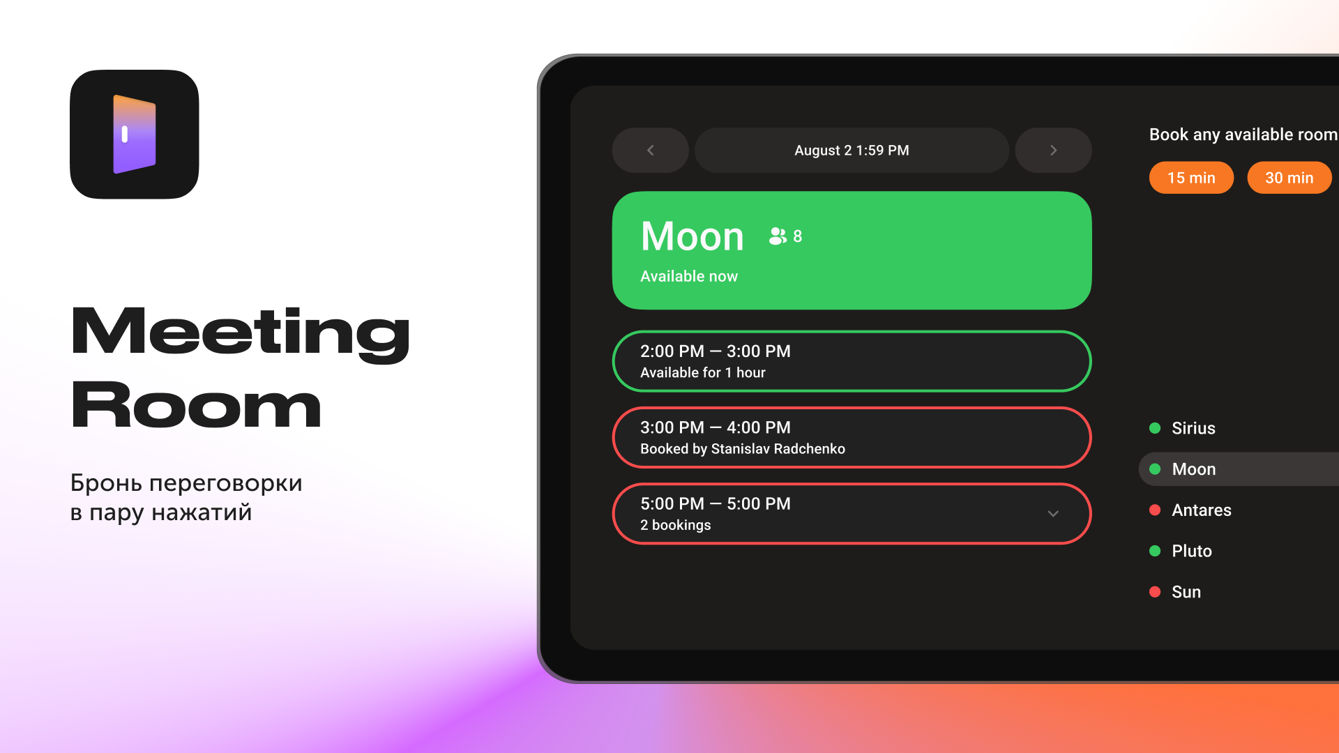 Мы используем Meeting Room в офисе больше года — планшеты стоят у дверей всех переговорок, и путаница с бронированием осталась в прошлом.
