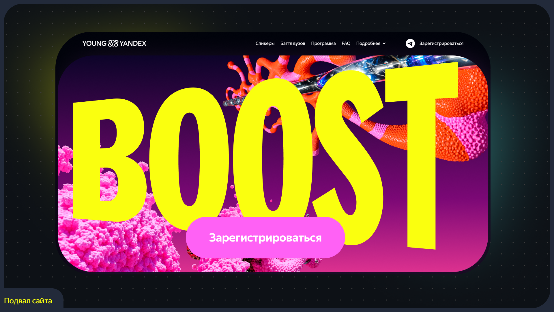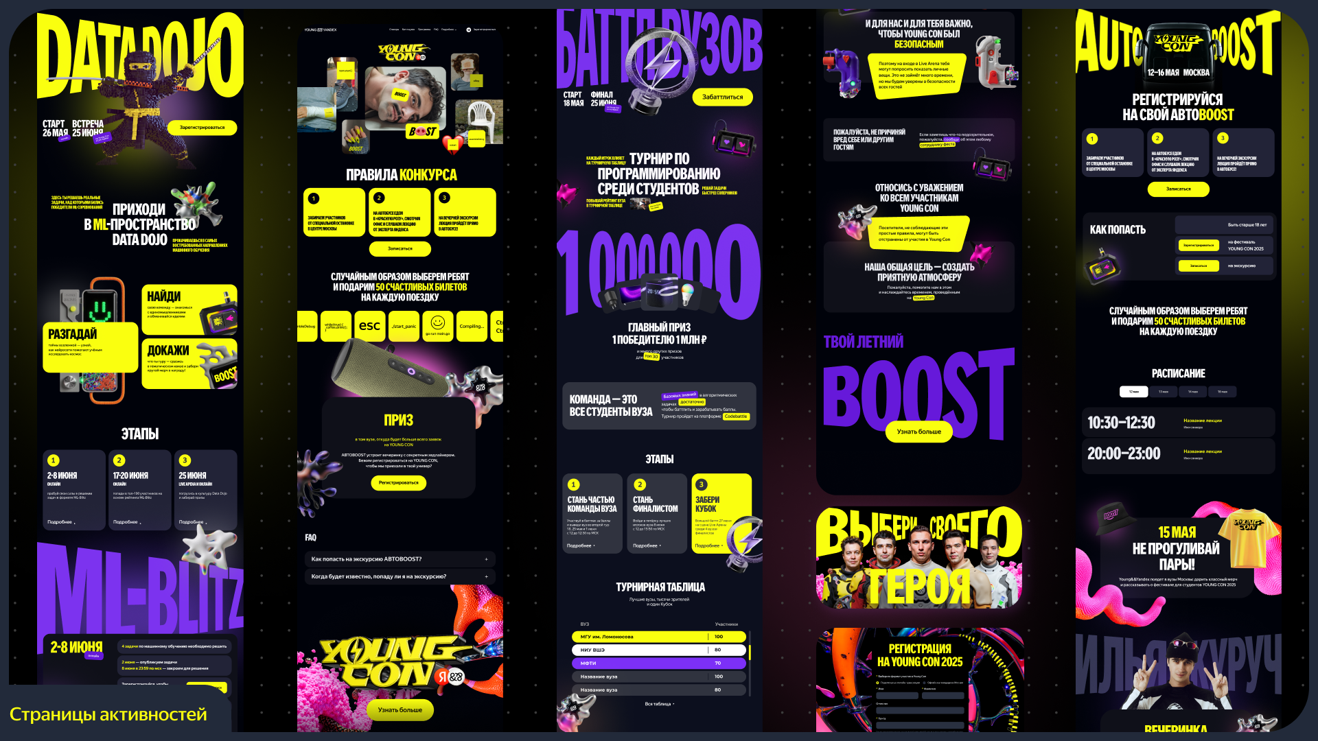 На главной разместили и другие хайлайты фестиваля: блок с технологиями Яндекса; анонс масштабного конкурса по программированию (баттл вузов) — с 3D-моделью кубка в стиле Young Con; регистрацию на событие, визуал мерча и т.д.