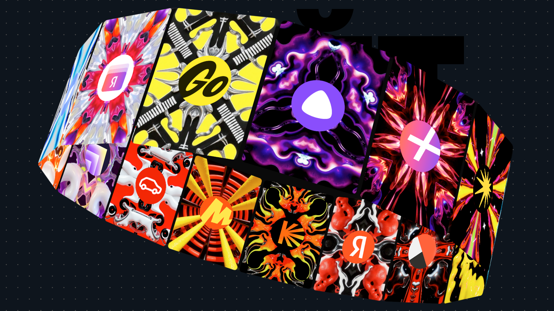 Отдельная задача — рассказать о 26 сервисах Яндекса. Для разных юнитов мы сгенерировали уникальные визуалы в айдентике Young Con. Они выглядели как настоящие арт-объекты. Затем заанимировали их и оформили в единую карусель.