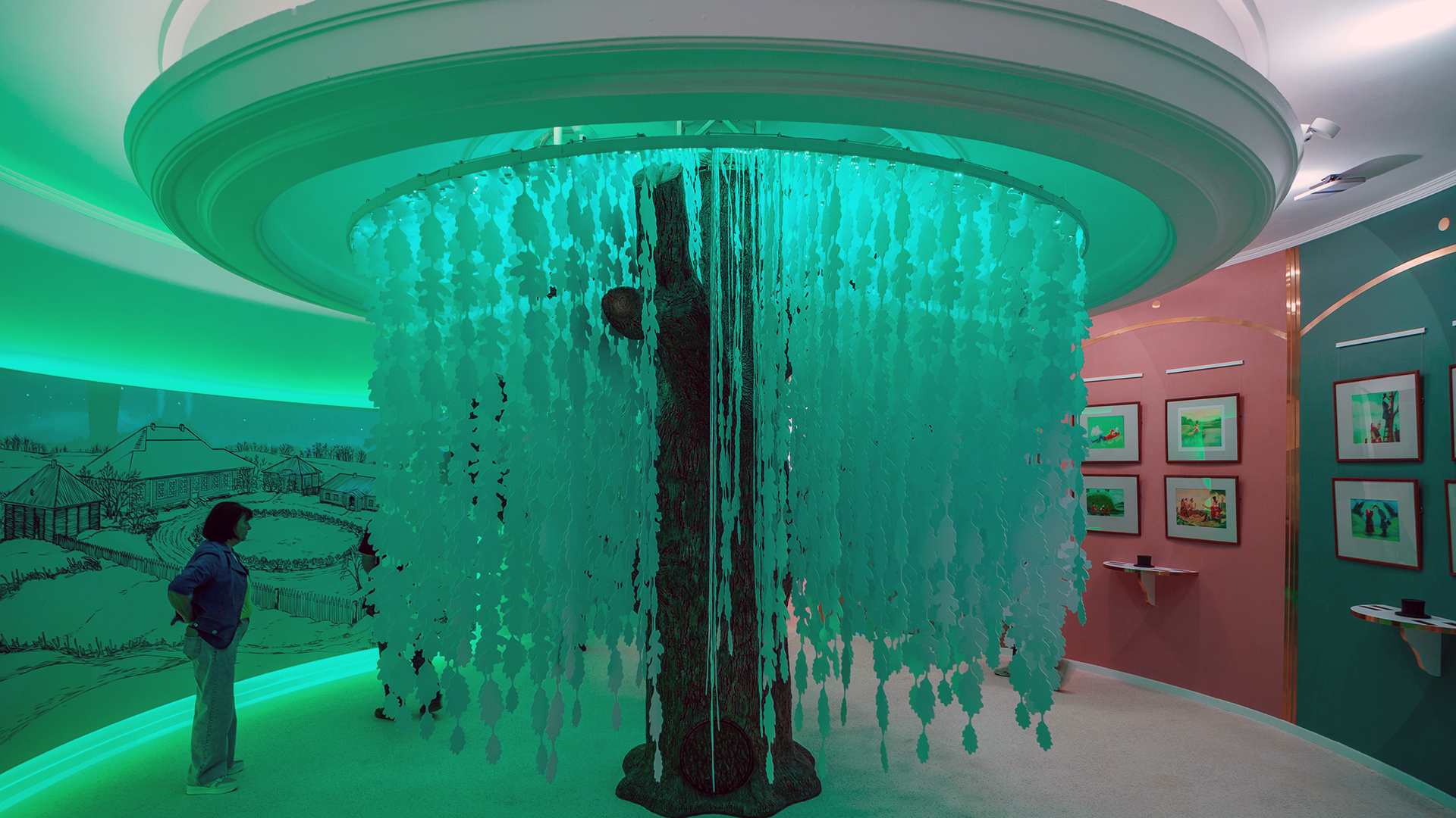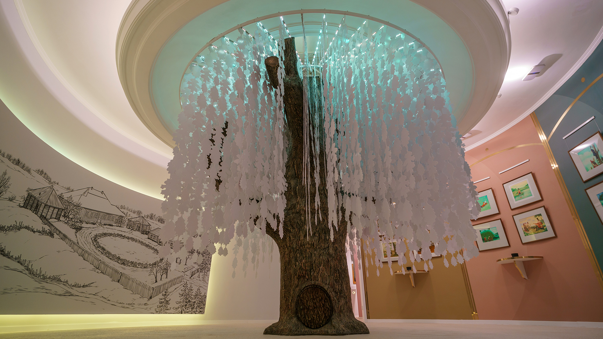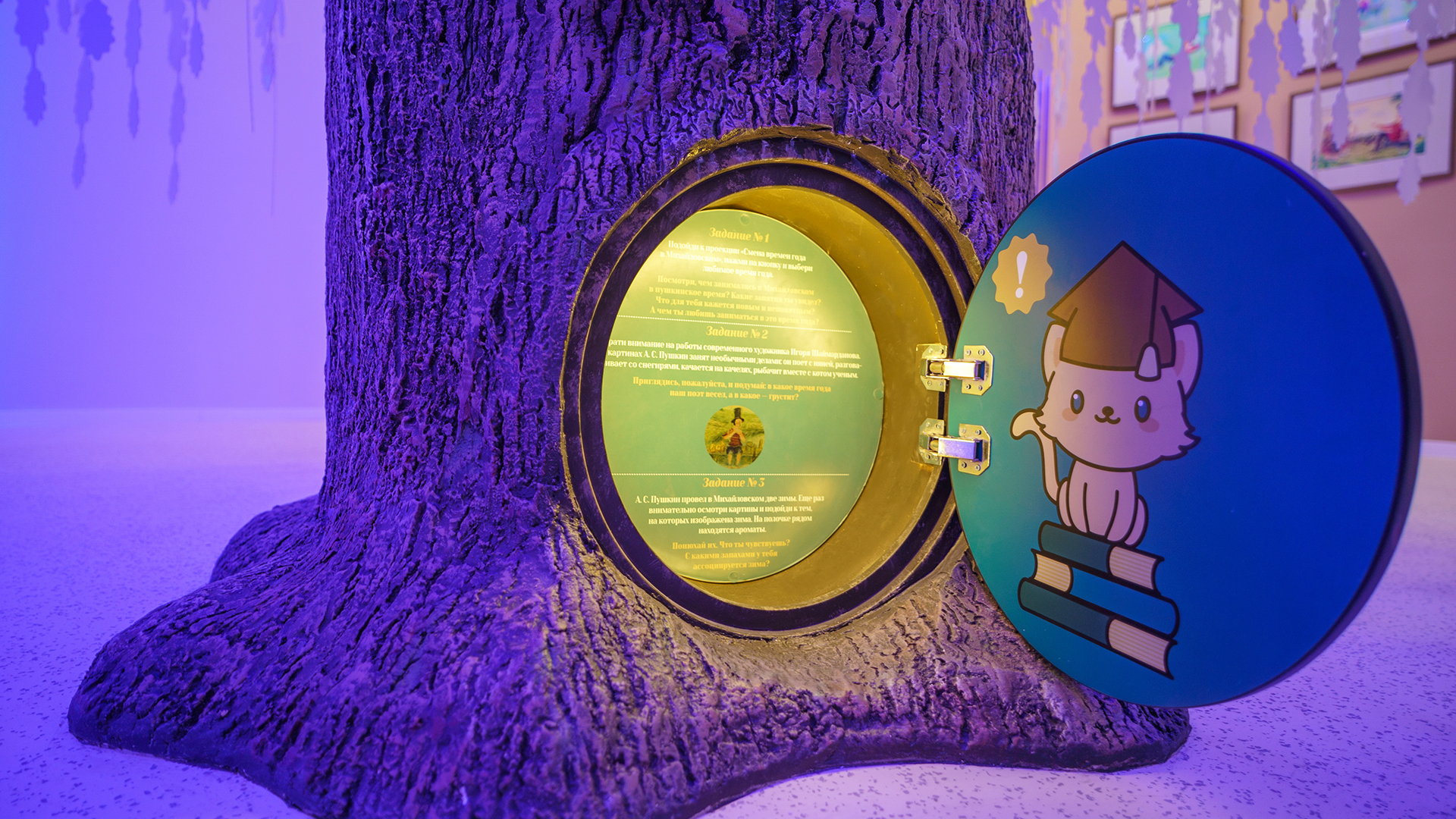 В нижней части дуба расположена дверца в дупло с заданиями от Кота Учёного — это часть детского квеста, который проходит через всю экспозицию.