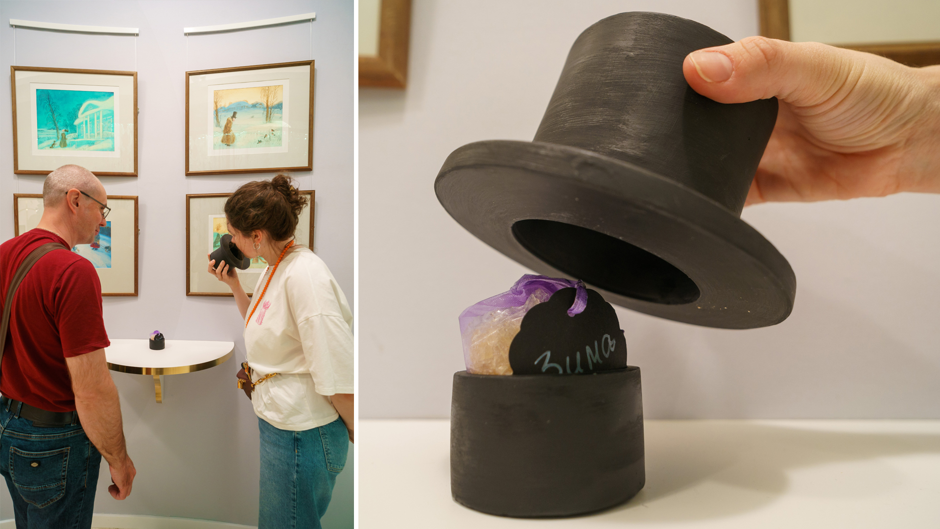 На стене справа представлено 4 группы художественных работ, сопровождаемых ароматическими композициями.