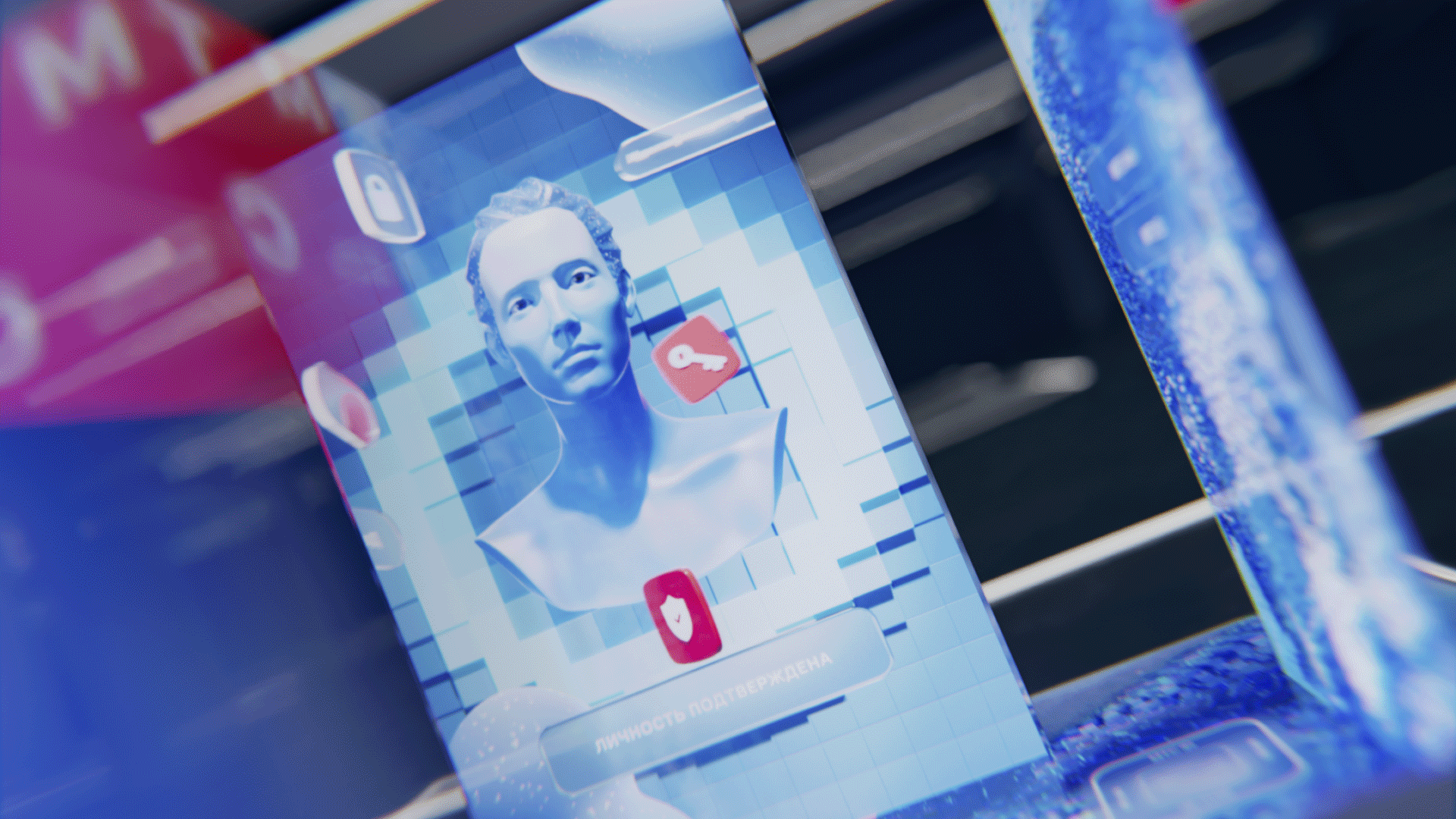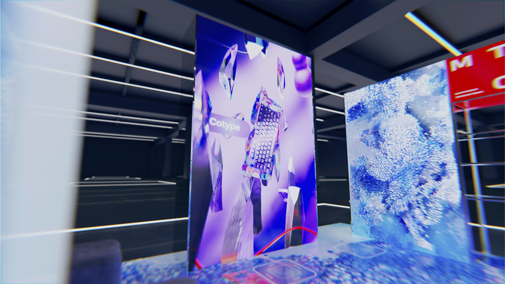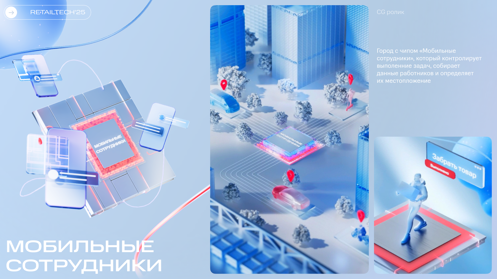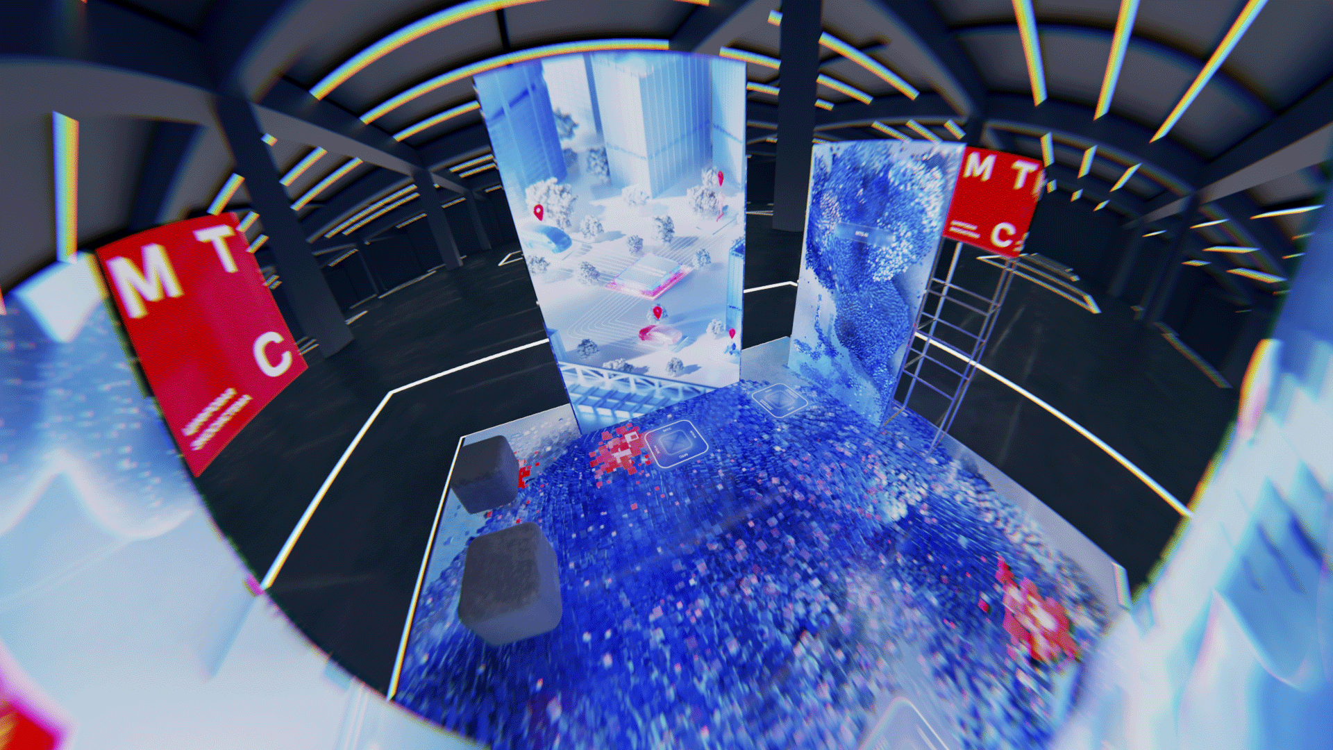 Графика реагировала на каждый шаг посетителя, делая его главным героем цифровой среды – прямая метафора экосистемы продуктов МТС, которая подстраивается под нужды пользователя. На стелах были установлены инфракрасные датчики, и при приближении посетителя запускался образный CG-ролик о продукте МТС. Для каждого из роликов мы создали уникальные образы, метафорически отражающие суть конкретного продукта. Нам хотелось уйти от привычного представления и создать запоминающиеся визуалы: например, МТС AI был представлен в виде футуристичного кристалла, трансформирующегося в разные сервисы.