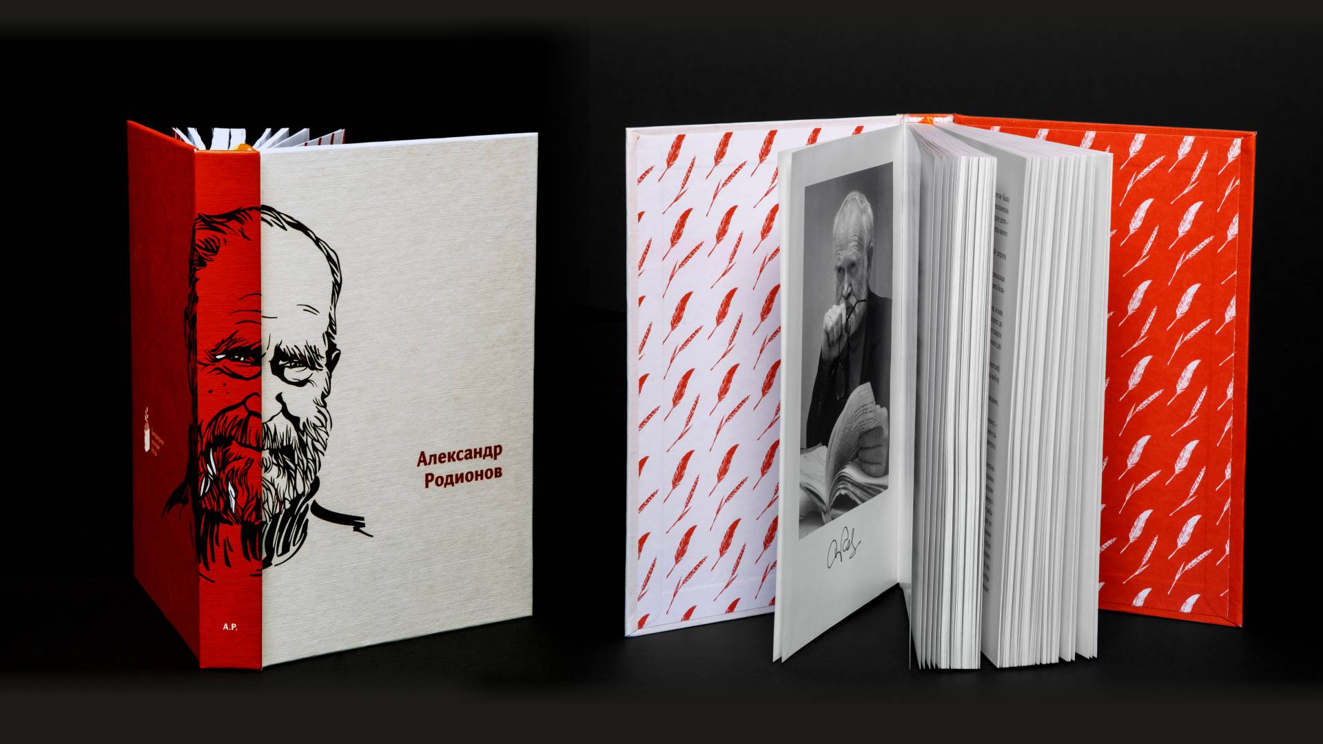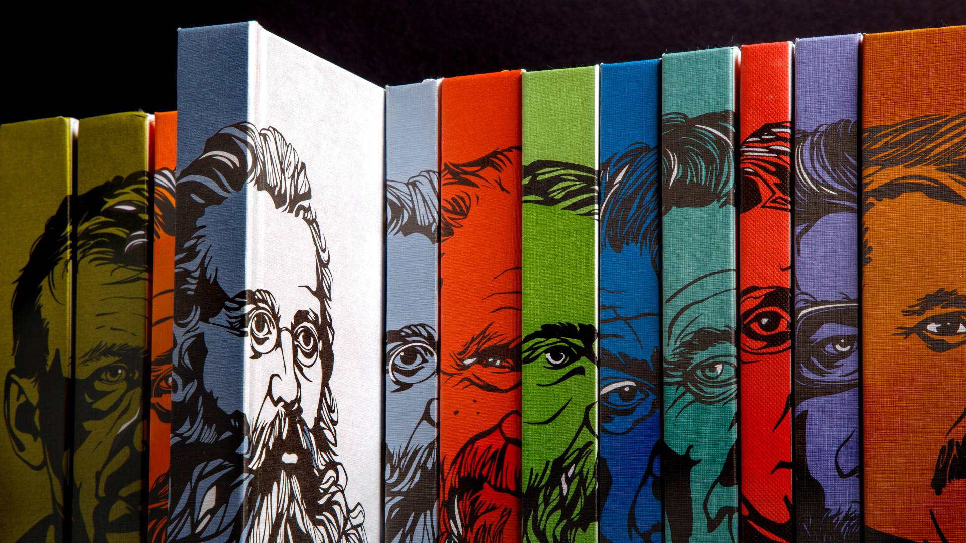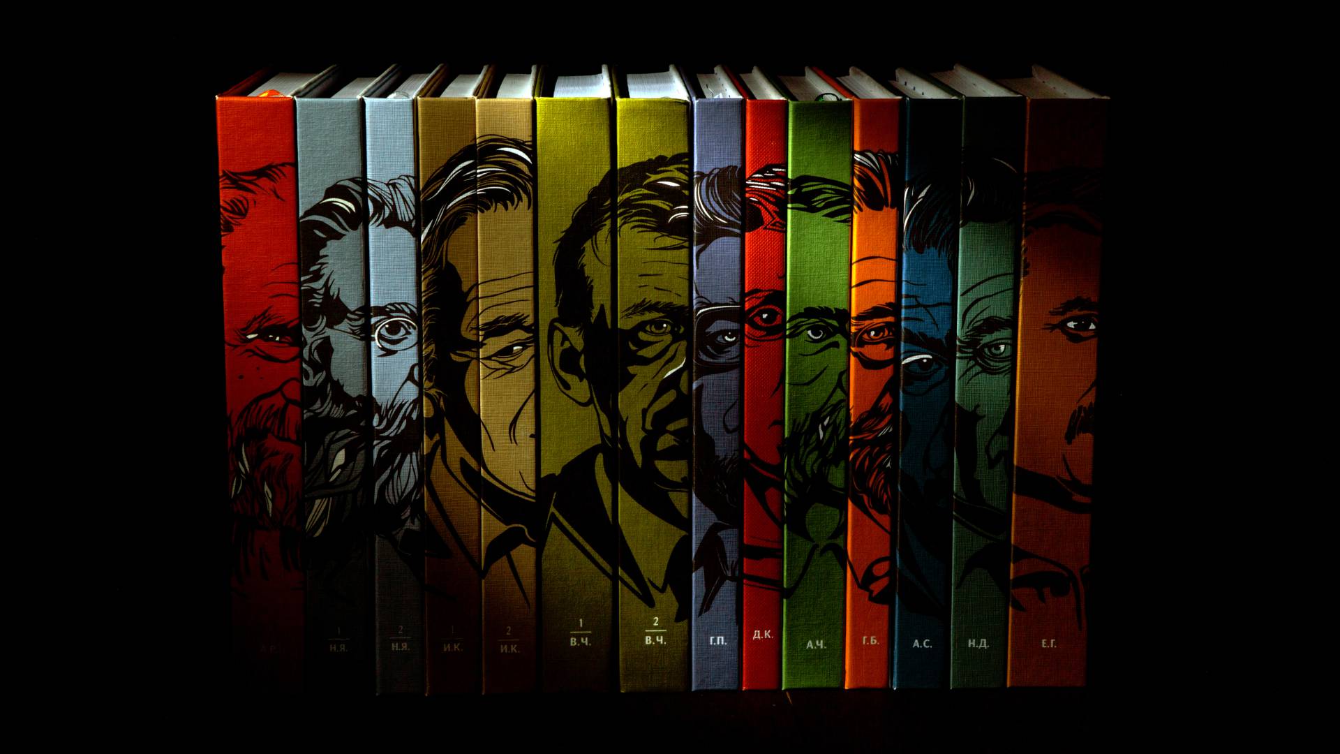 Портреты писателей смотрят на нас с книжных полок через грань времени, которую символизирует сгиб переплёта.