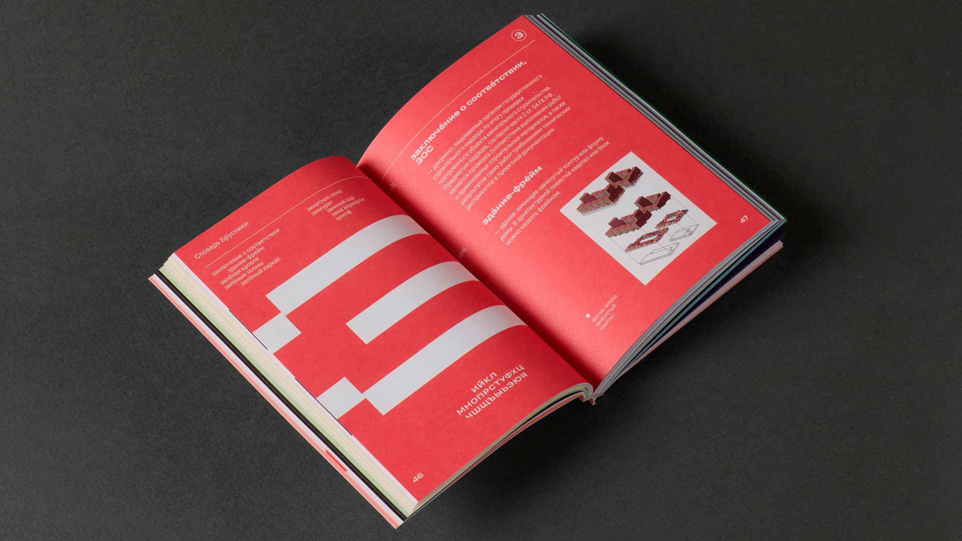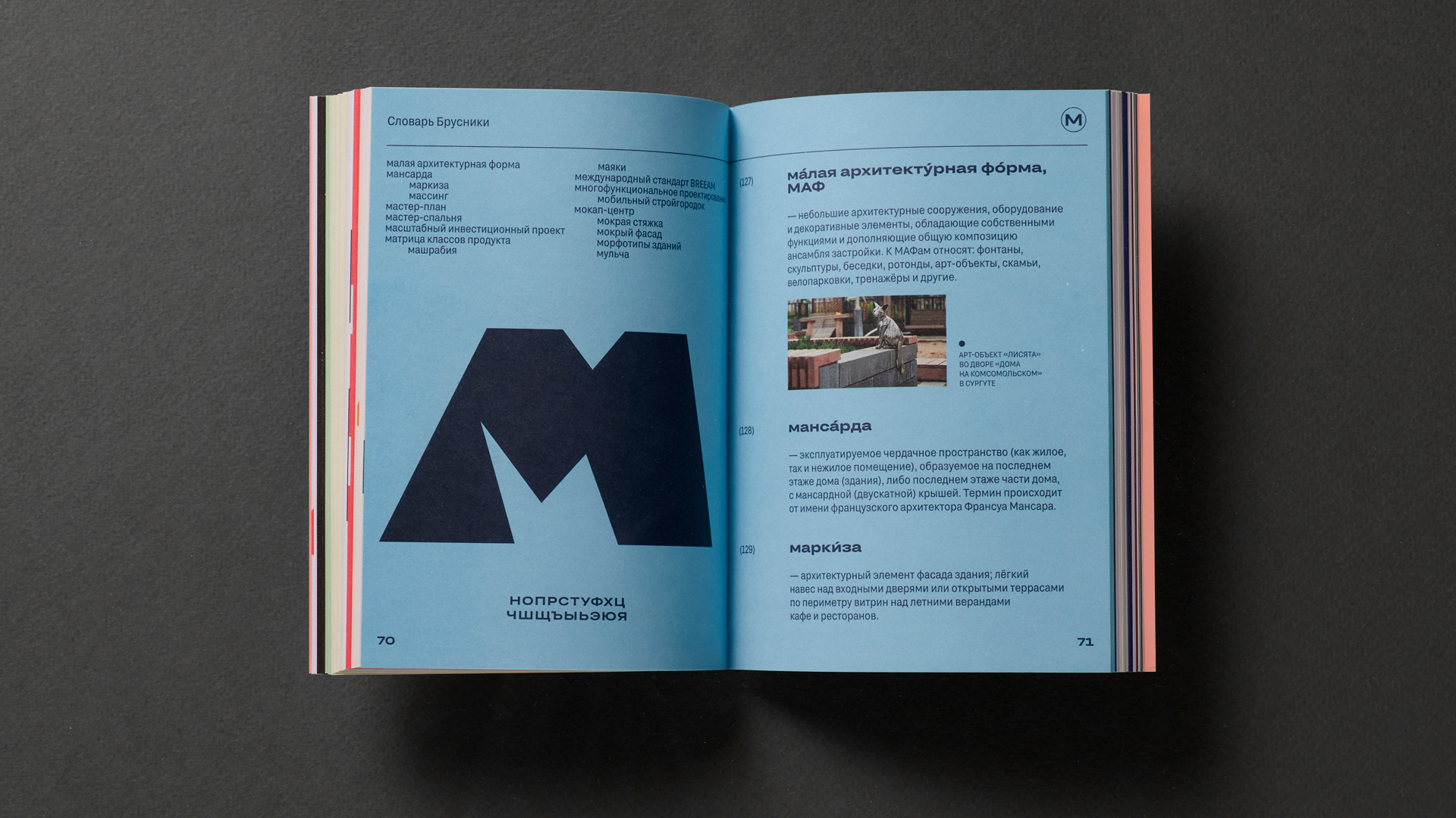 Продукт: Компактный (100x140 мм), 152-страничный словарь. Дизайн — ключевой коммуникатор: фирменный шрифт Grtsk Mega лежит в основе уникальных, но пропорционально единых букв; текст набран строчными буквами с выделением основного термина; ритм задает чередование монохромных и цветных страниц.