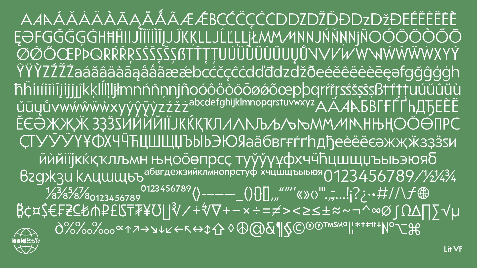 У шрифта есть довольно большой диапазон начертаний по насыщенности (+ вариативный формат) и внушительный знаковый состав: языки Западной Европы и народов России + много альтернатив.