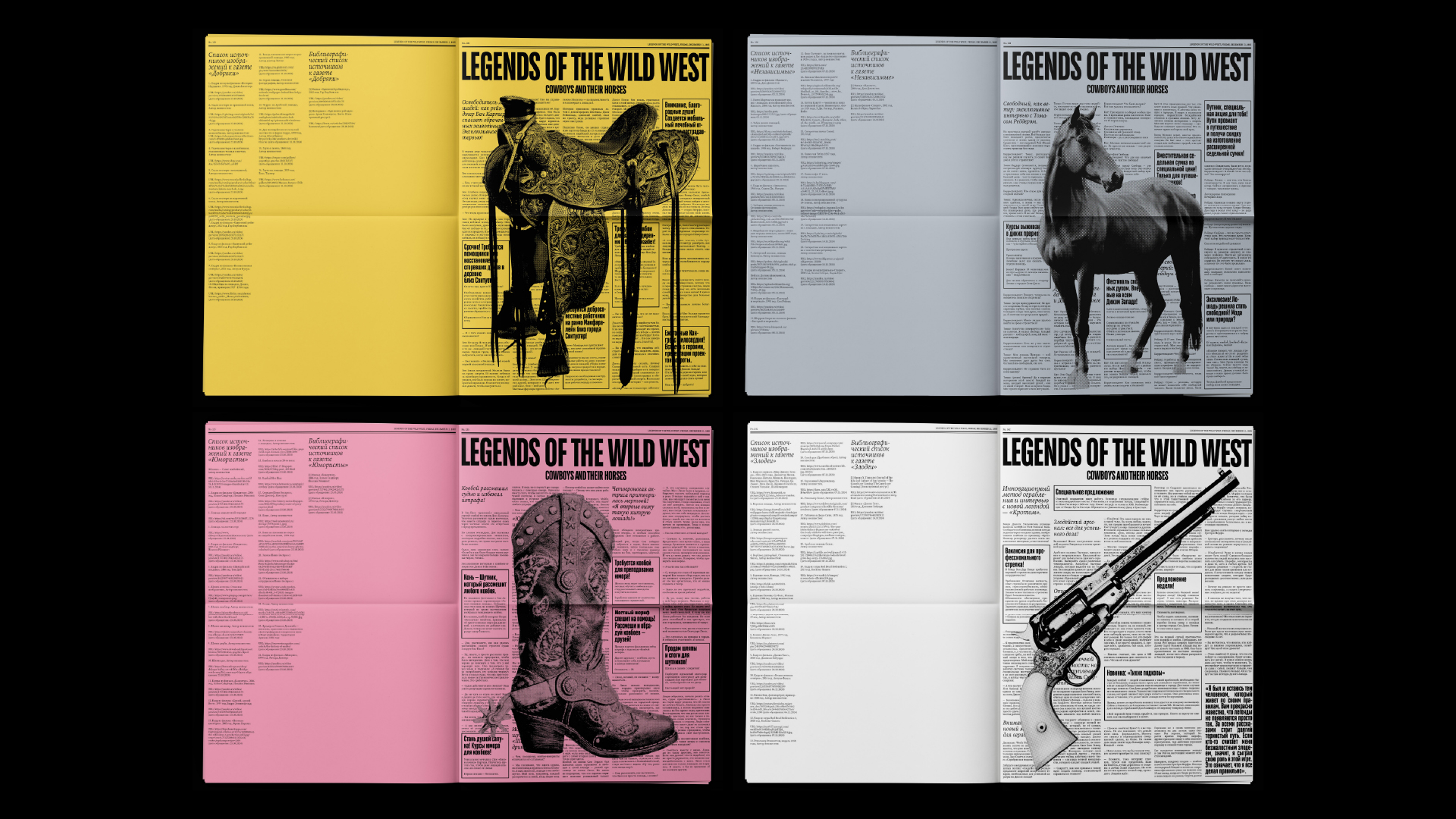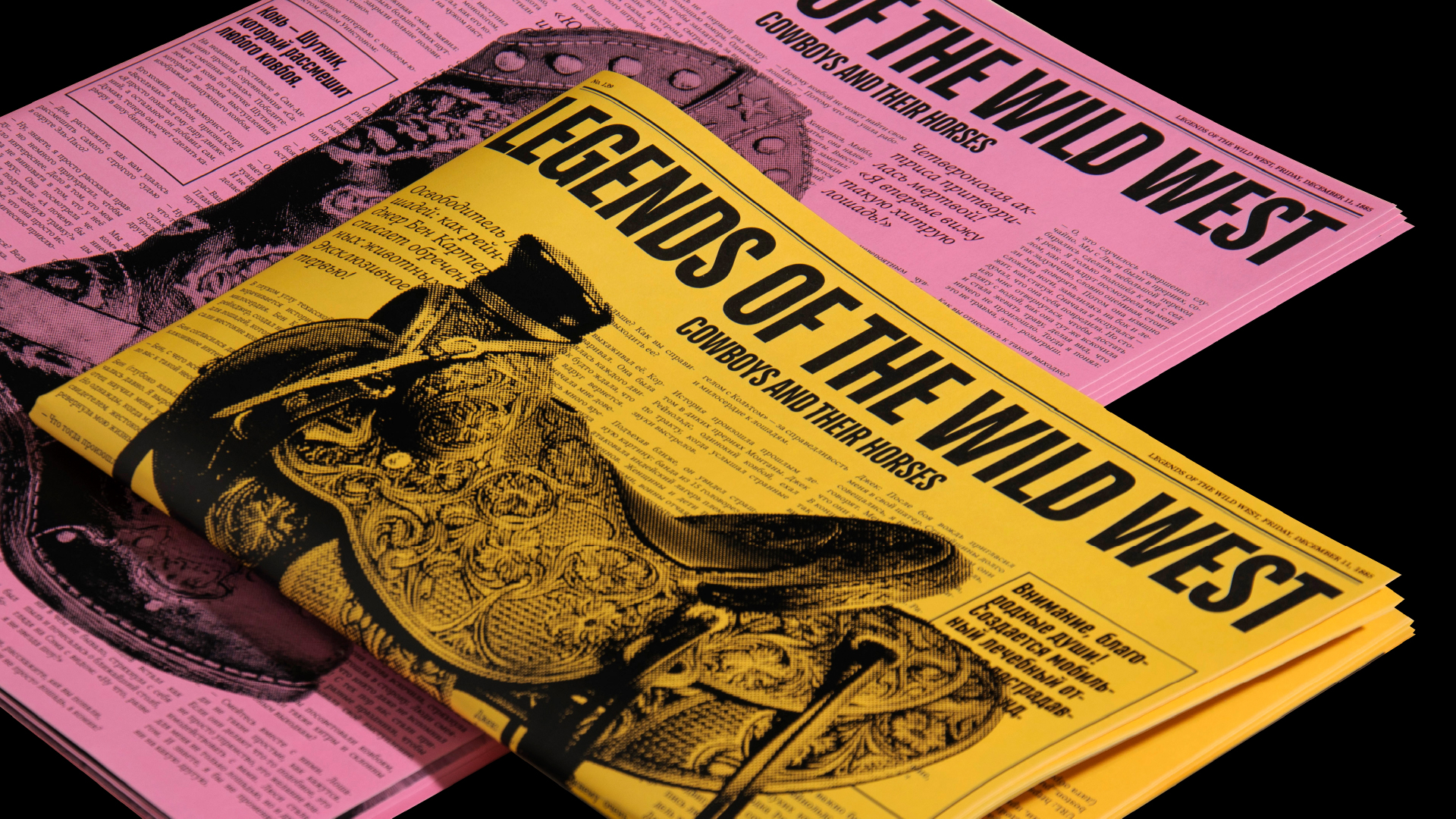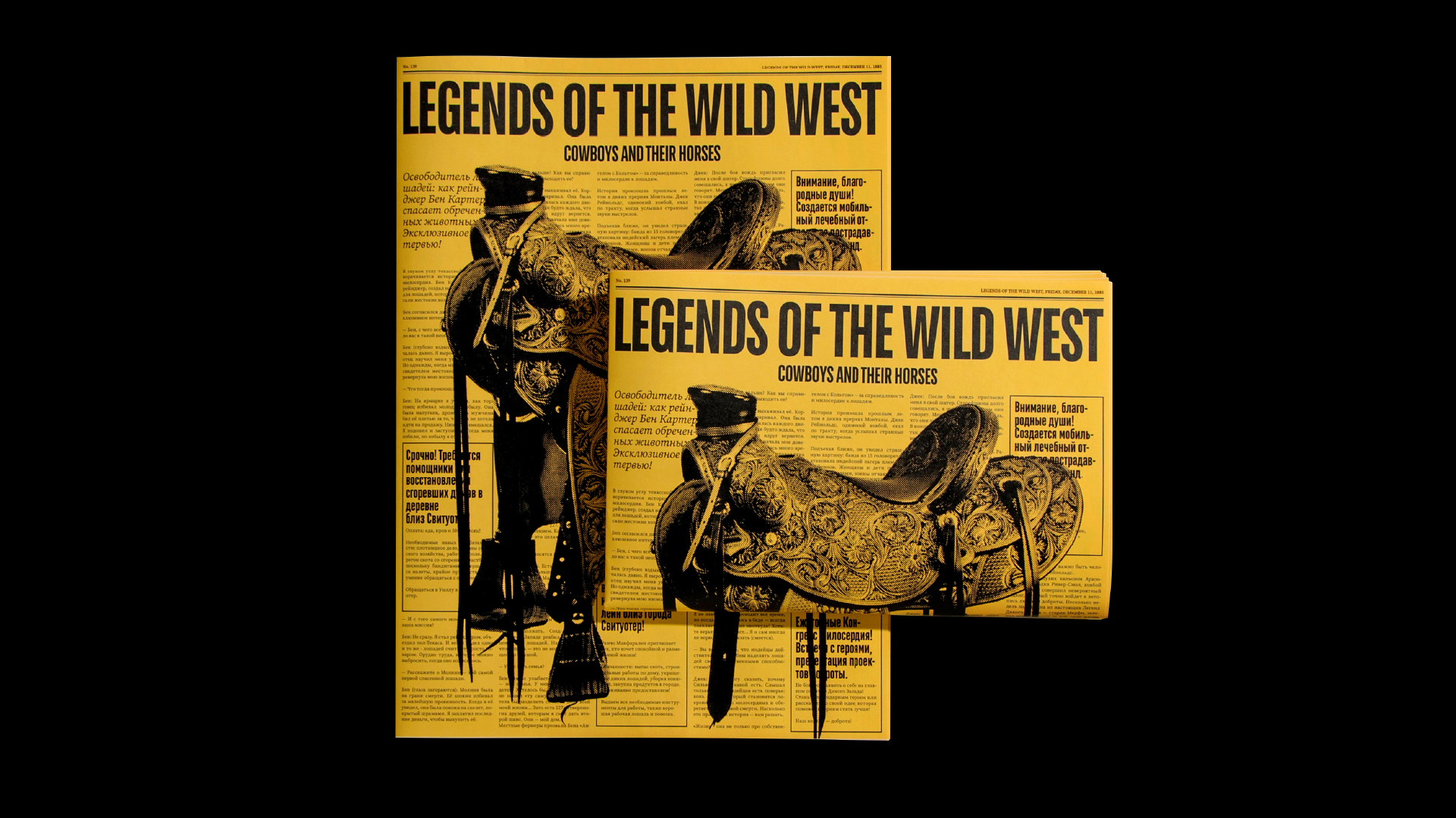 Проект «Легенды Дикого Запада: ковбои и их лошади» рассматривает характеры ковбоев и их лошадей через уникальные визуальные образы в кино, играх и сериалах. В качестве основы был выбран формат газеты конца 19-го века, поскольку в то время газета считалась основным источником информации.