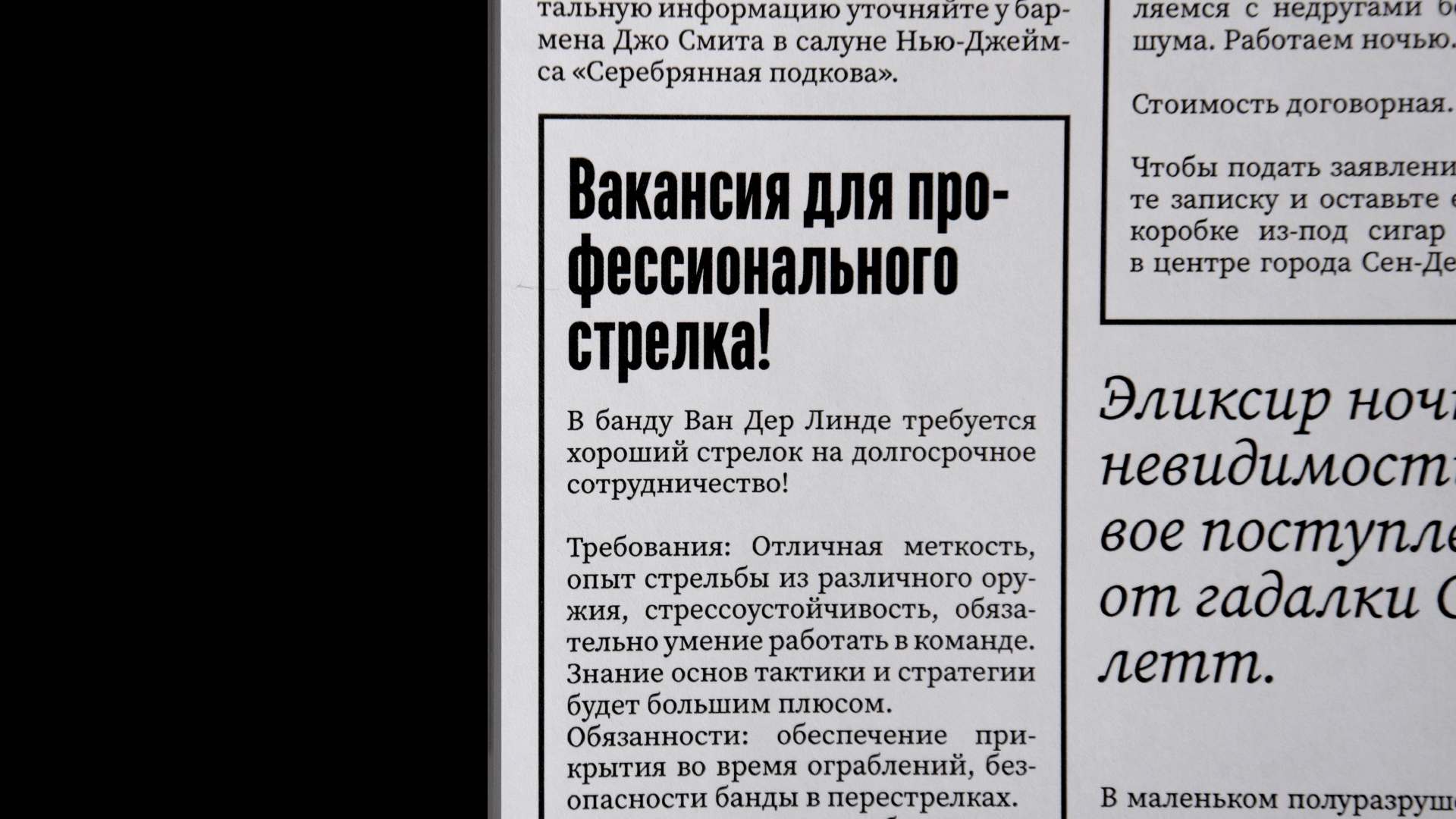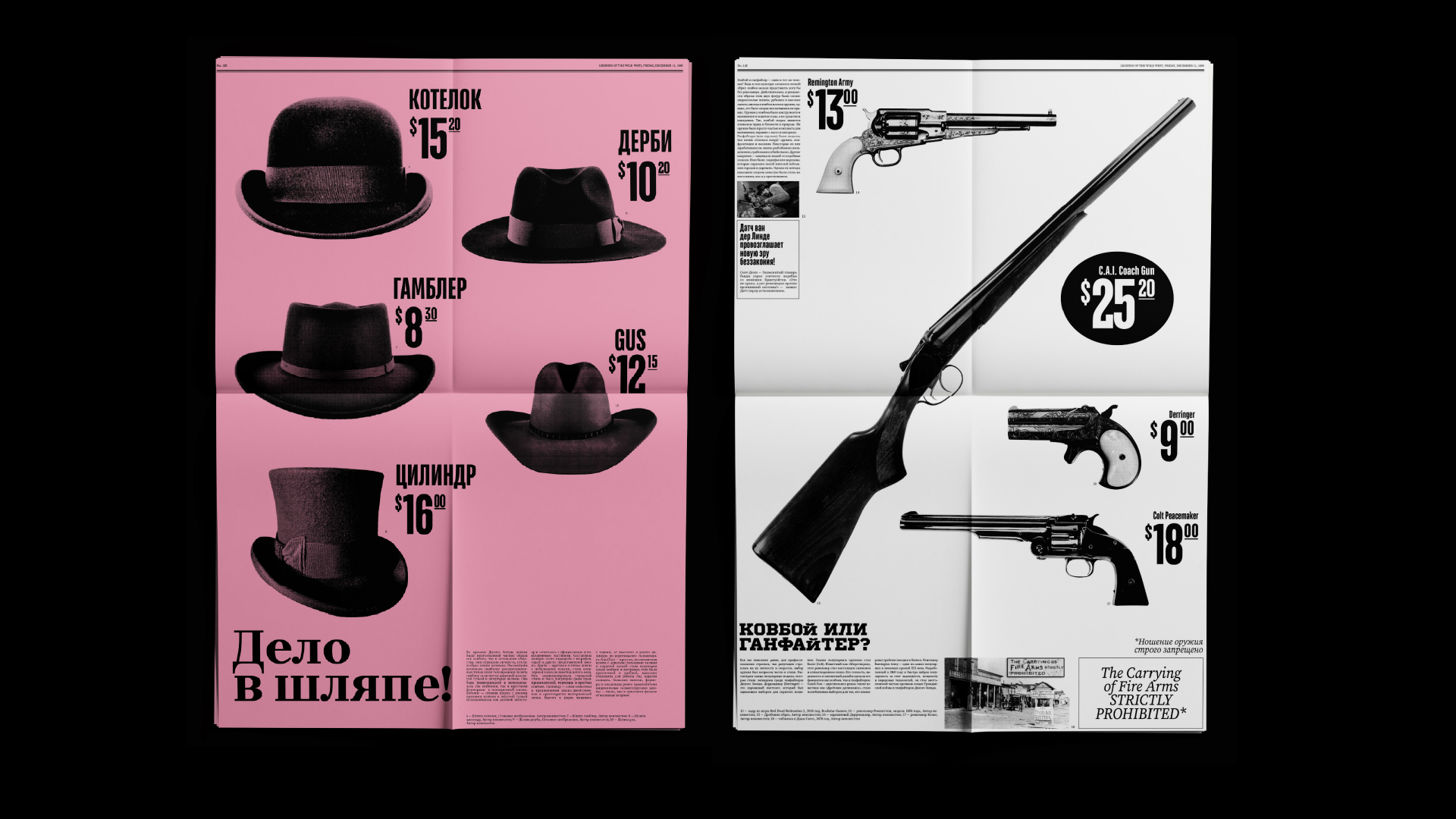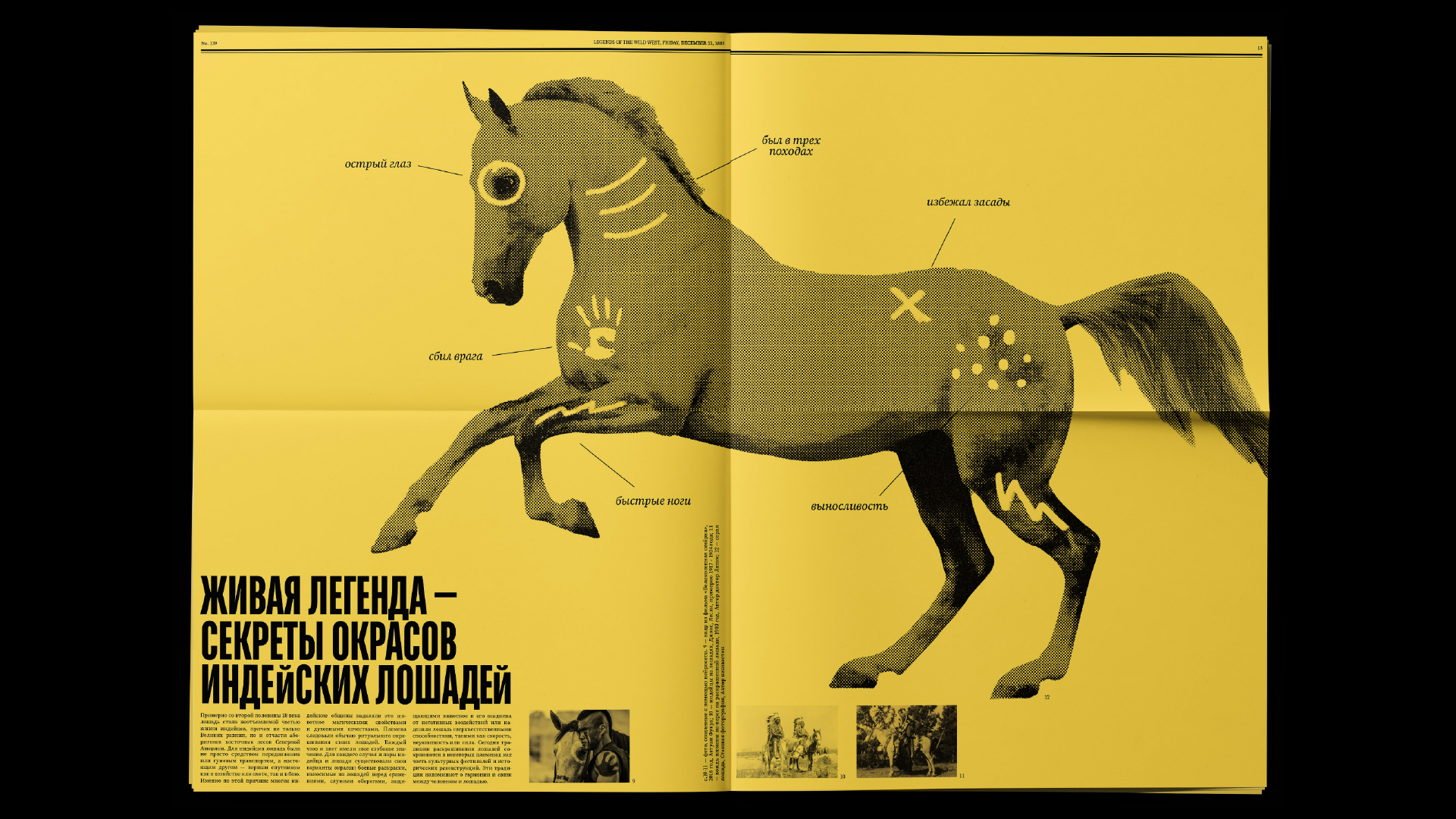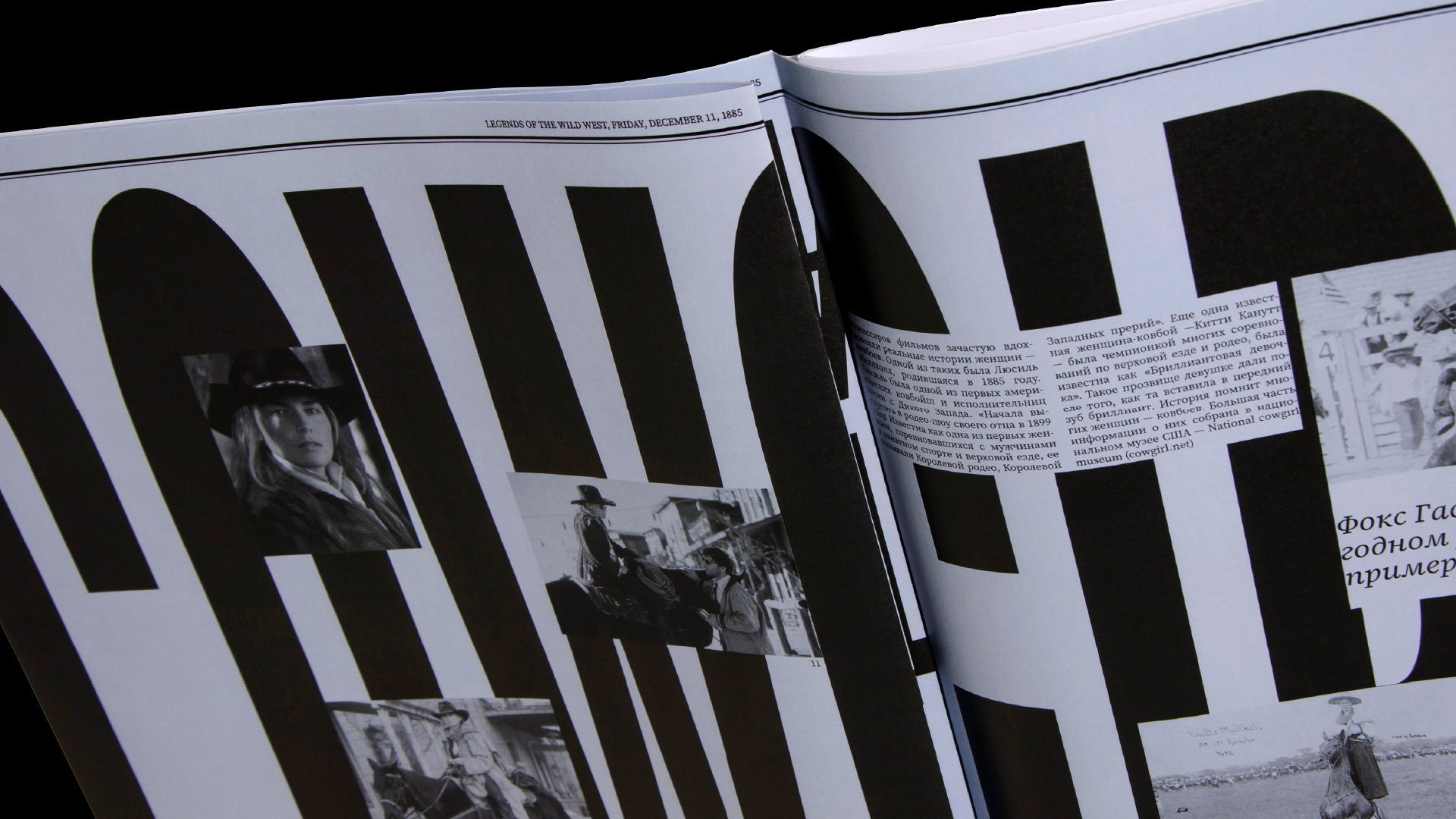 Проект «Легенды Дикого Запада: ковбои и их лошади» рассматривает характеры ковбоев и их лошадей через уникальные визуальные образы в кино, играх и сериалах. В качестве основы был выбран формат газеты конца 19-го века, поскольку в то время газета считалась основным источником информации.