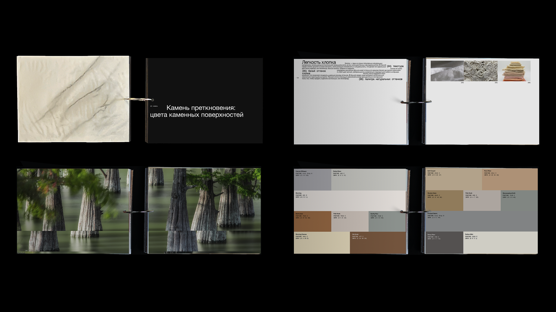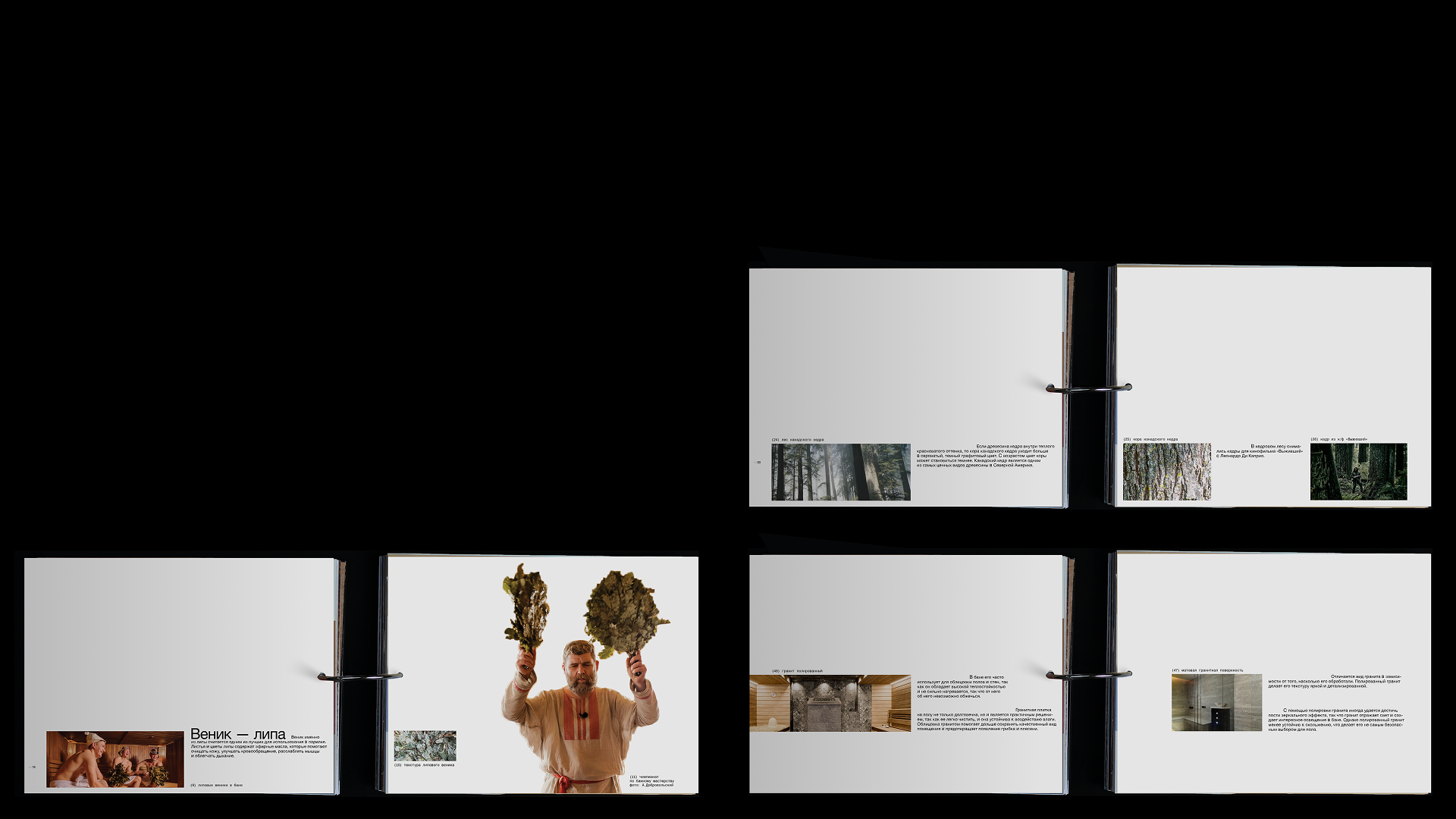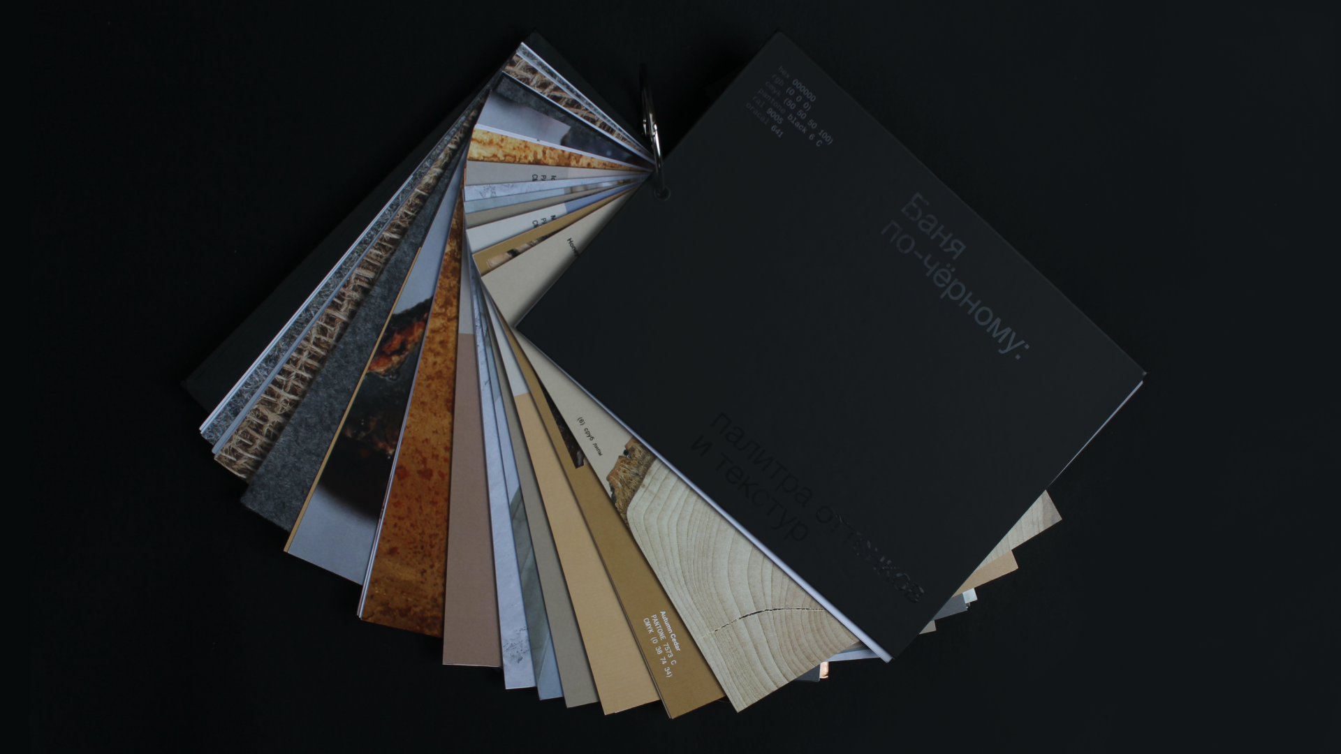 Книга «Баня по-чёрному: палитра оттенков и текстур» создана в формате визуального исследования, целью которого было проанализировать банные материалы с точки зрения цвета и текстур, собрать цветовую палитру распространенных оттенков.