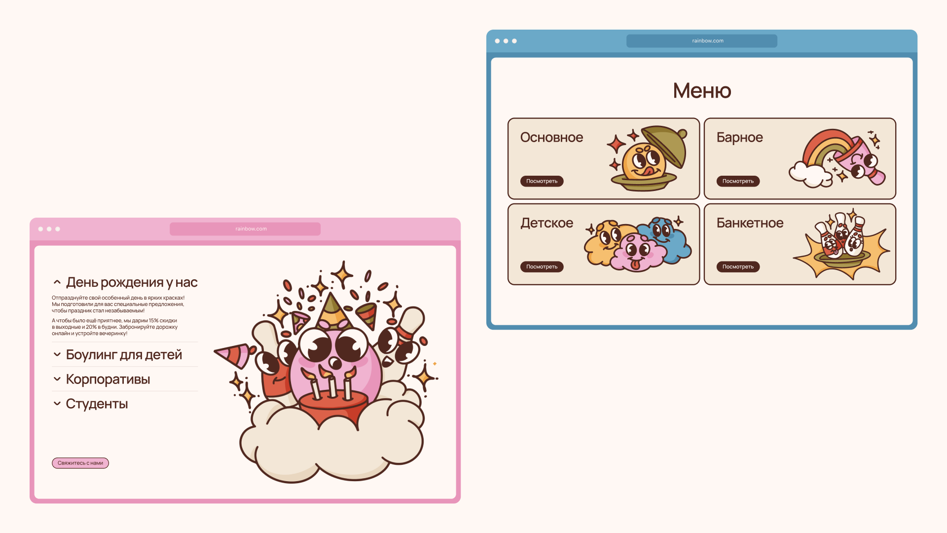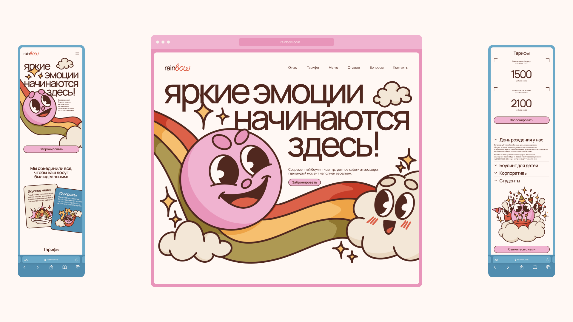 Разработать брендинг и лендинг для боулинг-клуба Rainbow. Основная цель — выделить компанию среди конкурентов и передать атмосферу радости и веселья, которую гости получают во время игры.