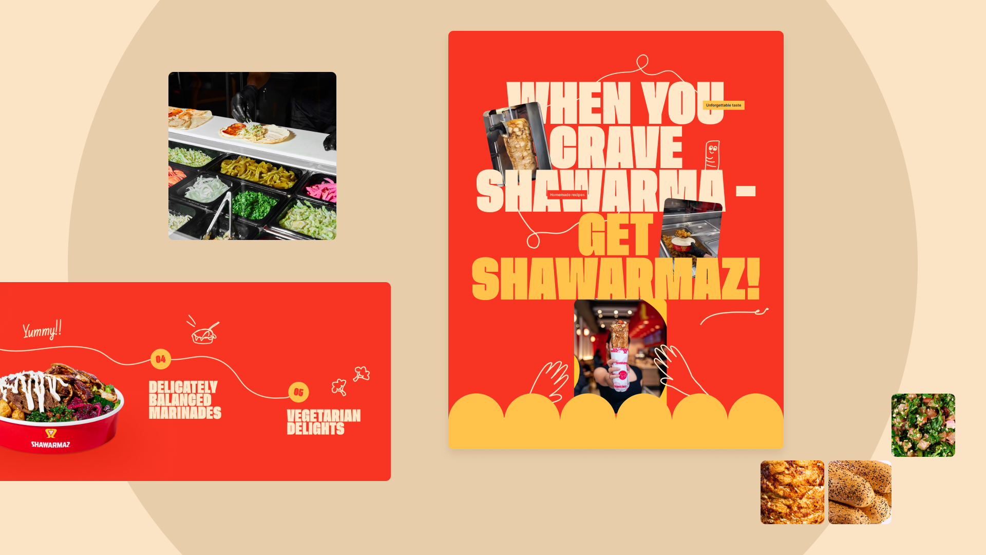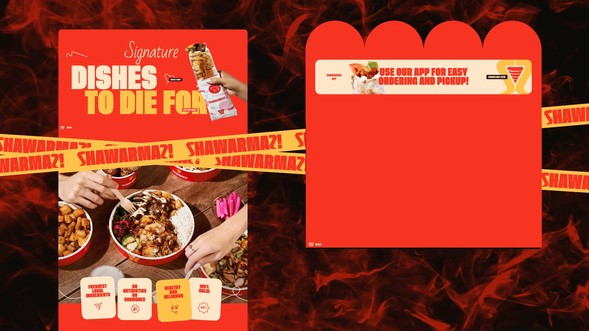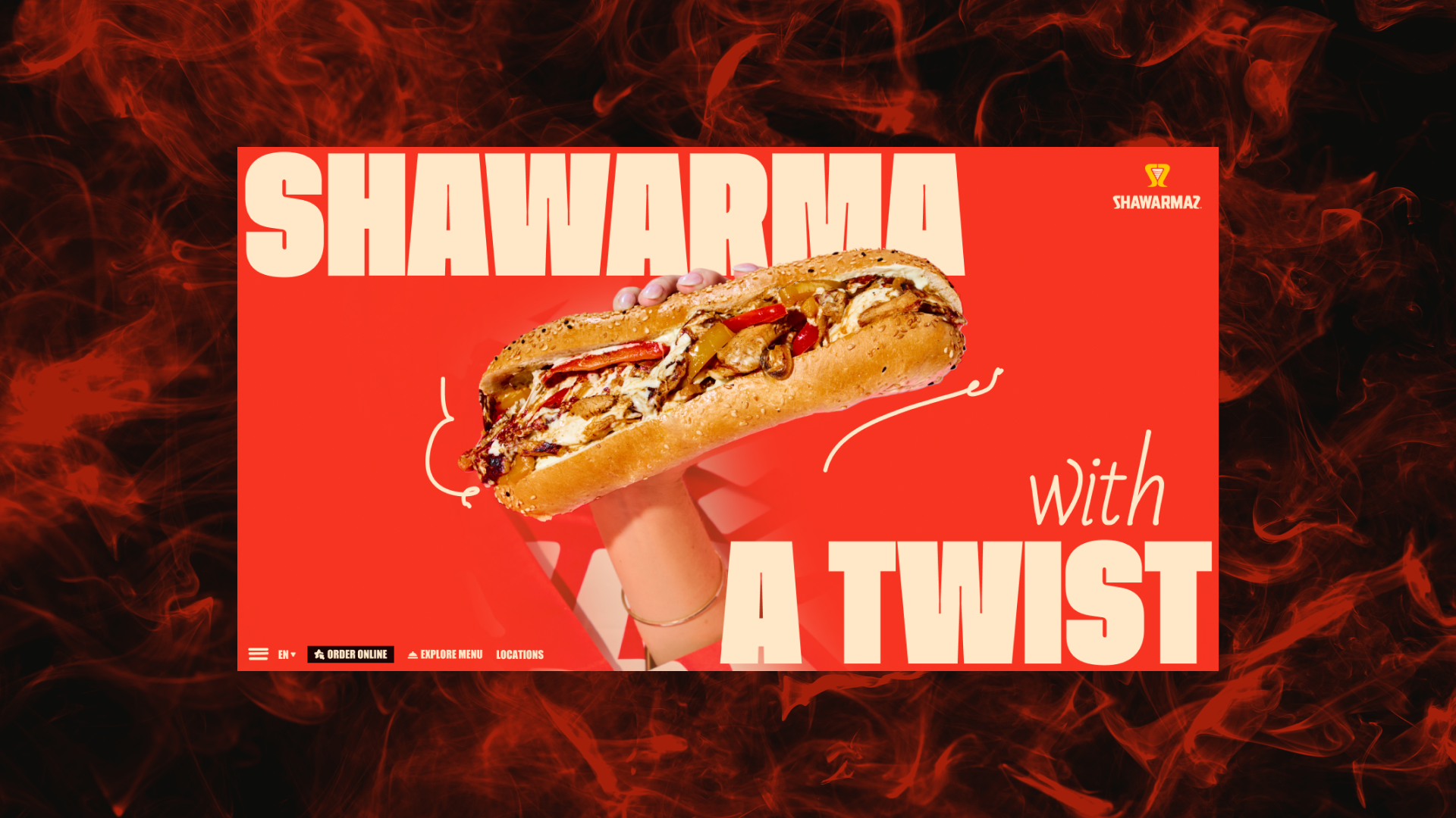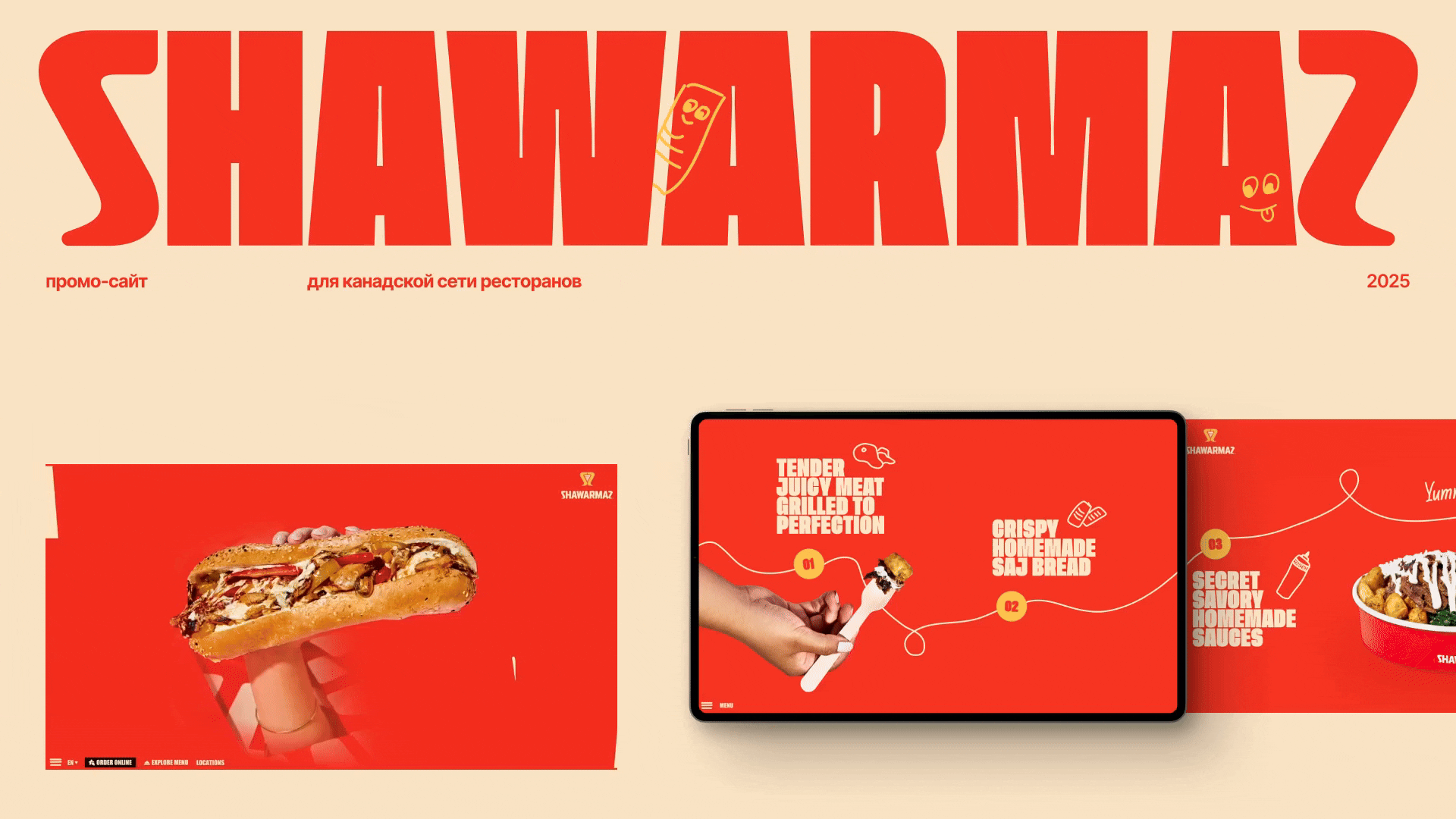 Для реализации клиент выбрал яркую, дерзкую концепцию с крупными шрифтами и насыщенными цветами, где все было выкручено на максимум и каждый экран выглядел как отдельный баннер. Центральным элементом, конечно же, стала сама шаурма.