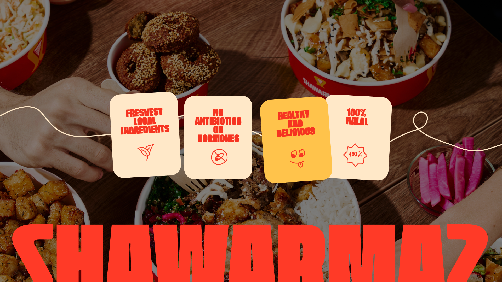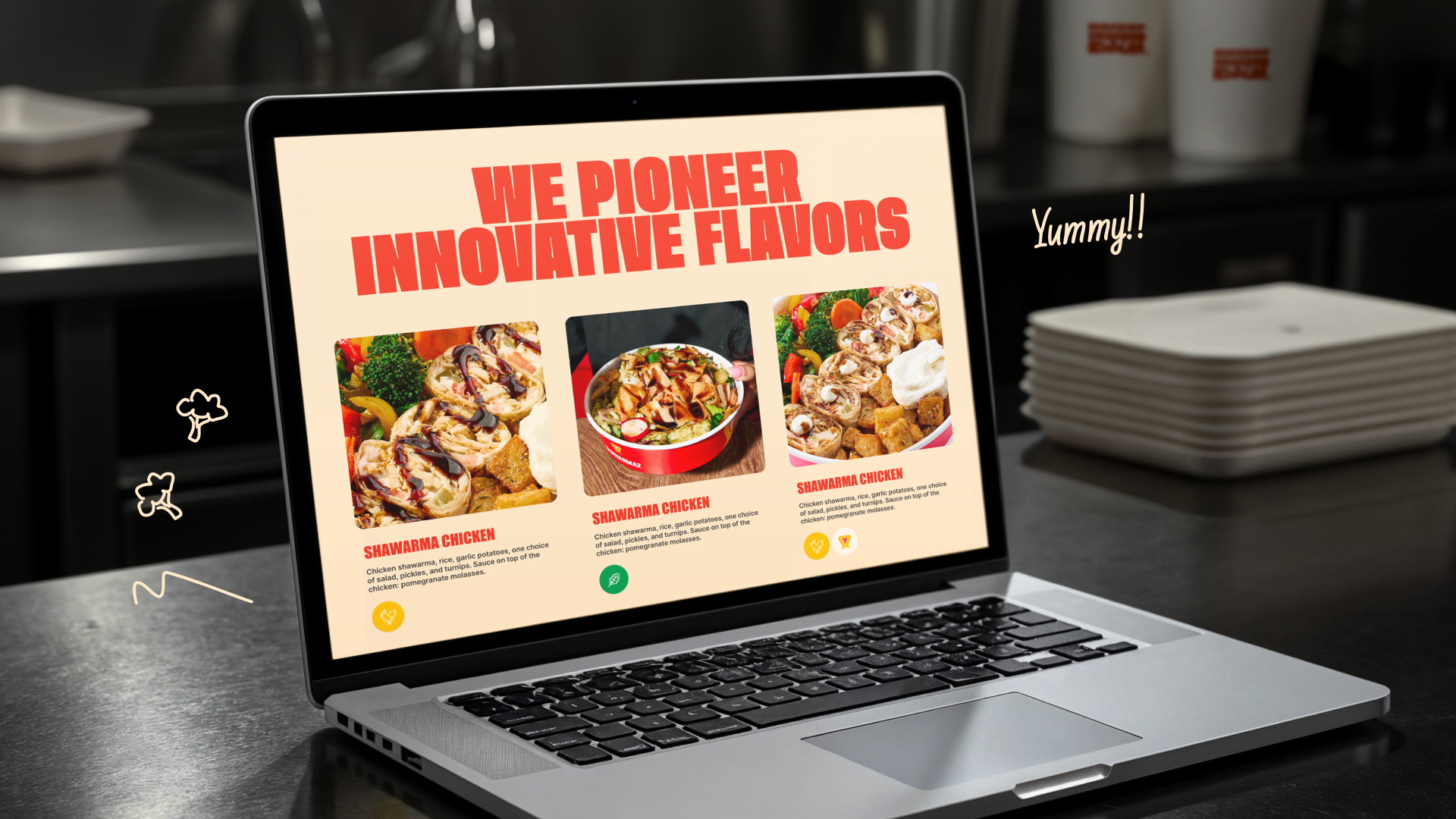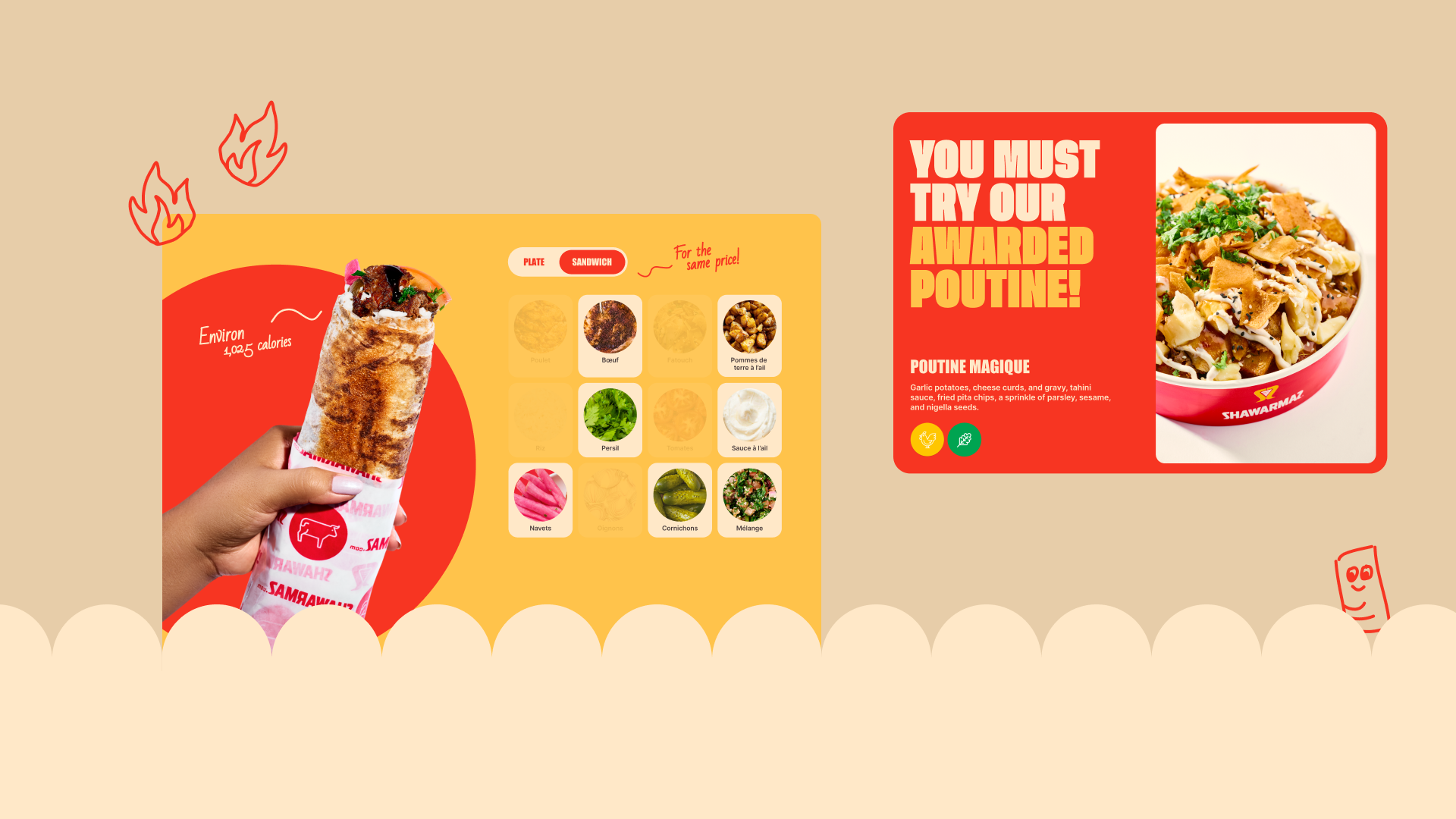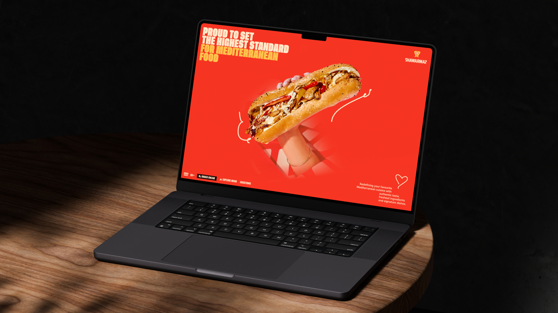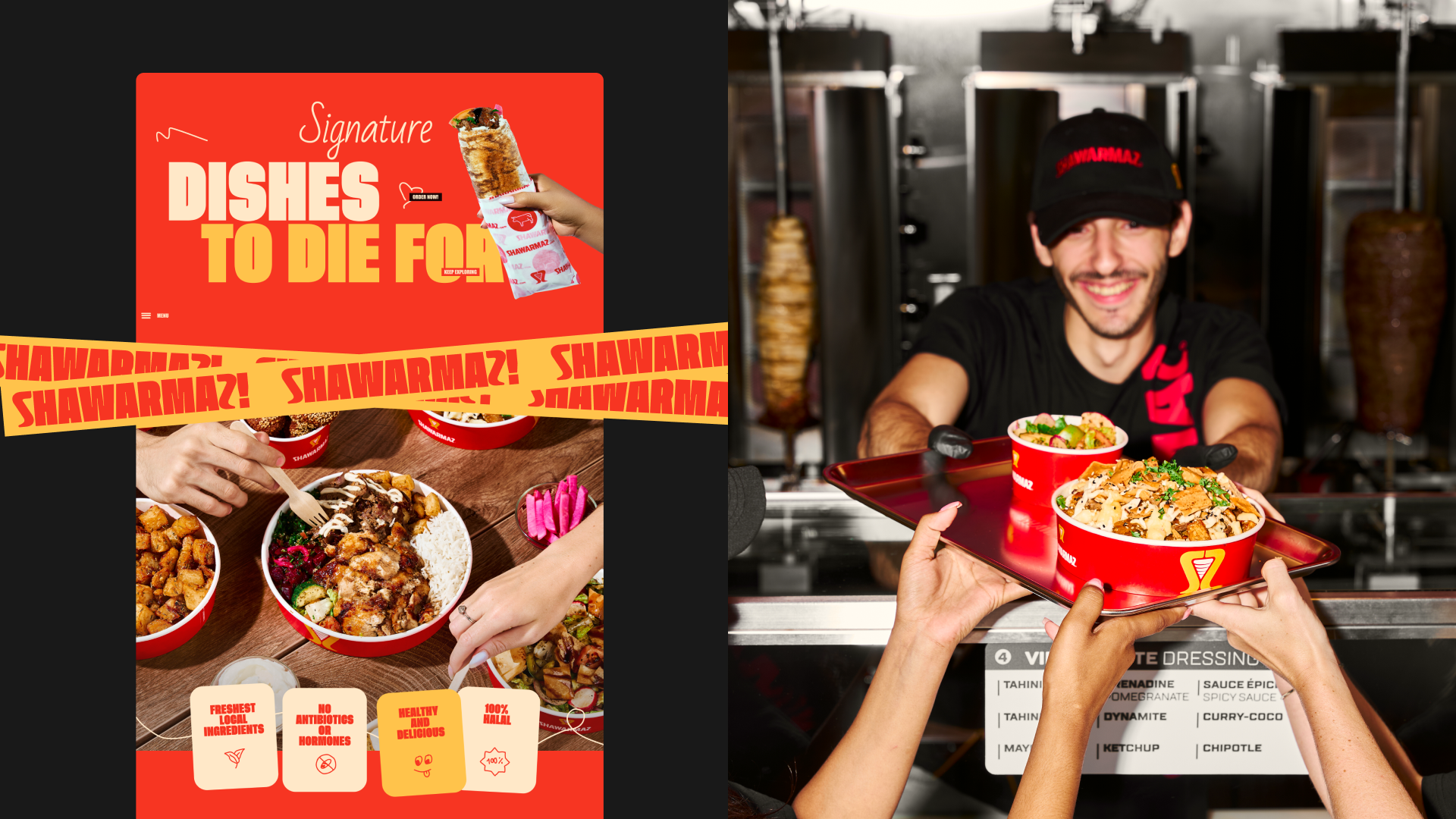 Для реализации клиент выбрал яркую, дерзкую концепцию с крупными шрифтами и насыщенными цветами, где все было выкручено на максимум и каждый экран выглядел как отдельный баннер. Центральным элементом, конечно же, стала сама шаурма.