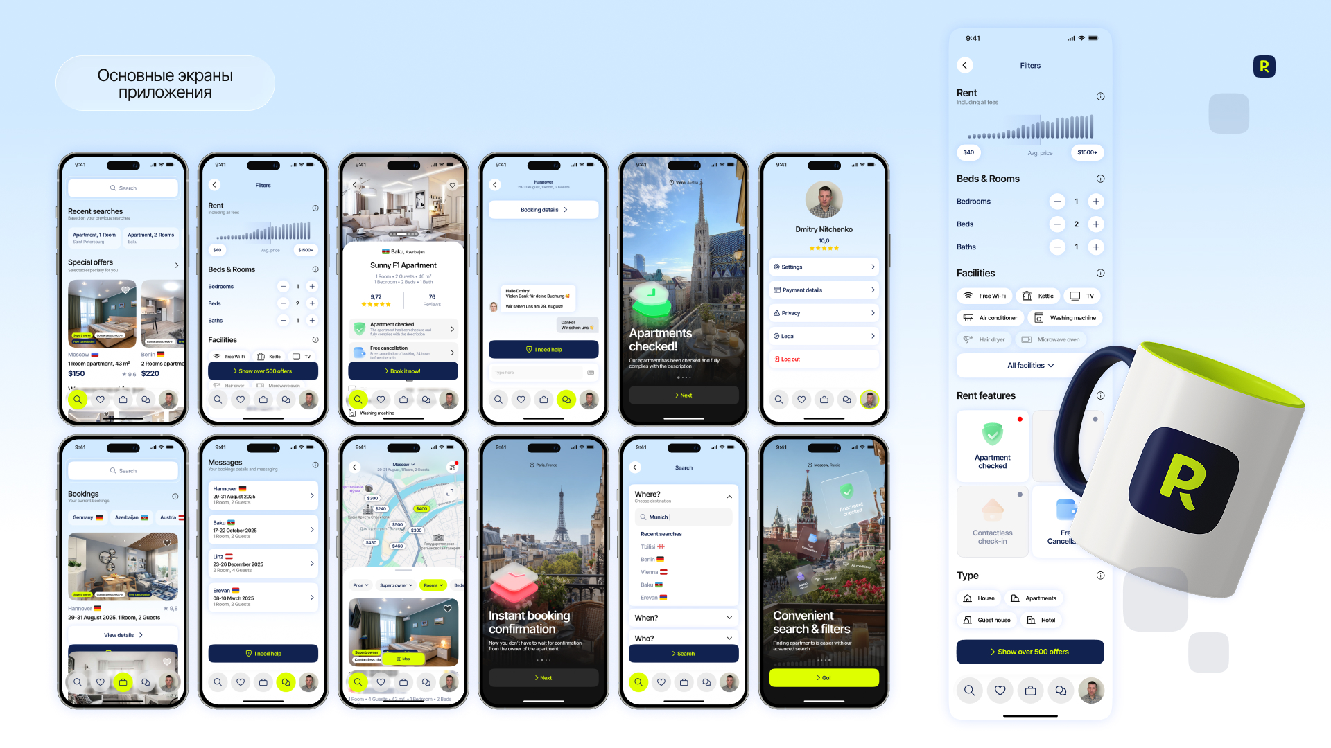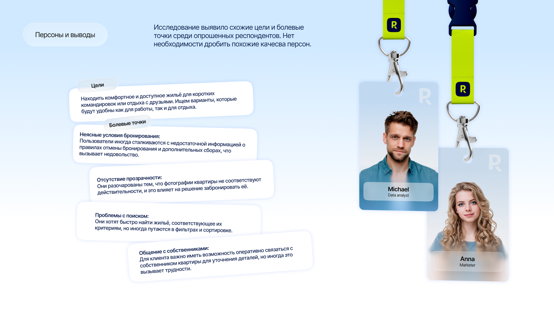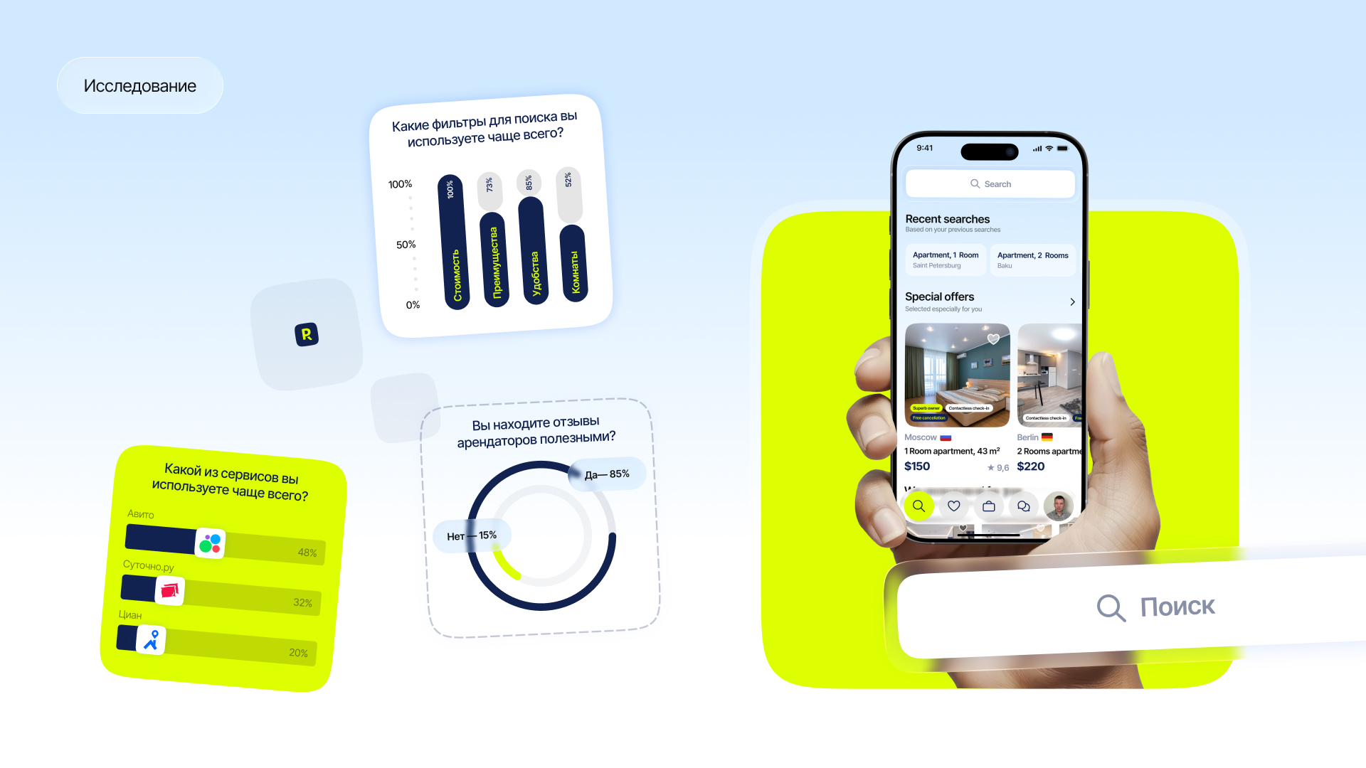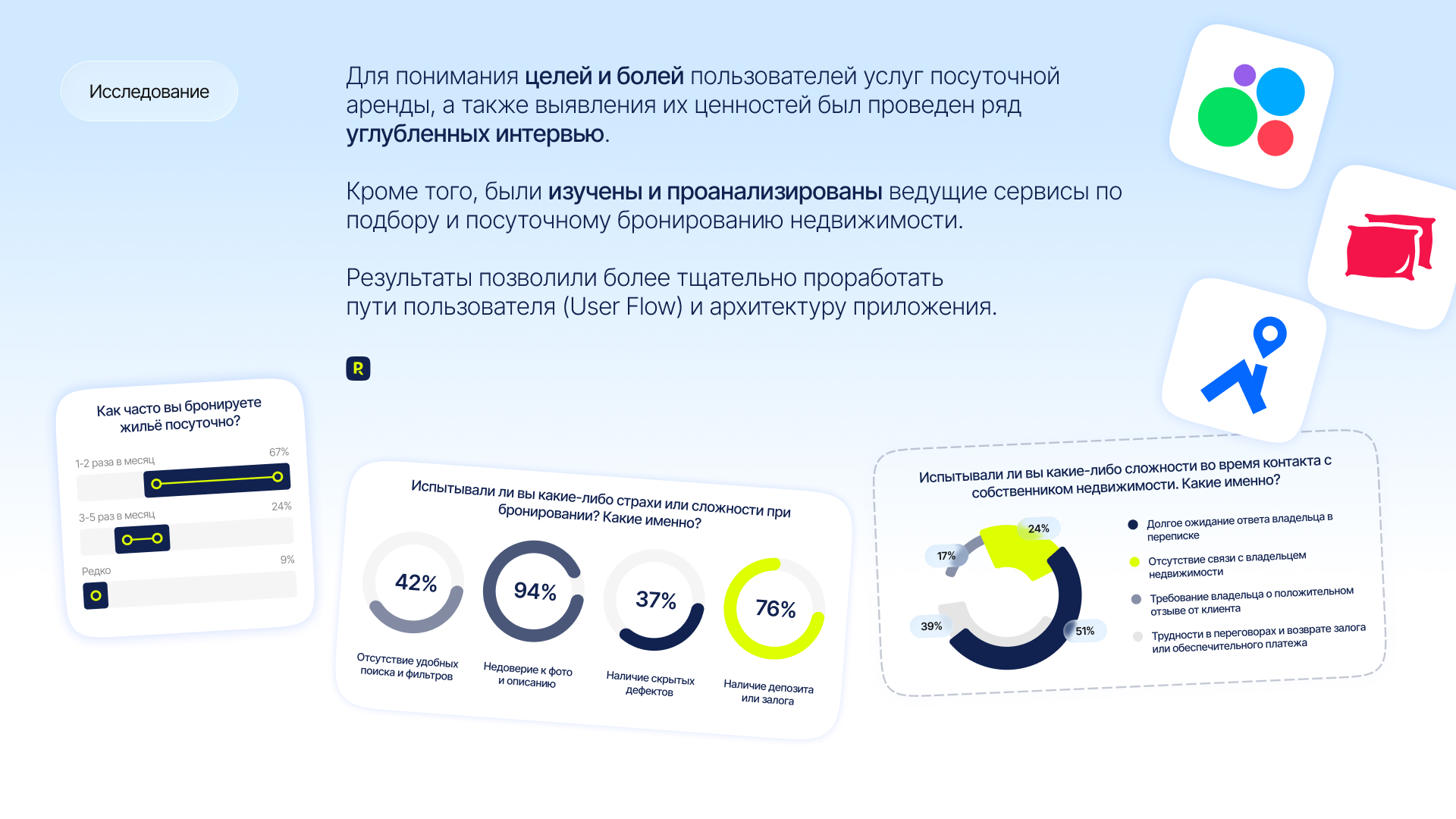 В основе Rooma лежат данные углубленных интервью пользователей популярных российских сервисов бронирования недвижимости и апартаментов, а также анализ действующих сервисов, которые объединены в большое UX-исследование для понимания целей и болей пользователей.