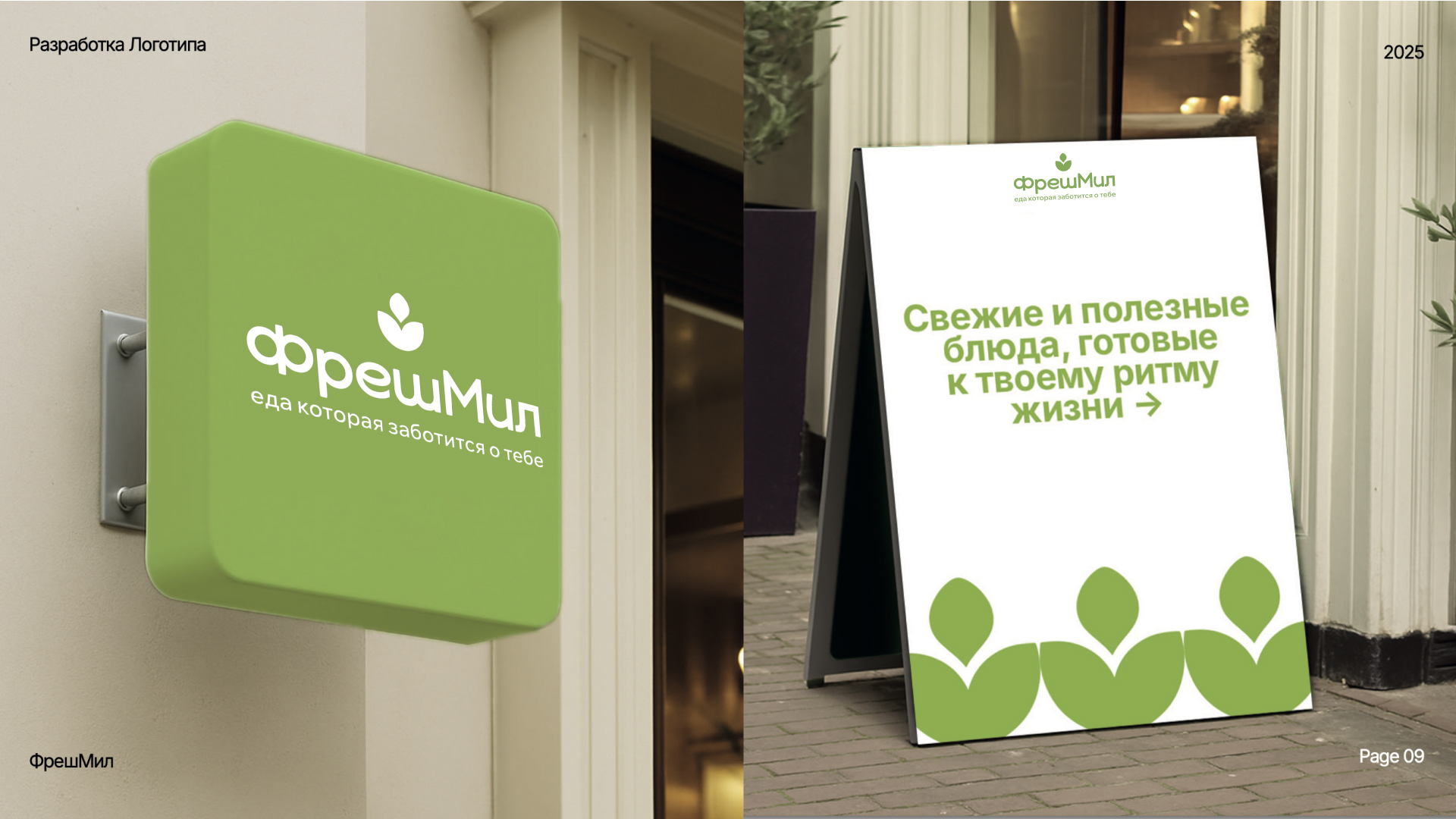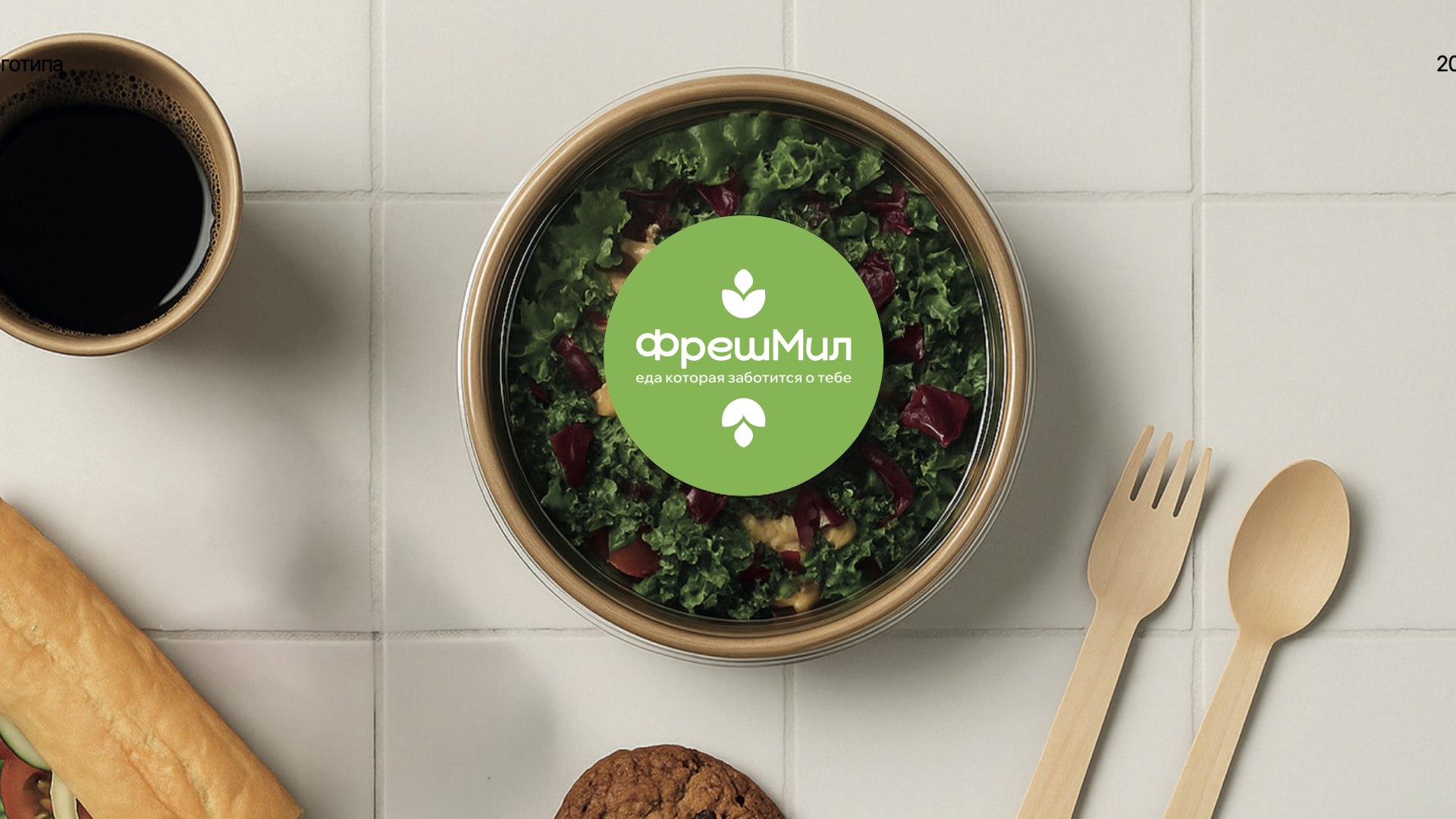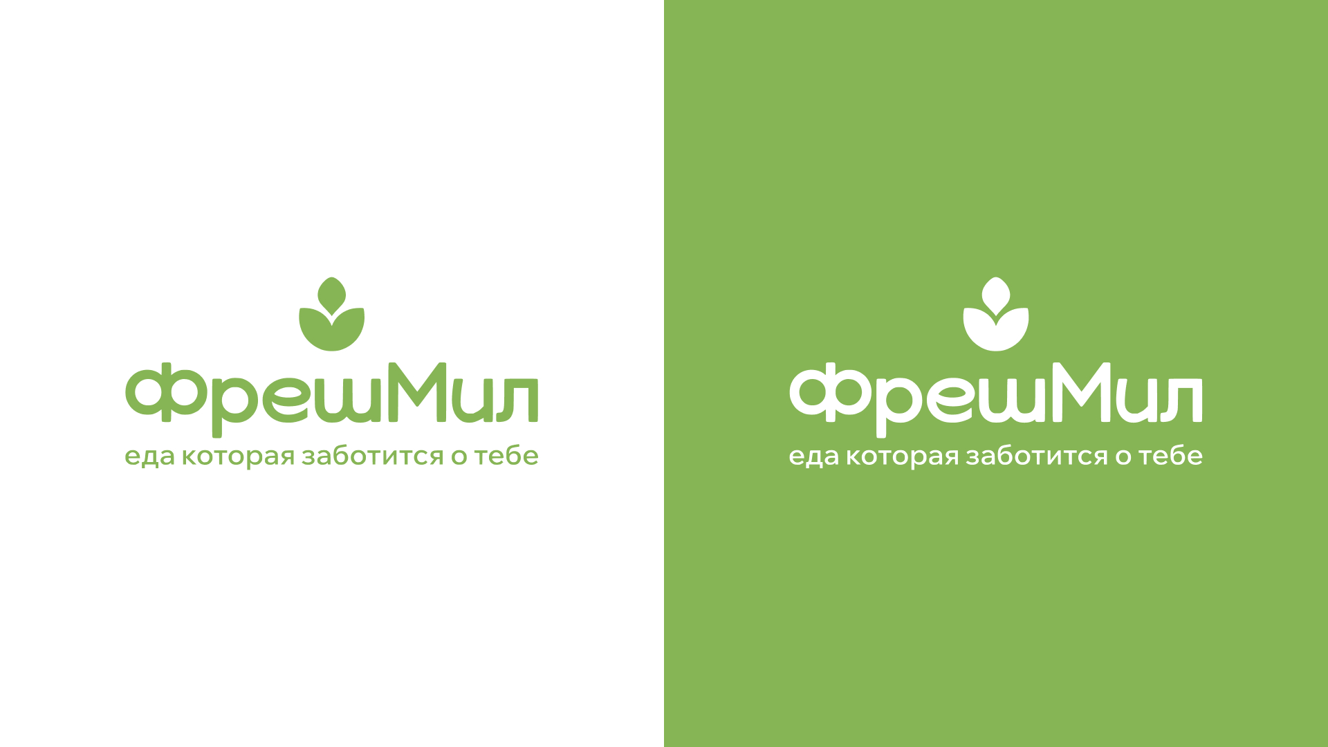 Перед нами стояла задача разработать айдентику для магазина готовой еды Фрешмил. Пожеланием заказчика было использовать зеленый цвет и сделать логотип современным, понятным и минималистичным, чтобы визуальный стиль бренда сразу считывался.