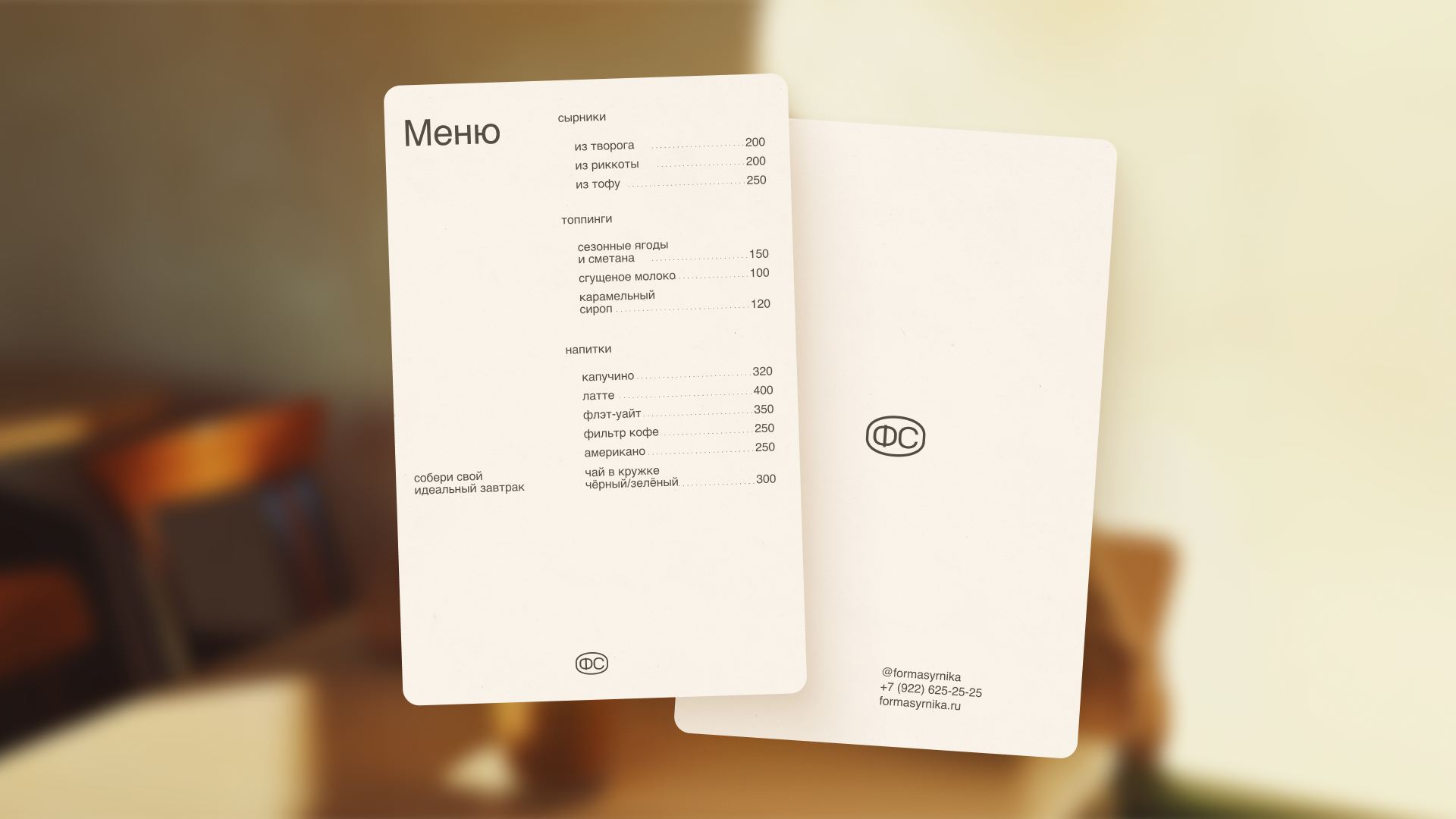 Фирменный стиль основан на форме сырника — идеально ровном круге. Таким же идеальным, как и сырники в этом заведении. Для поддержки концепции чёткости и перфекционизма вёрстка типографики располагается строго по центральной оси.