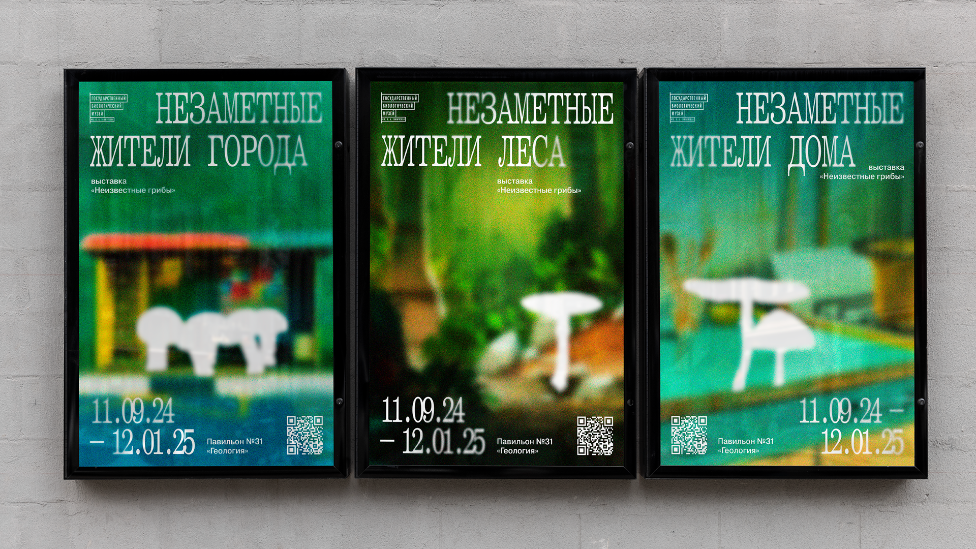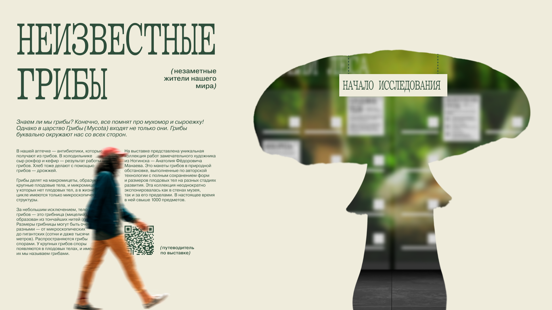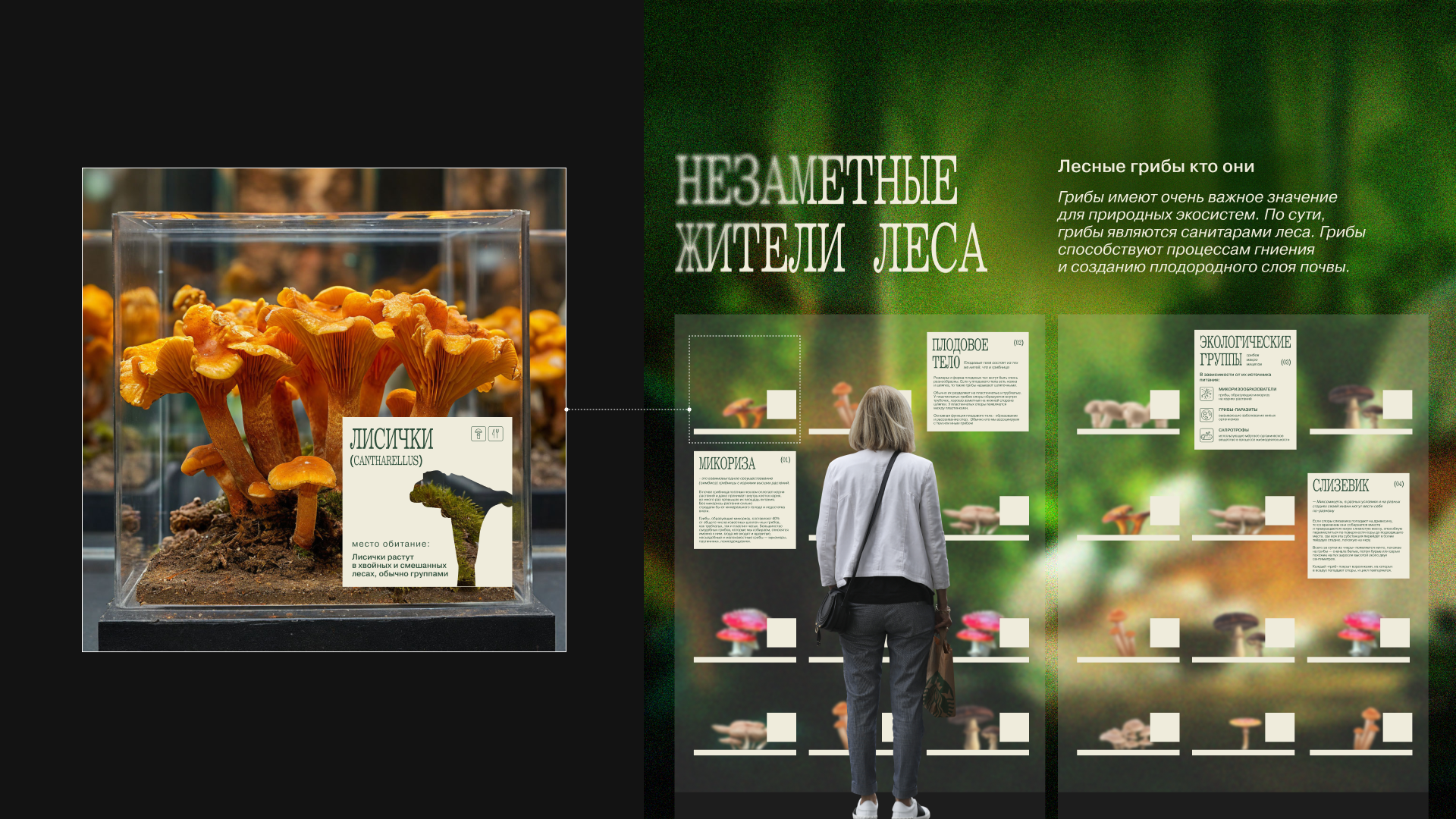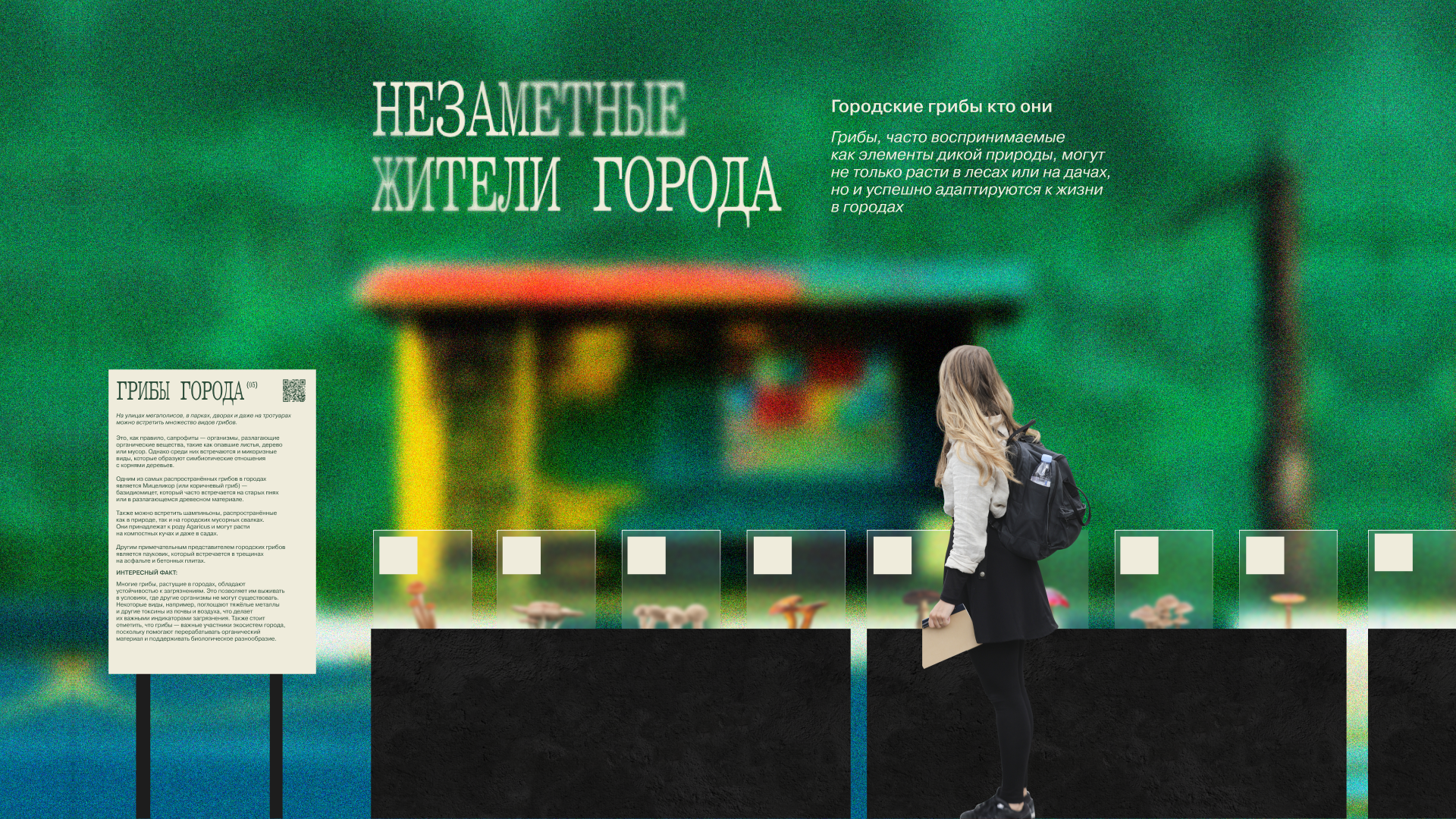 Цель выставки — подсветить представителей флоры, которых мы не замечаем, и подробнее познакомить с устройством тех, кого знаем хорошо. Поэтому в качестве основного графического приема был выбран скрытый силуэт гриба. Этот прием символизирует пробел в области знаний окружающего мира и призывает посетить выставку, чтобы заполнить эту пустоту. Грибы обитают повсюду, поэтому в качестве слогана были выбраны фразы «незаметные жители…». Пространство выставки разделено на три части: «лес», «город», «дом».