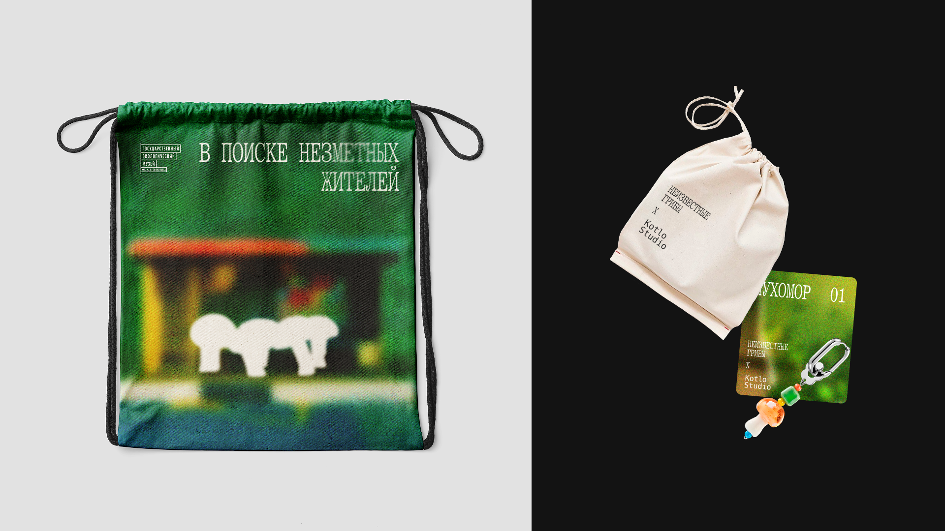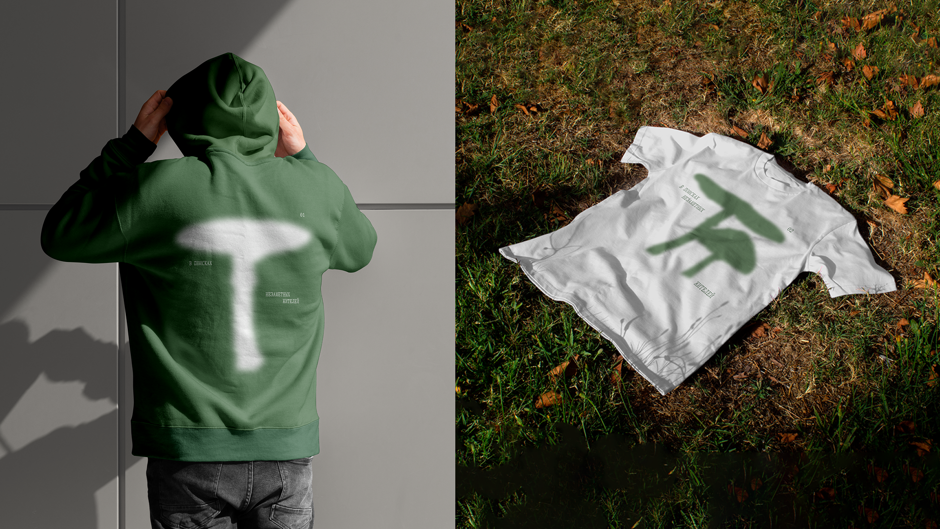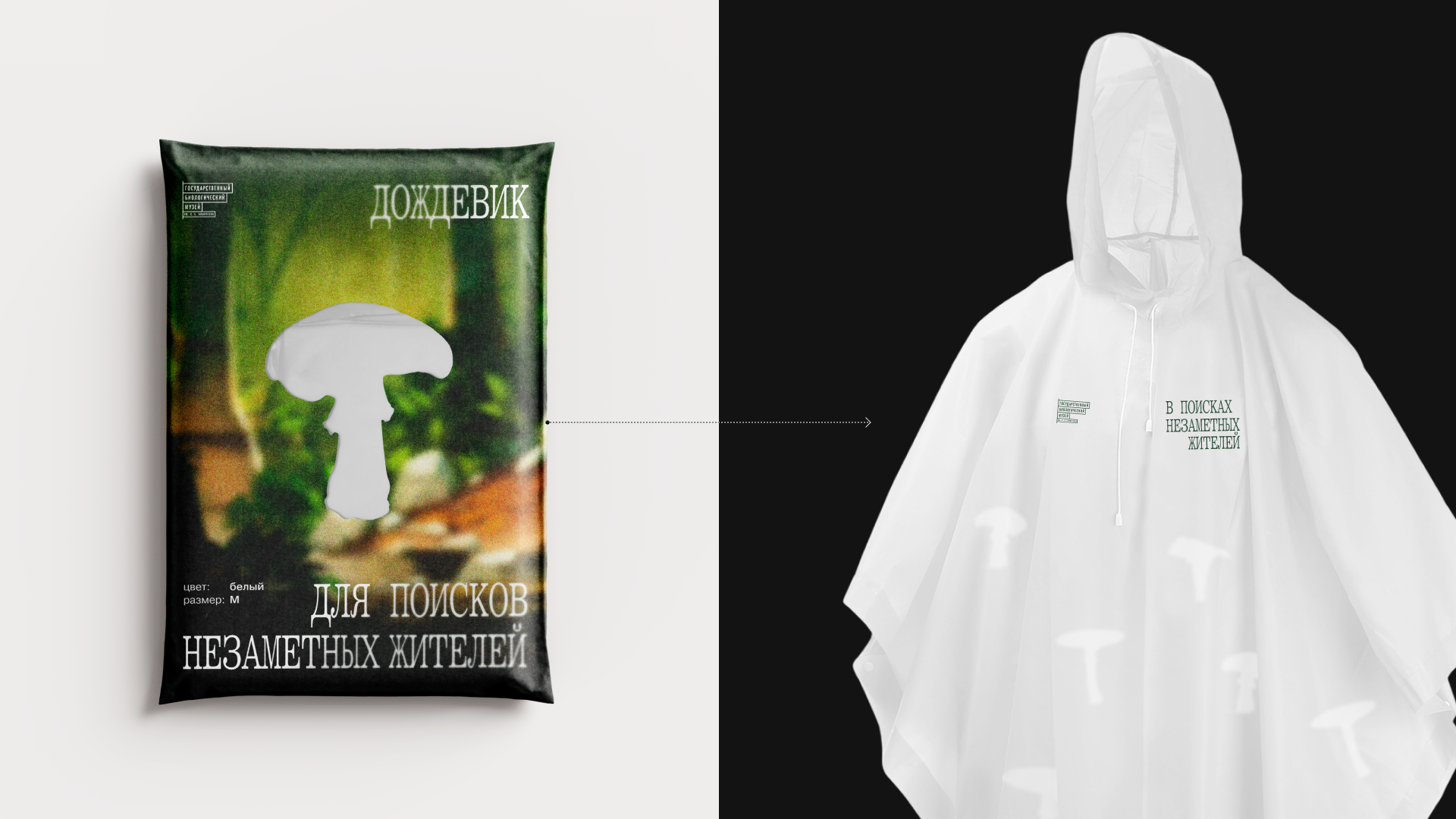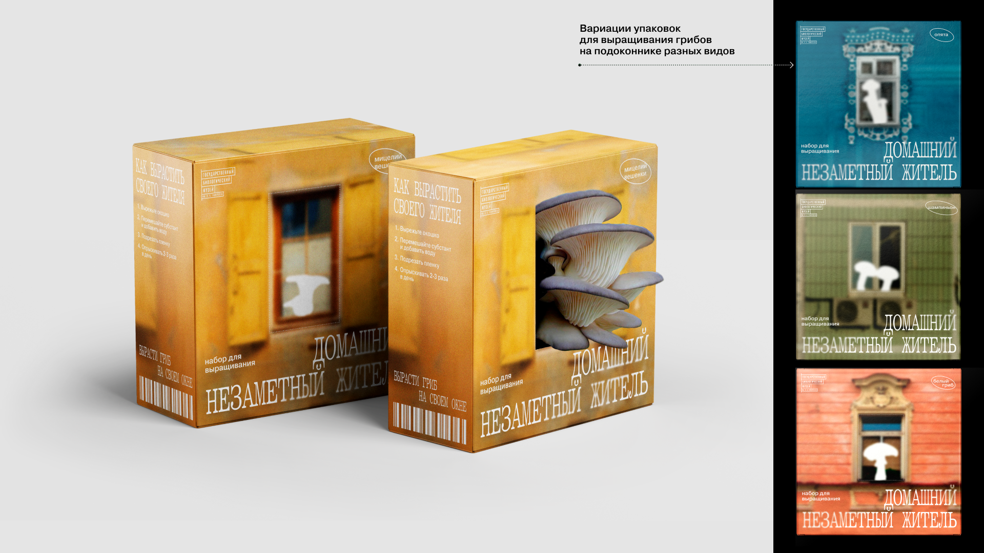Цель выставки — подсветить представителей флоры, которых мы не замечаем, и подробнее познакомить с устройством тех, кого знаем хорошо. Поэтому в качестве основного графического приема был выбран скрытый силуэт гриба. Этот прием символизирует пробел в области знаний окружающего мира и призывает посетить выставку, чтобы заполнить эту пустоту. Грибы обитают повсюду, поэтому в качестве слогана были выбраны фразы «незаметные жители…». Пространство выставки разделено на три части: «лес», «город», «дом».