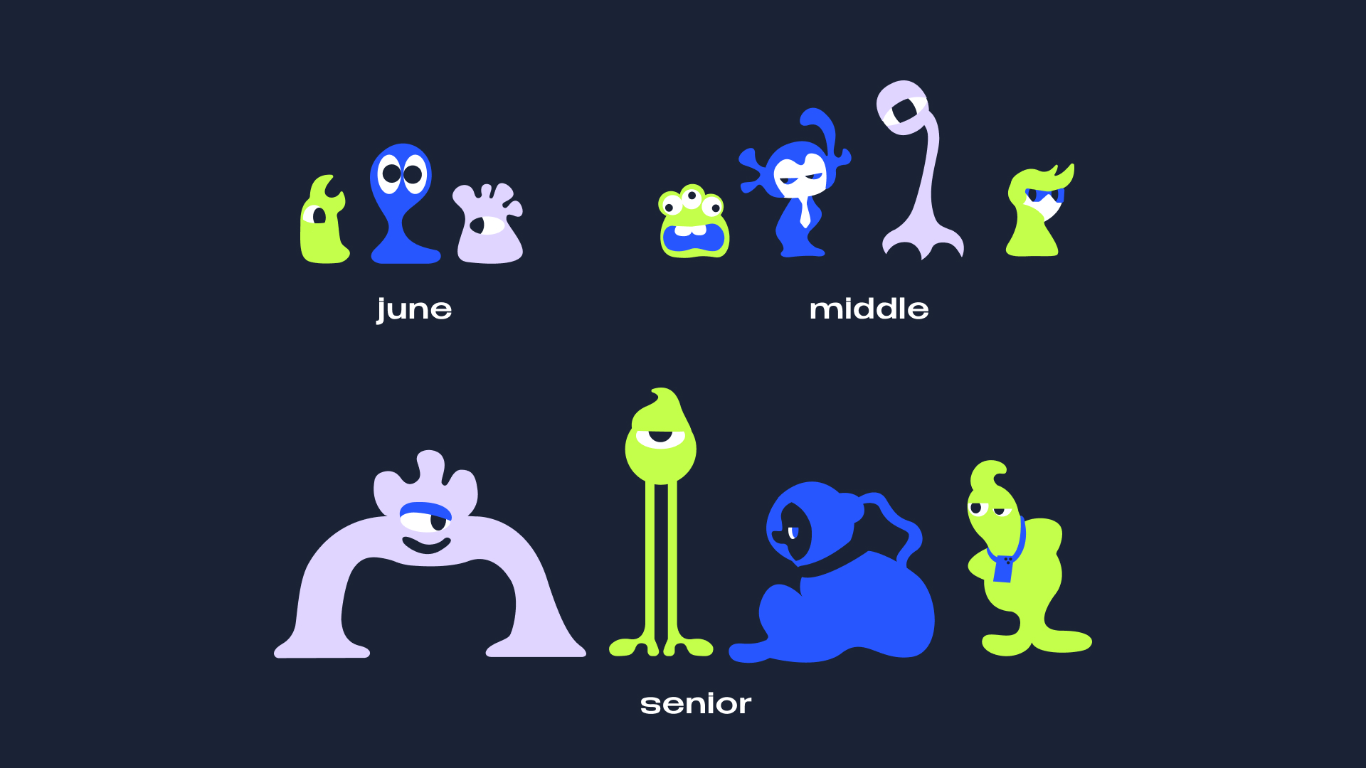 Иллюстрация персонажей — это язык коммуникации с ЦА. Как и в IT сфере, герои делятся на уровни квалификации сотрудников в компании: джун, мидл и сеньор.