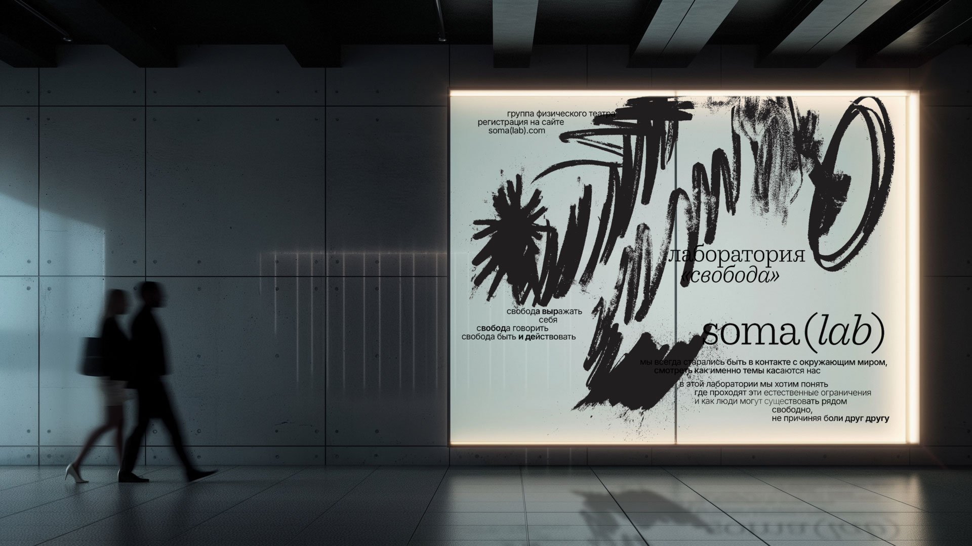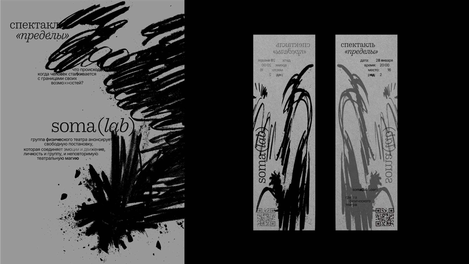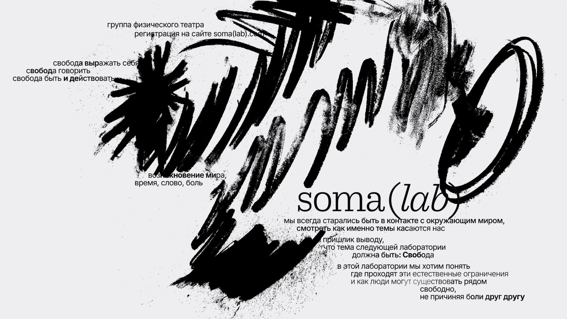 Идея проекта — единение. Я организовала открытое мероприятие, собрав людей. Главным графическим элементом стали угольные рисунки, созданные участниками. Уголь может быть мягким, твёрдым, блеклым или ярким. За каждой линией проступает история — проект оживает и меняется вместе с участниками. «Soma» переводится как тело, живая чувствующая система. «Lab» — это пространство исследования и поиска.