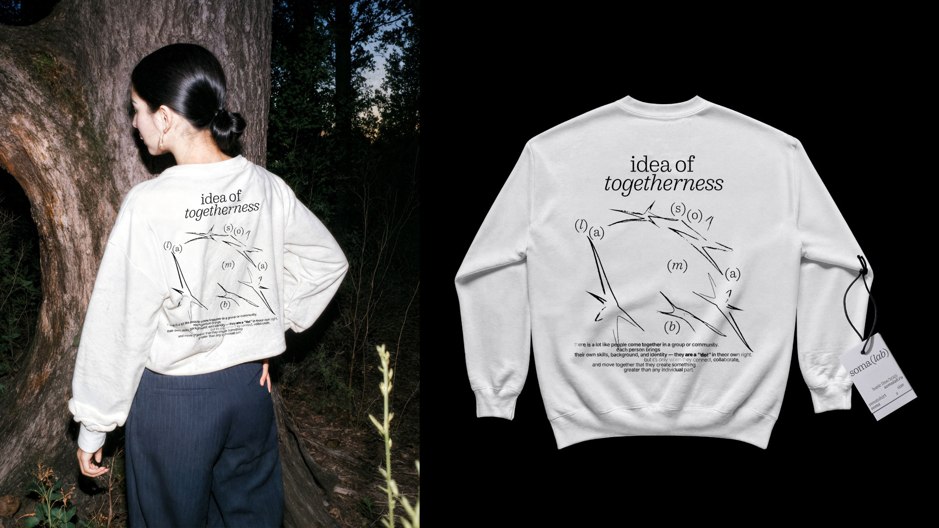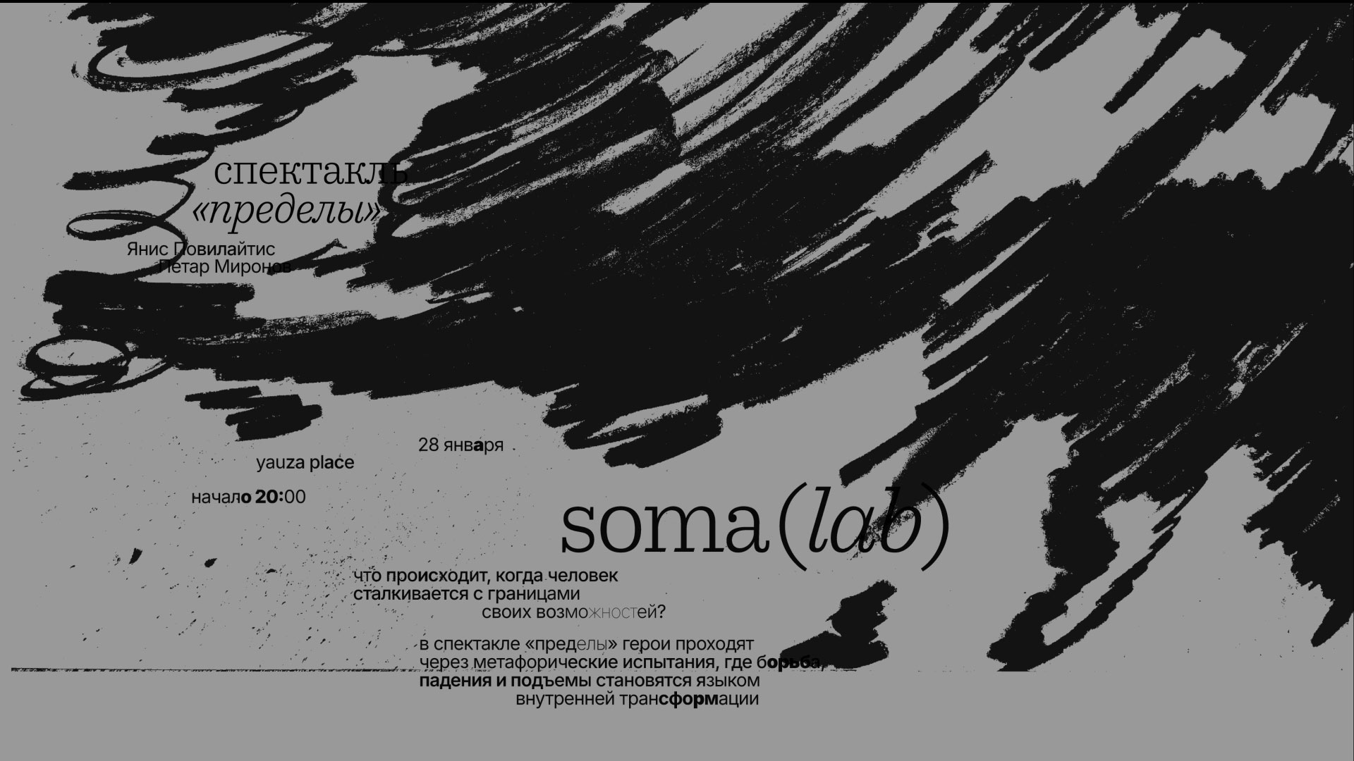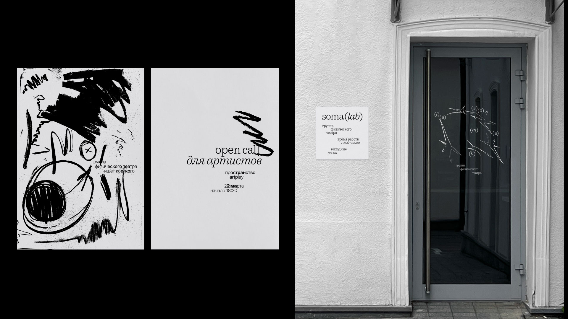 Идея проекта — единение. Я организовала открытое мероприятие, собрав людей. Главным графическим элементом стали угольные рисунки, созданные участниками. Уголь может быть мягким, твёрдым, блеклым или ярким. За каждой линией проступает история — проект оживает и меняется вместе с участниками. «Soma» переводится как тело, живая чувствующая система. «Lab» — это пространство исследования и поиска.