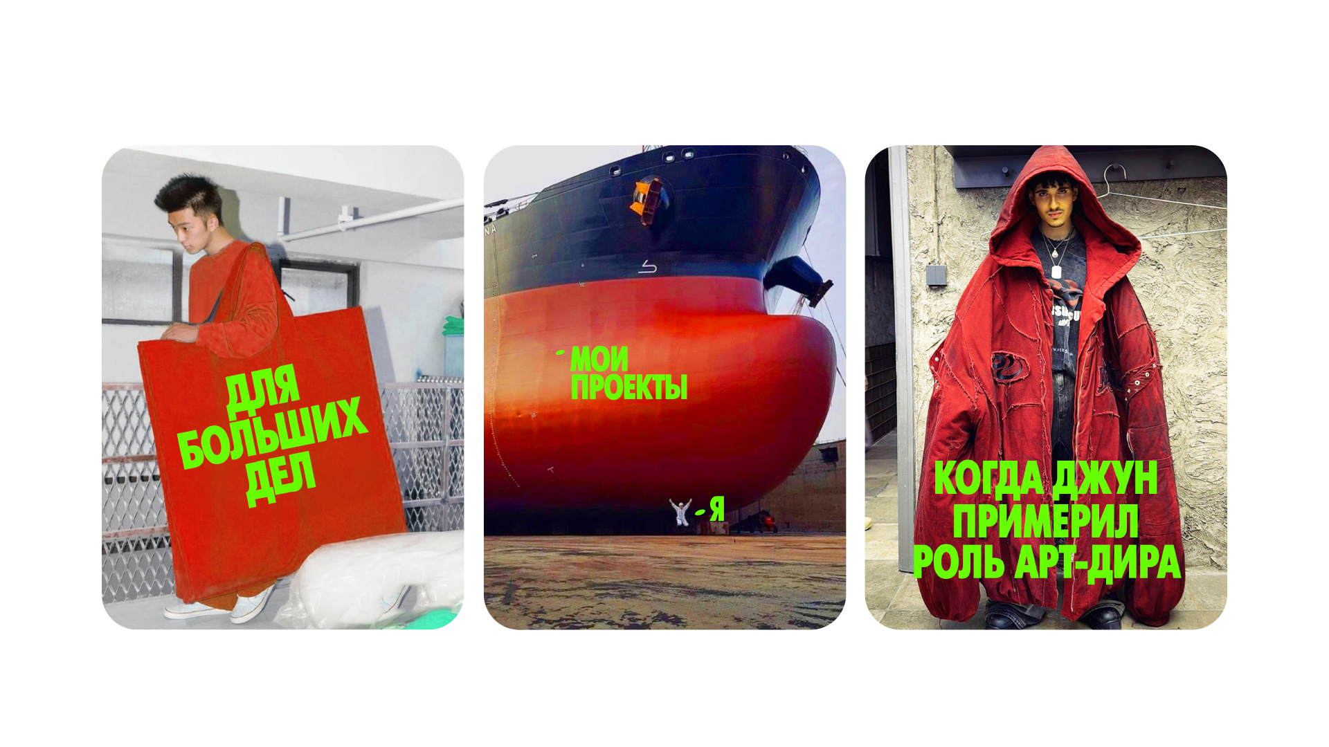 Был переосмыслен логотип, добавлены направления, создана визуальная система, построенная на основе цветов бренда с добавлением яркого зеленого акцента, символизируя молодых креаторов. В айдентике используются лаконичные шрифты, крупная типографика и резкие сетки, разработан фотостиль.Это подчеркивает идею масштаба, молодости, энергии и драйва.
