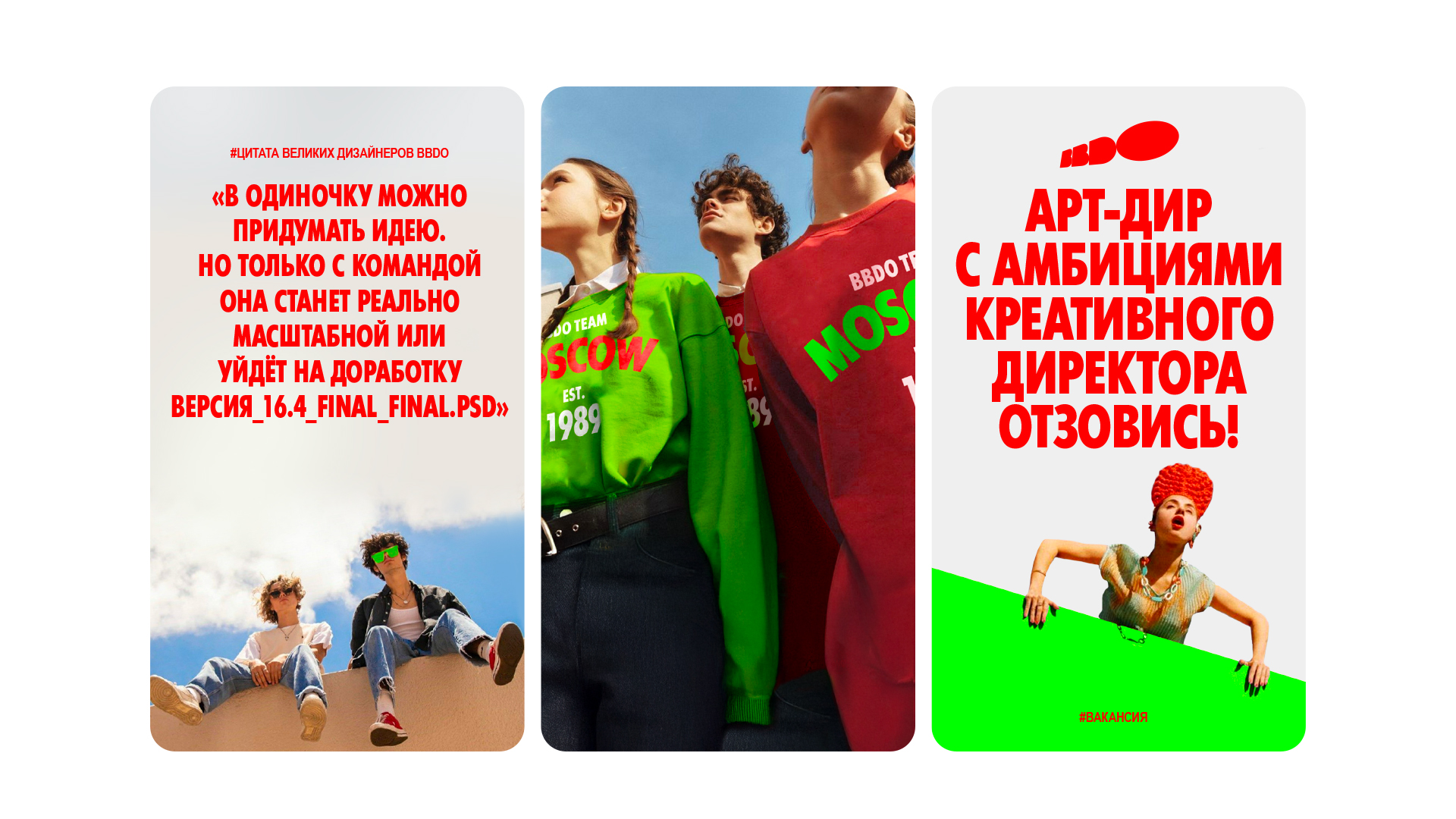 Новый визуальный код превратил HR-коммуникацию в самостоятельный медиаформат, узнаваемый и внутри индустрии, и для кандидатов. Визуальный язык транслирует ключевые качества BBDO: амбиции, командный драйв и немножечко иронии. Вместо сухого найма бренд говорит живо и дерзко, что позволяет привлекать тех, кто разделяет культуру агентства.