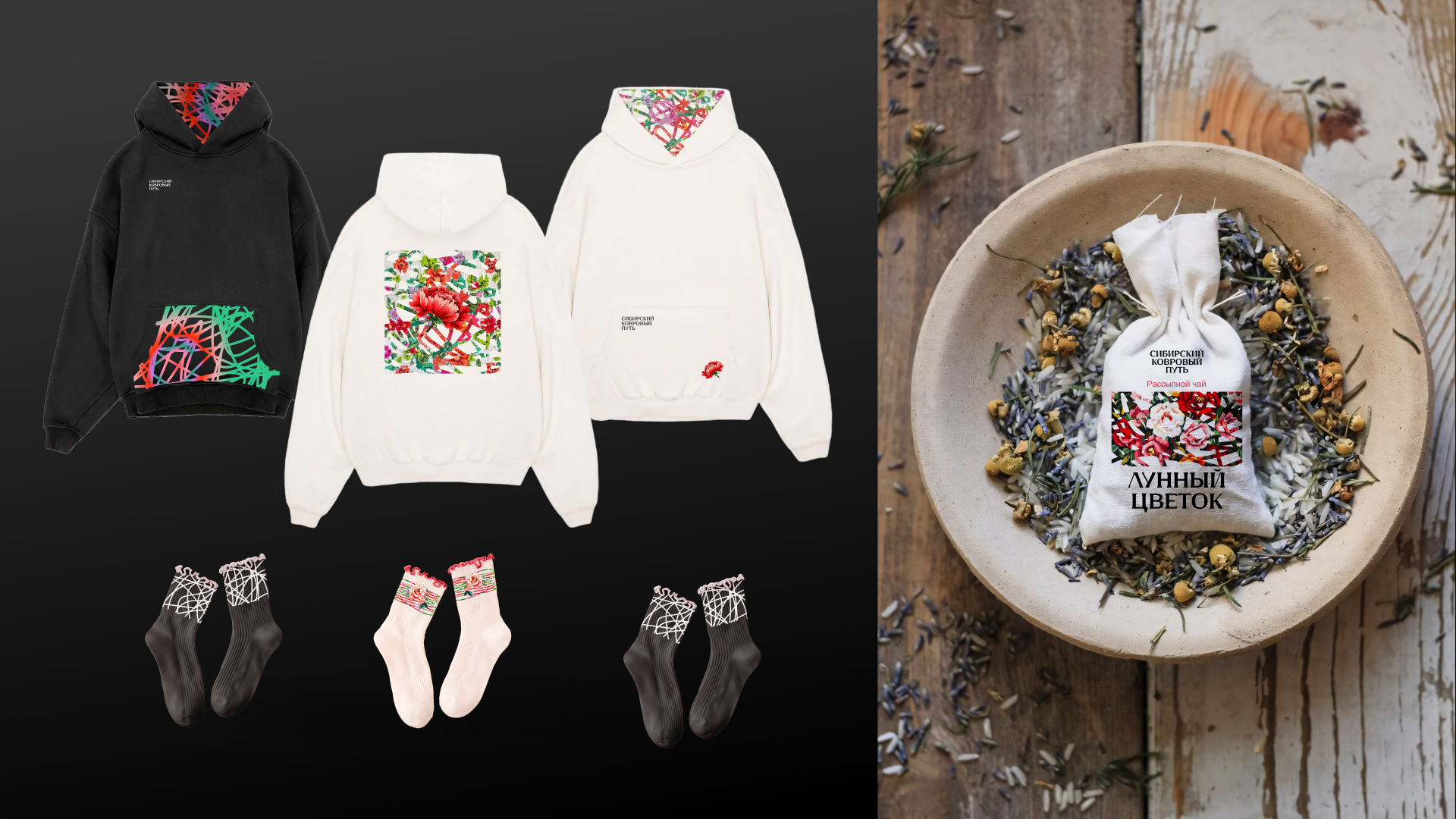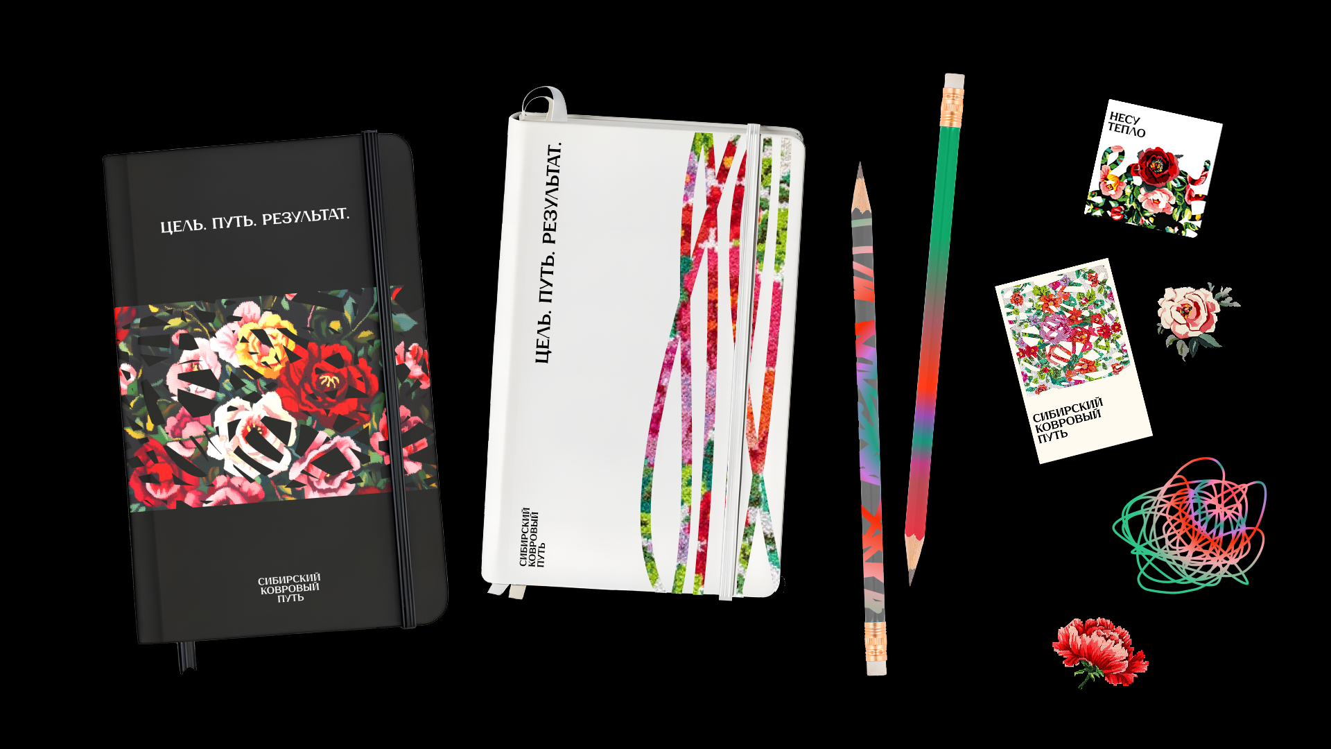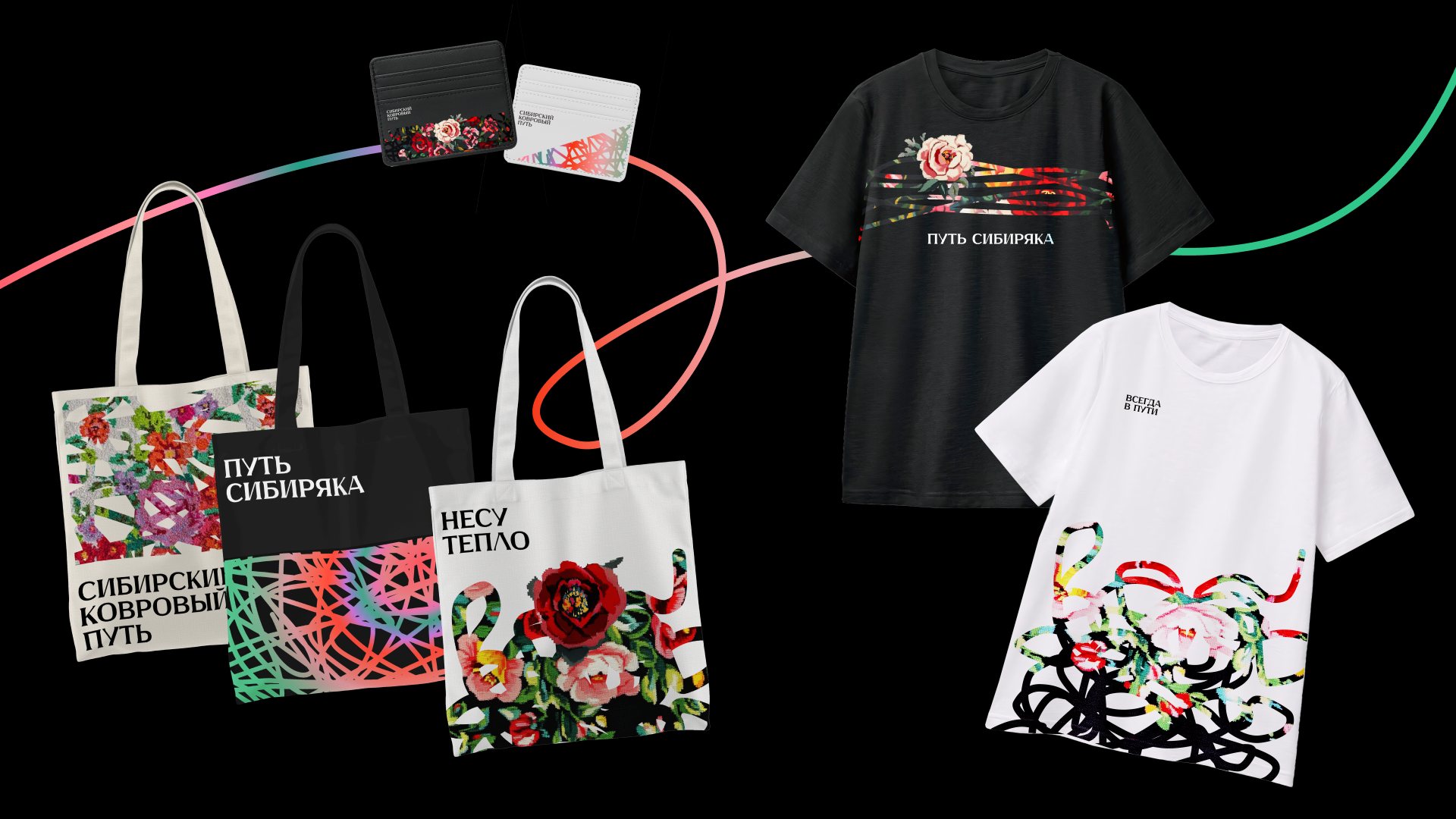 «Сибирский ковровый путь» – мерч, рассказывающий историю нити, проходящей путь от сырья до ковра. Это метафора человеческого пути – от цели к результату. Мы объединяем нить, ковер и тепло в визуальный язык.