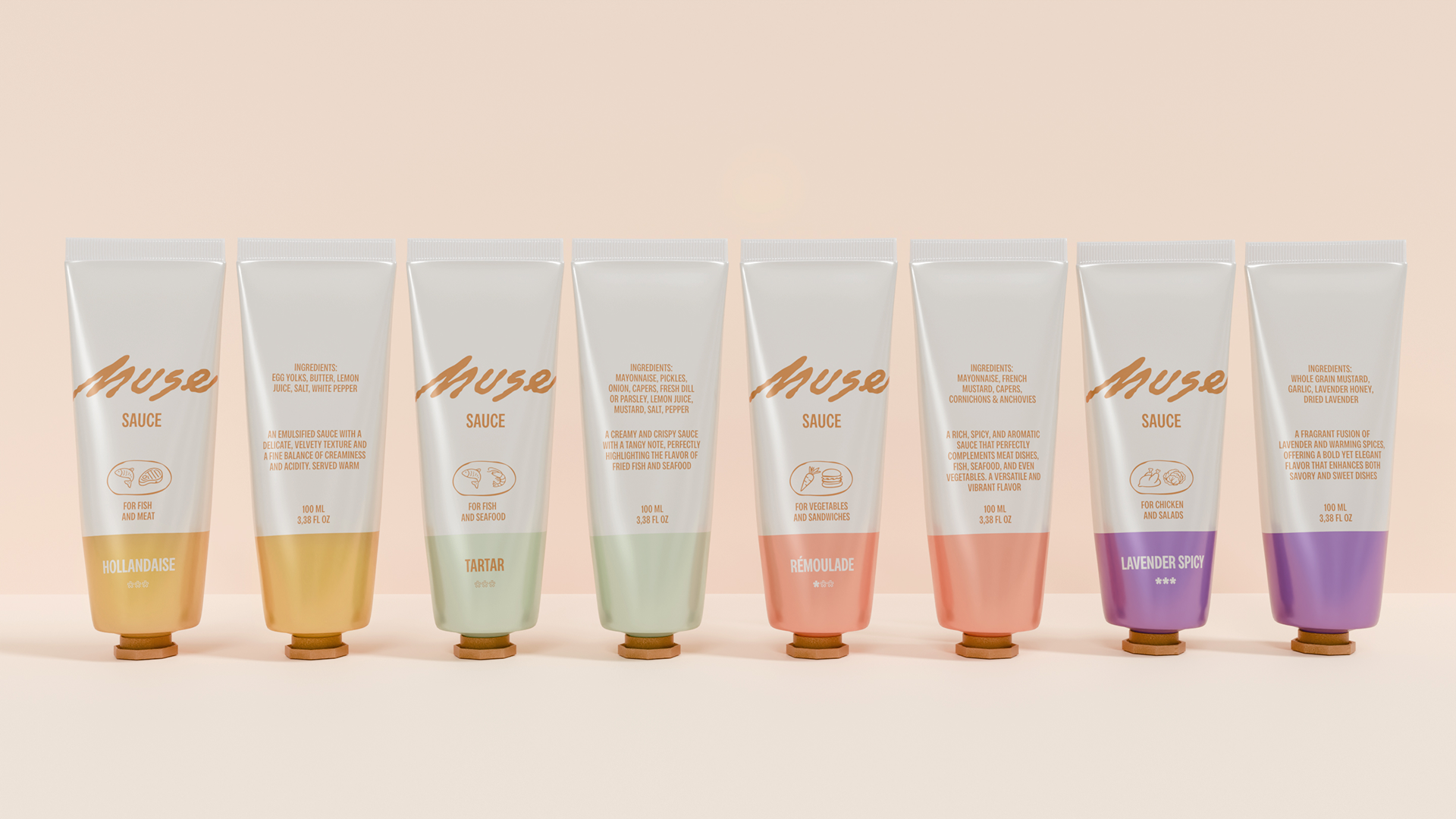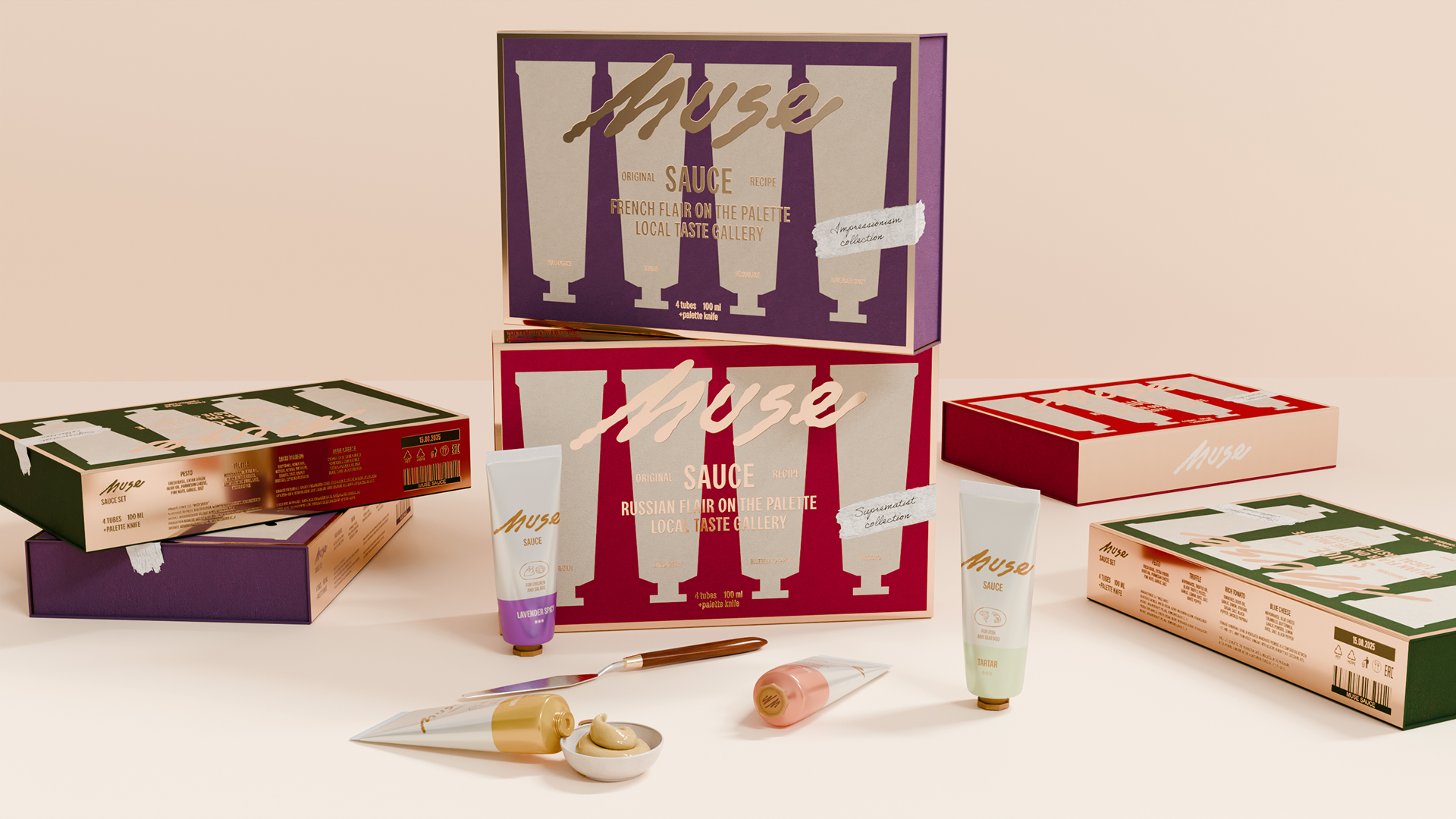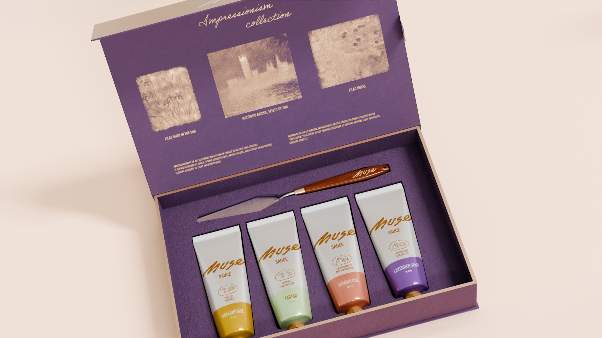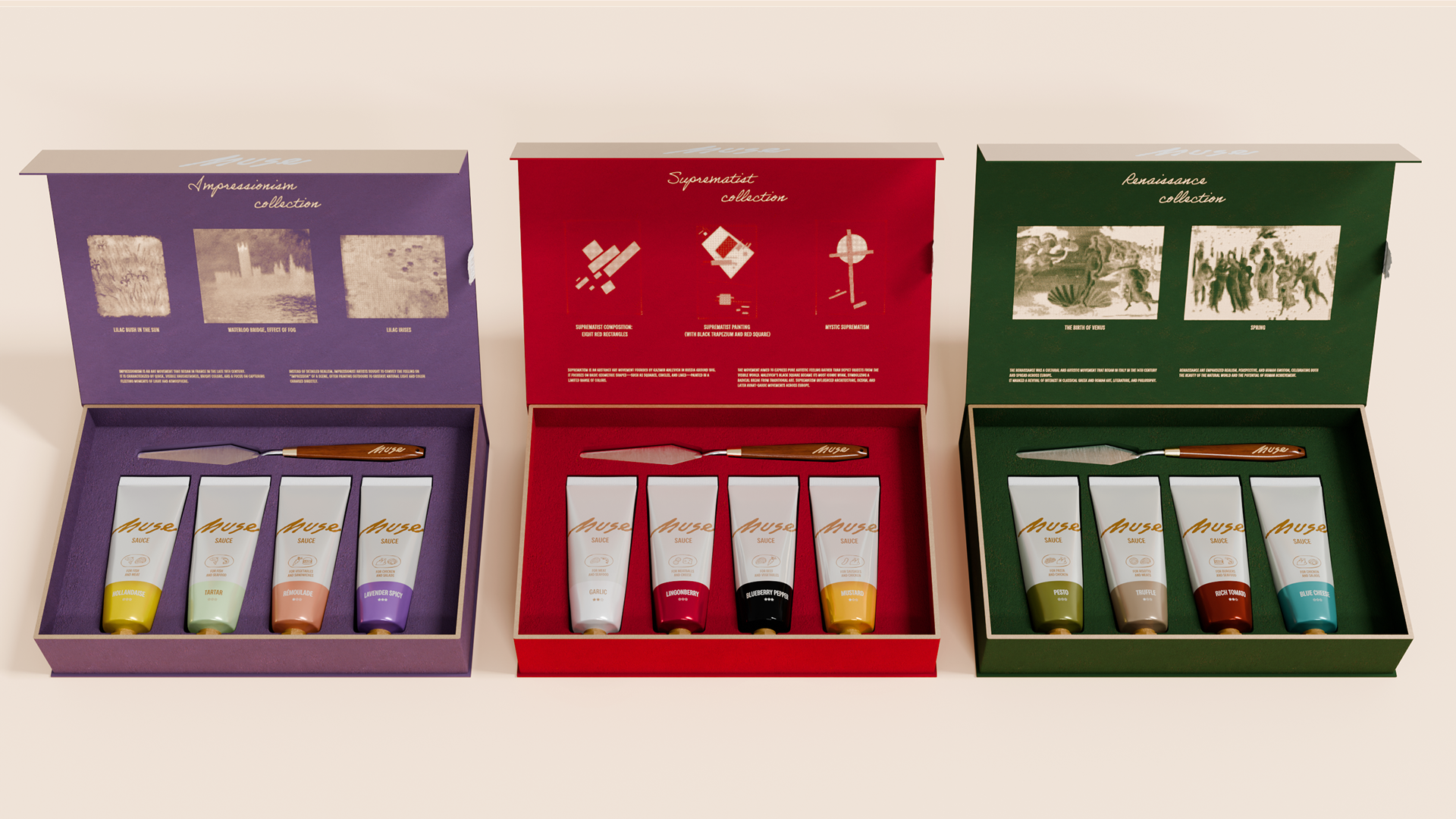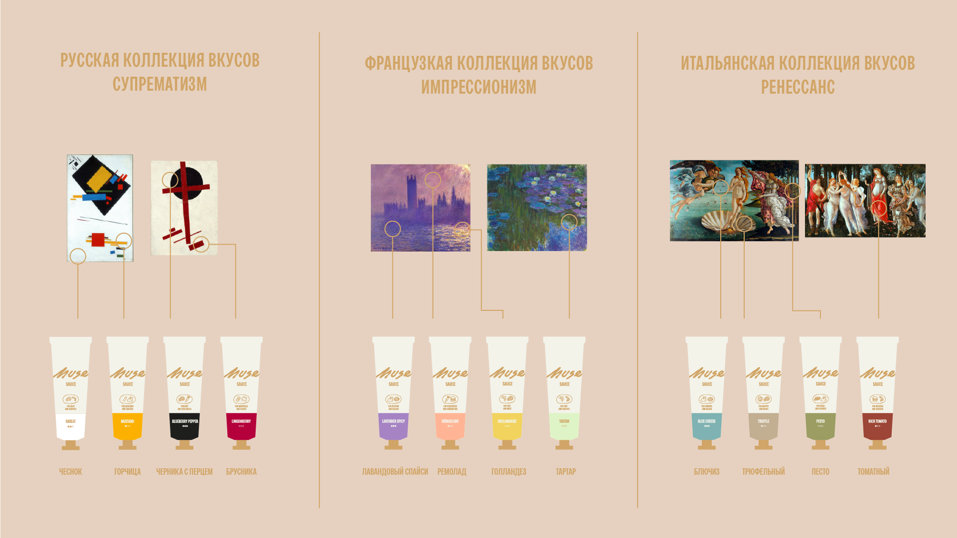 Каждая коллекция соусов отражает художественное направление, характерное для своей страны. Колорит картин становится основой для цветовой палитры. А особенности локальной кухни закладывают вкус соуса.