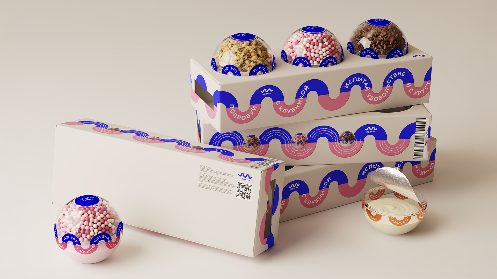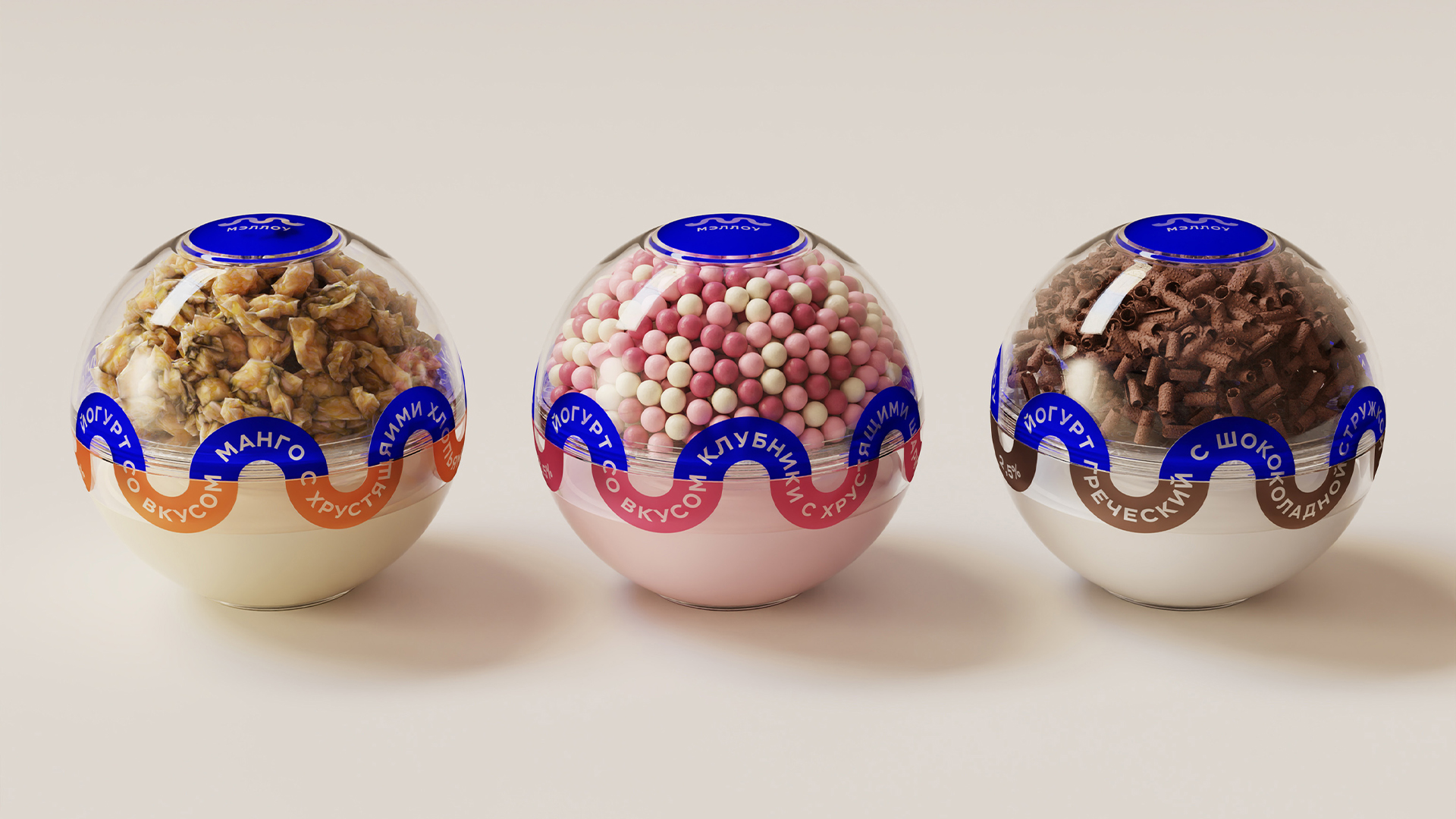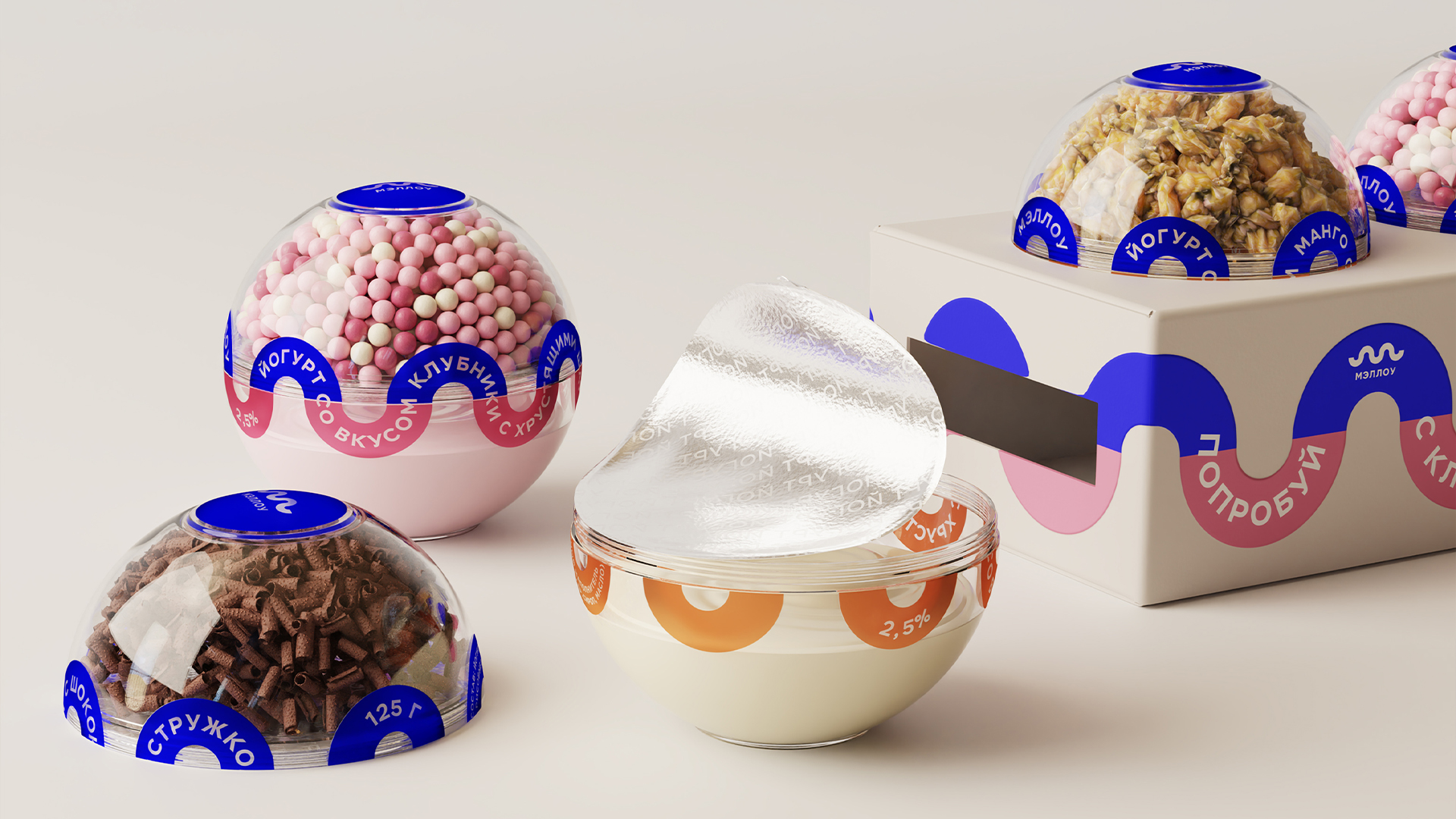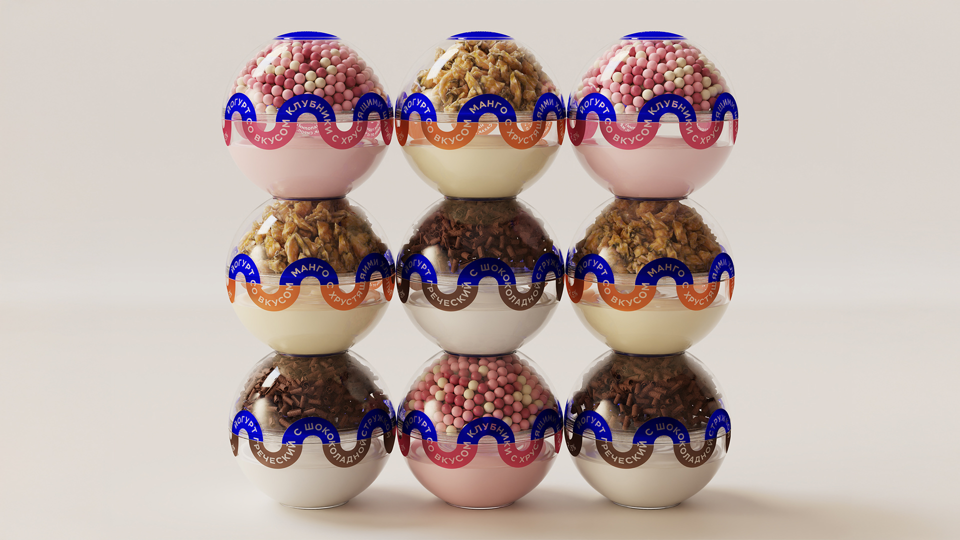 Упаковка разделена на две части: верхняя часть заполнена хрустящим наполнением, а нижняя содержит йогурт. Дизайн разработан сразу для линейки из трёх видов наполнения.