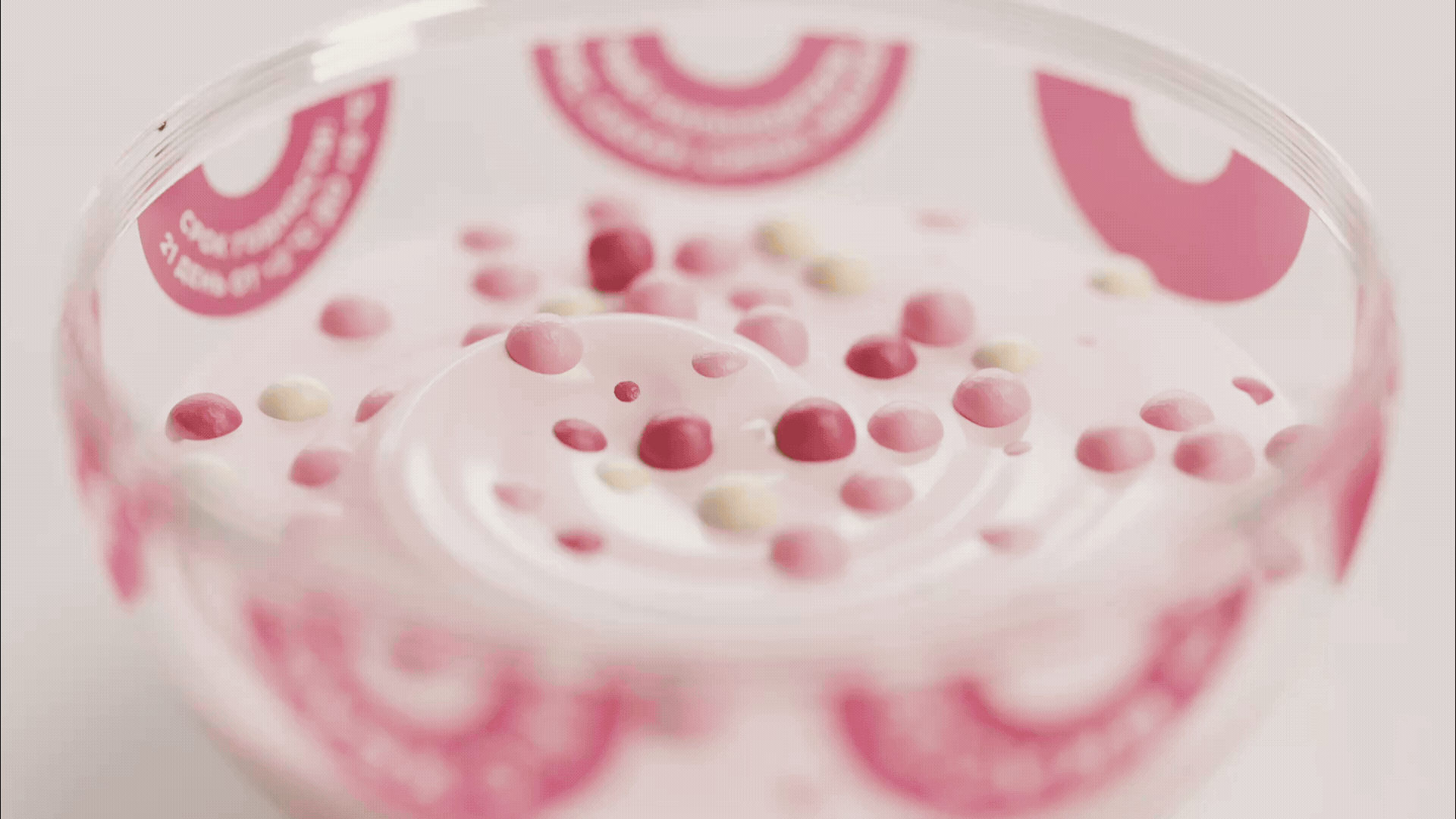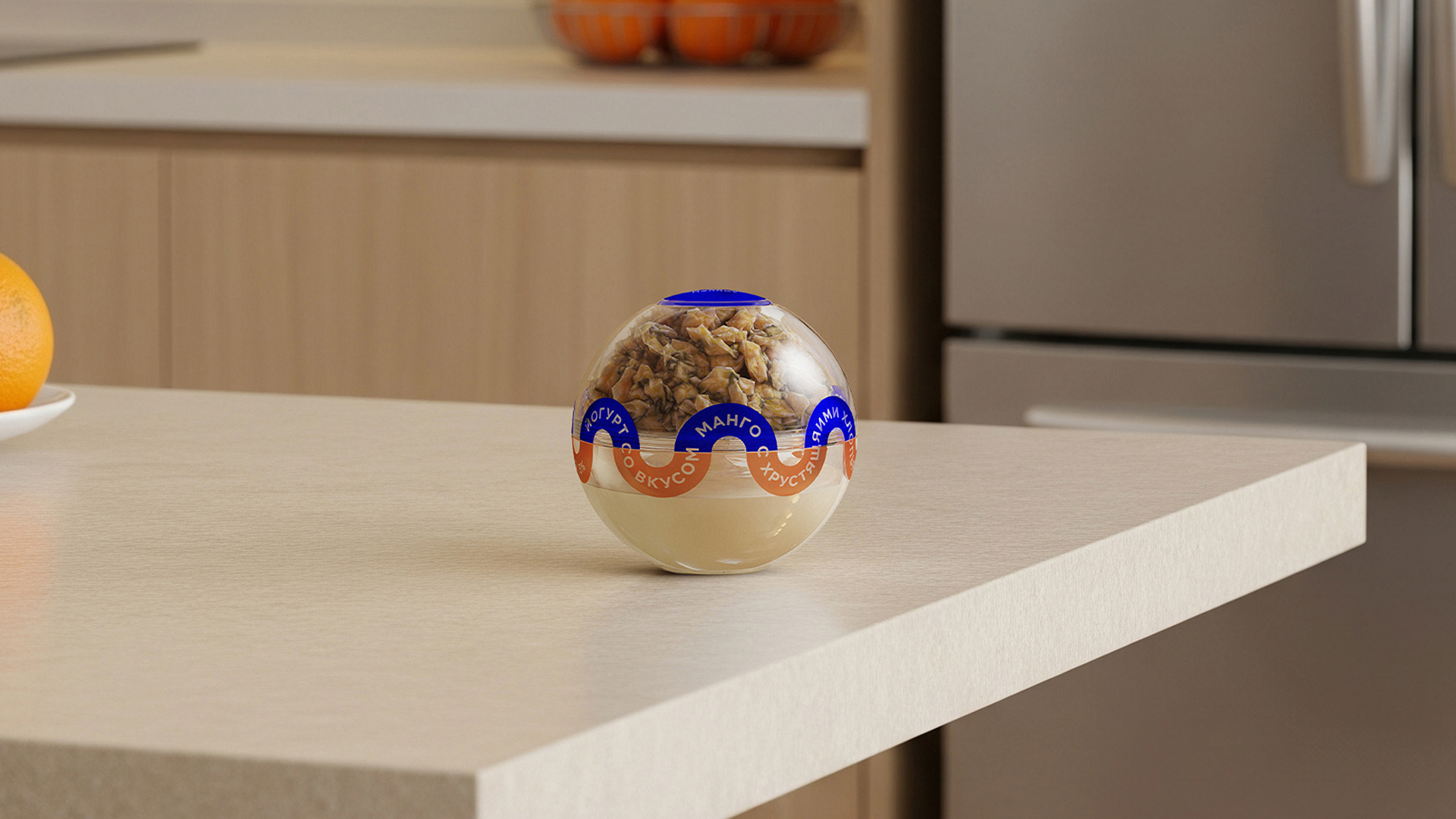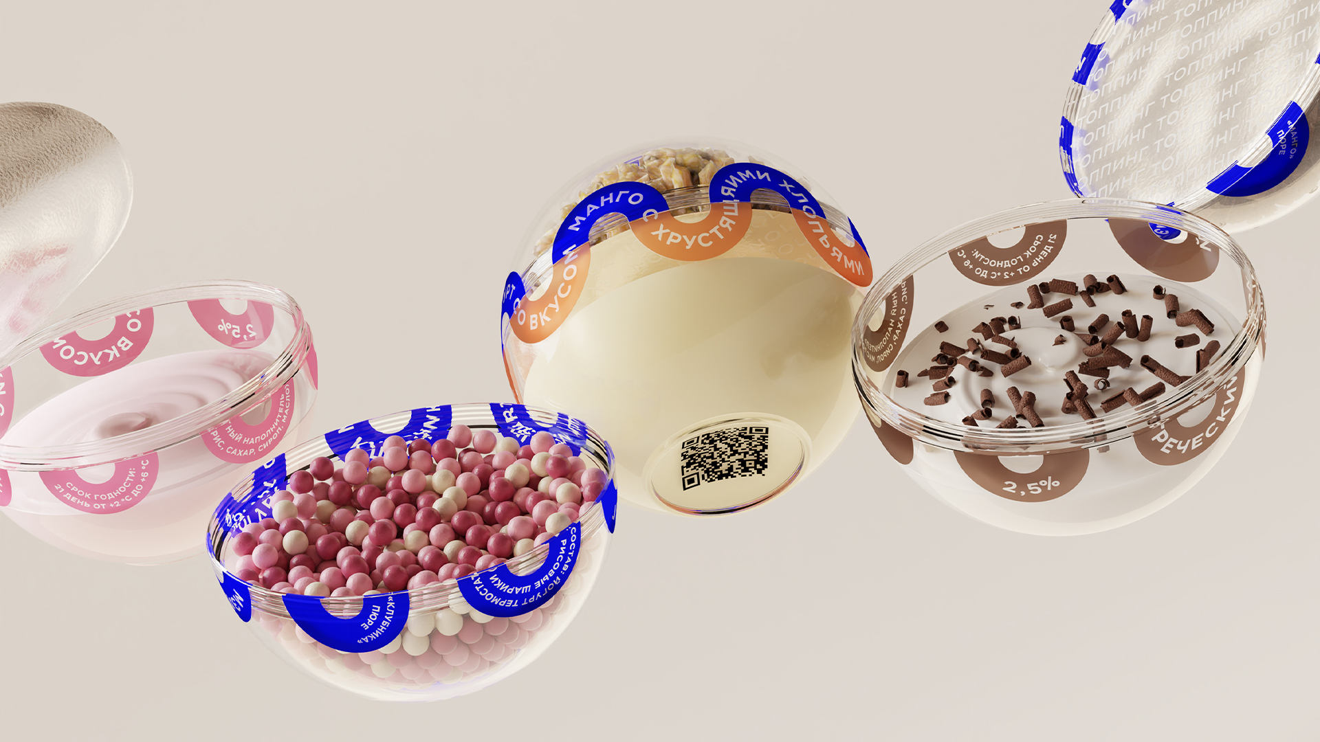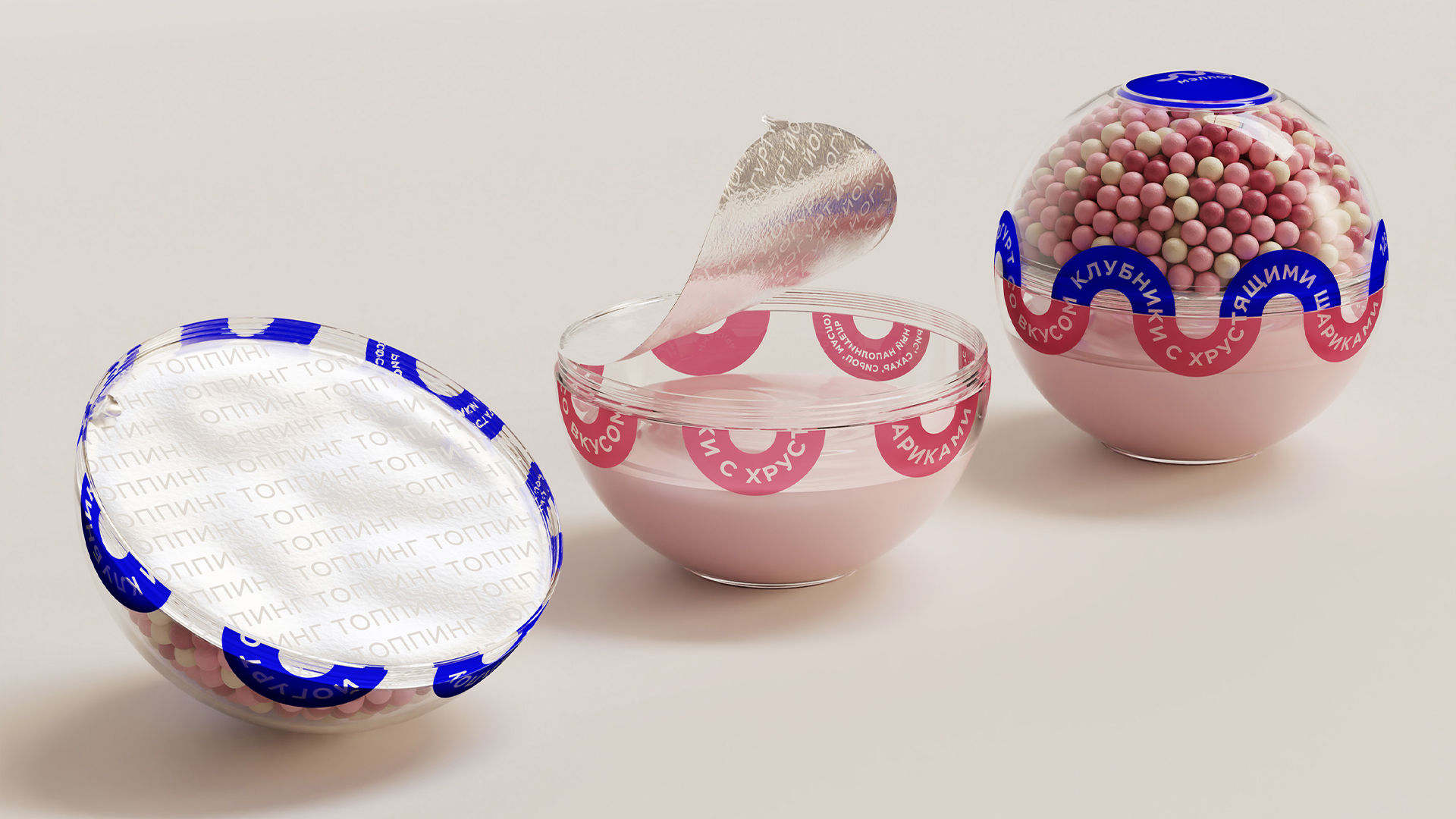 Упаковка разделена на две части: верхняя часть заполнена хрустящим наполнением, а нижняя содержит йогурт. Дизайн разработан сразу для линейки из трёх видов наполнения.
