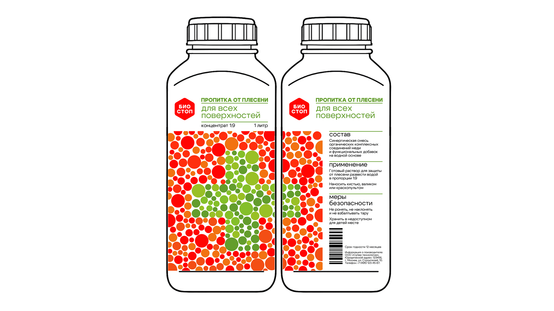 Упаковка выполнена в ярких цветах, в качестве референса был тест на дальтонизм, что делает продукцию привлекающей внимание. Цель данного бренда — оповестить о скрытой угрозе и предотвратить появление плесени