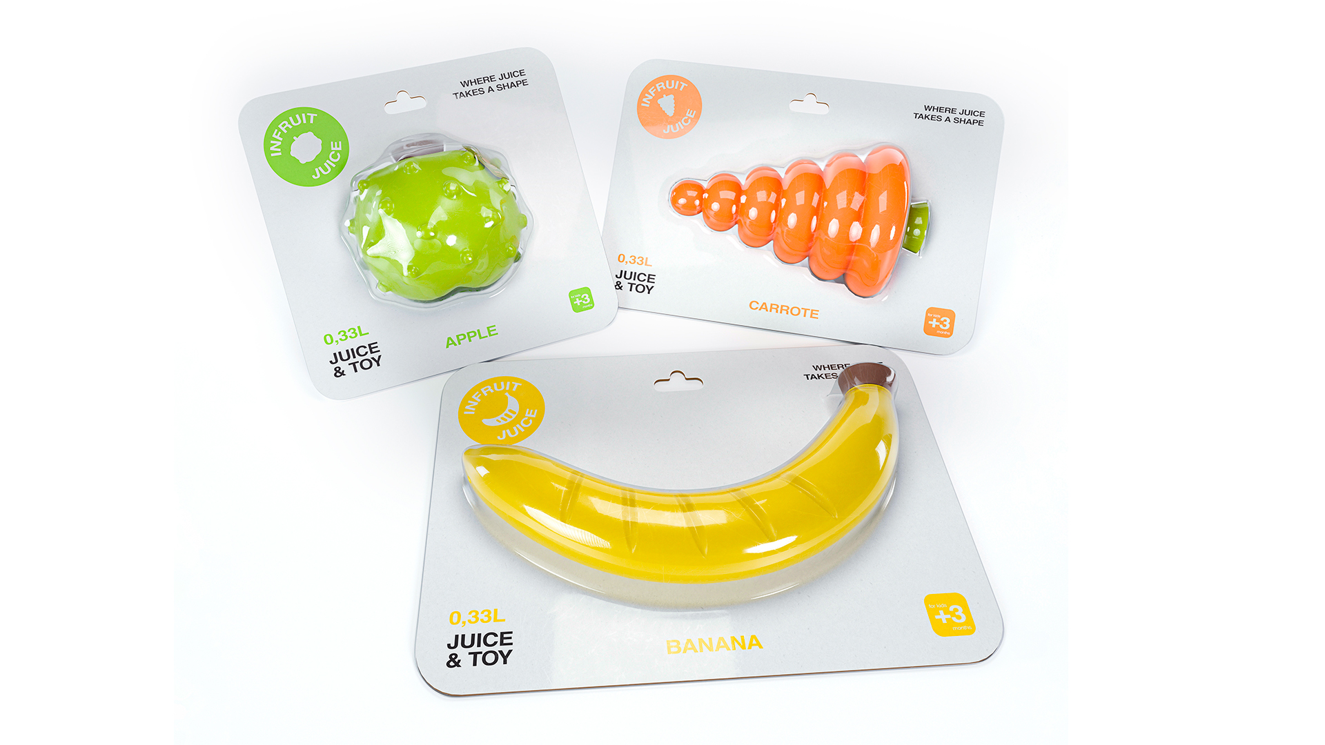 В упаковках мы объединяем два продукта в один. Формфактор первичной упаковки выполнен в виде овощей и фруктов, но с более фигурной и рельефной формой. Также важной особенностью продукта является пластик с разным покрытием: глянцевое, матовое, рельефное. Так, наши соки способствуют развитию моторики, знанию цветов фруктов и овощей у детей.