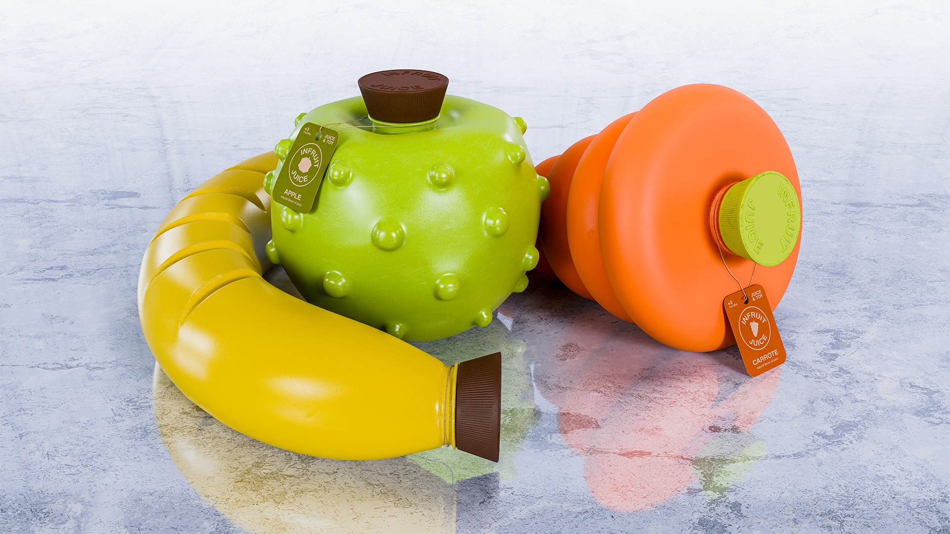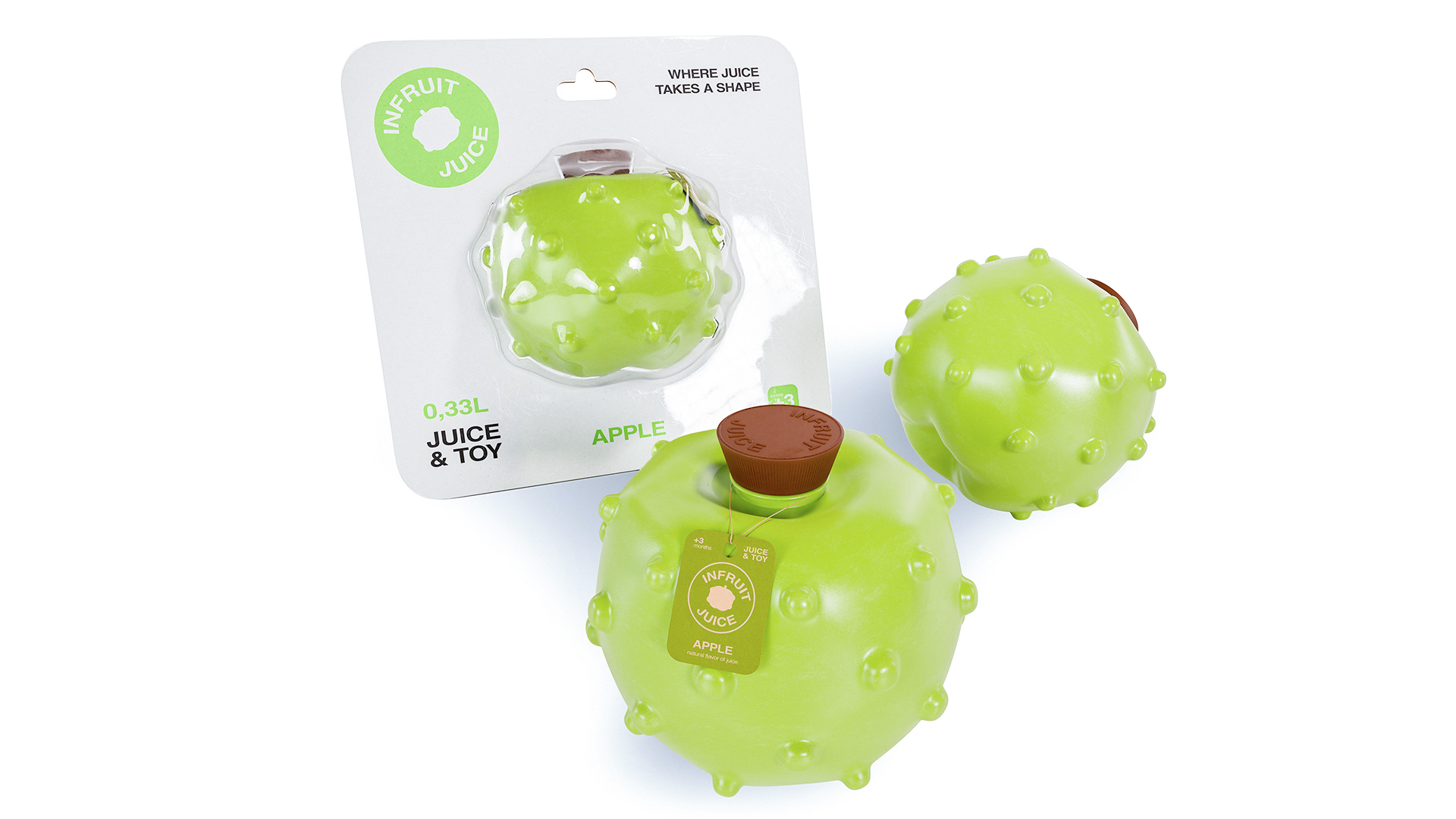 INFRUIT JUICE сочетает в себе: функциональность и веселье, безопасность и вкус, развитие и игру. Его вариативность отражается в логотипе, в котором статично остается форма круга и название и каждый раз меняется только объект внутри. Его форма отсылает к наклейкам на фрукте.