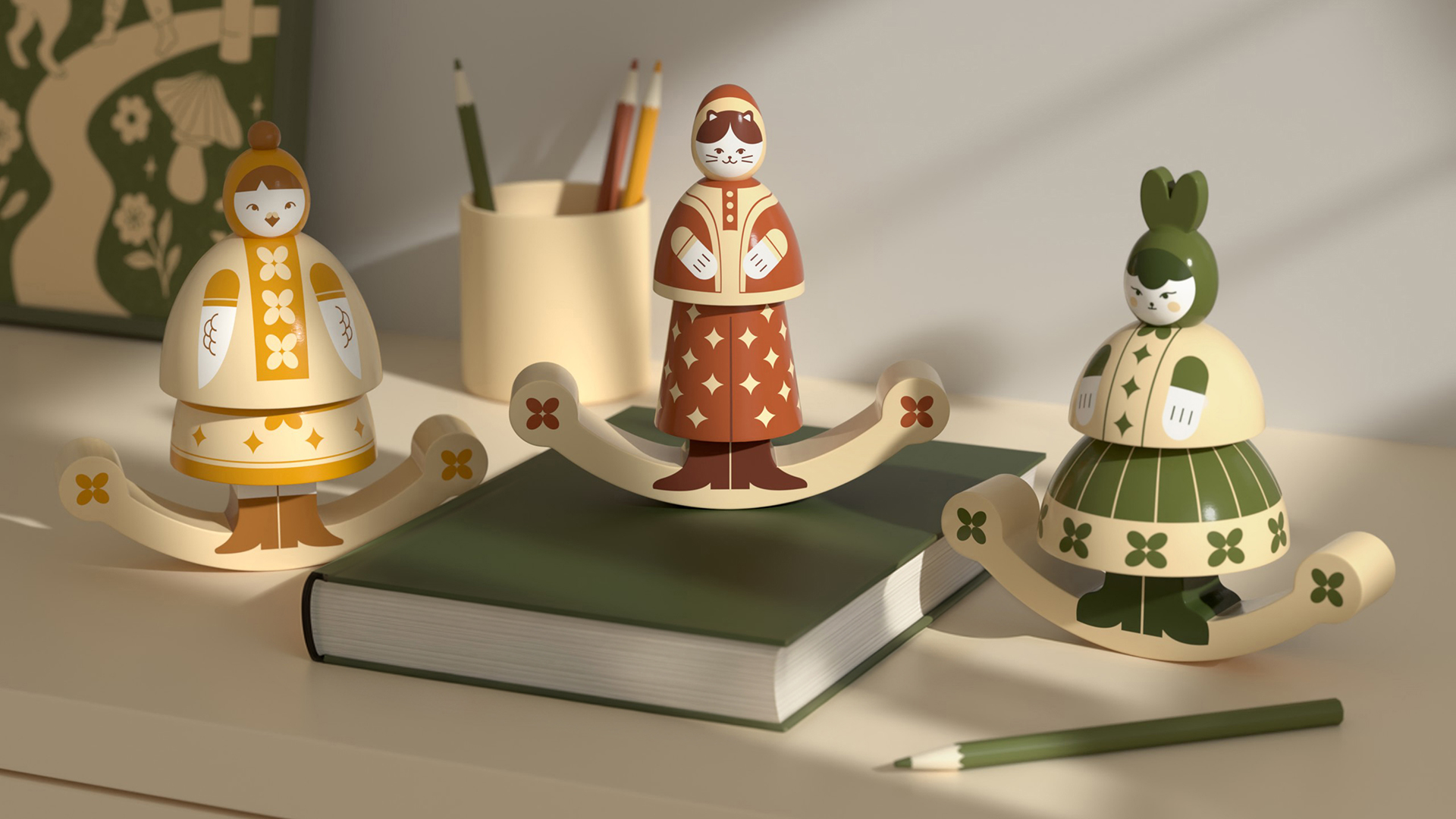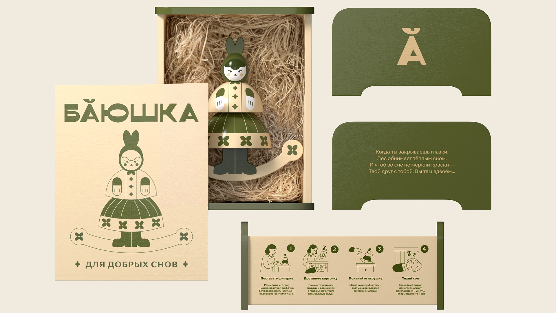 В основе бренда — образ баюшки: доброго персонажа, возникающего из славянских мифов. Это не просто игрушка, а участник вечернего ритуала. Каждая фигурка связана с конкретной колыбельной: родитель достаёт карточку, читает текст, слегка покачивает игрушку на тумбочке — и в этот момент возникает связь между родителем, ребенком и прошлыми поколениями...