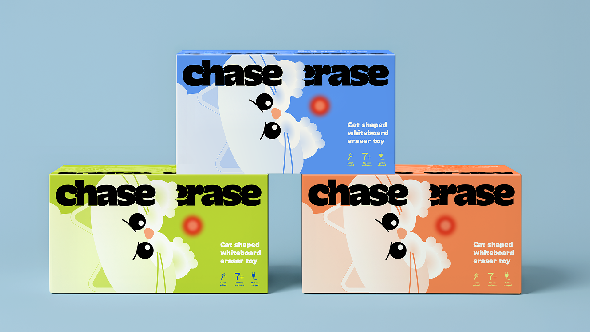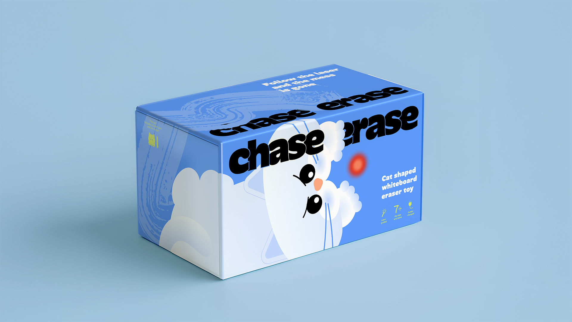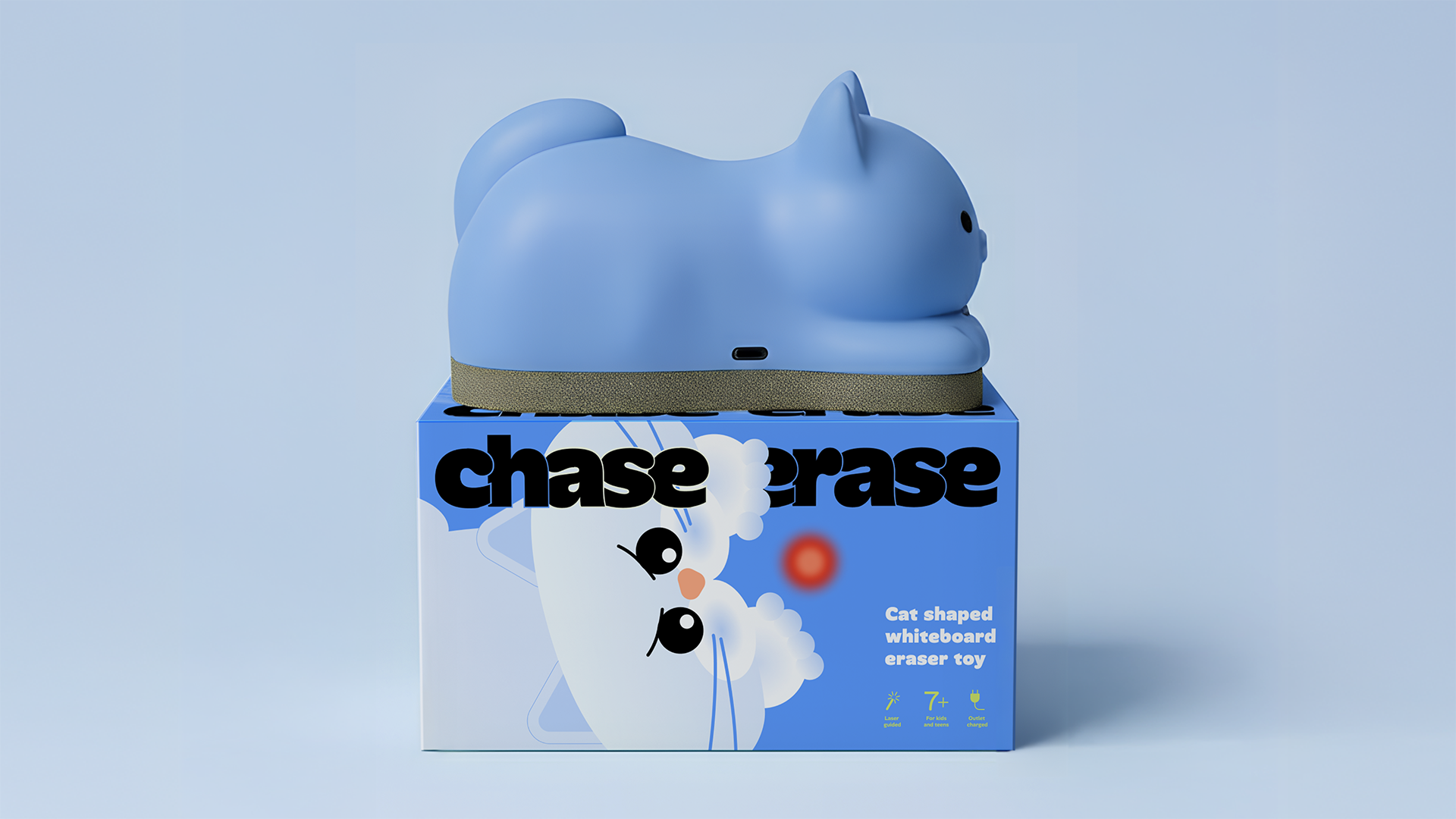 Chase • Erase (Гонись • стирай) — это умный ластик в форме кошки для маркерной магнитной доски, который превращает скучную рутину в игру. Достаточно навести лазерную указку на доску, и кошка «оживает»: она стремительно бежит за точкой и стирает надписи сама.