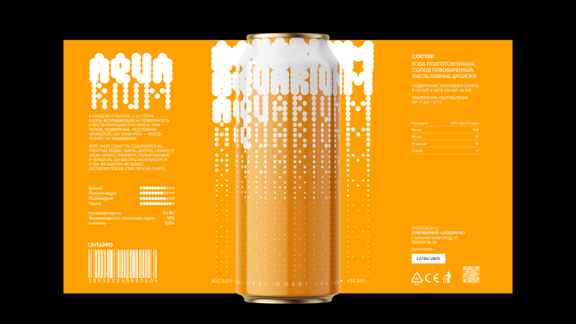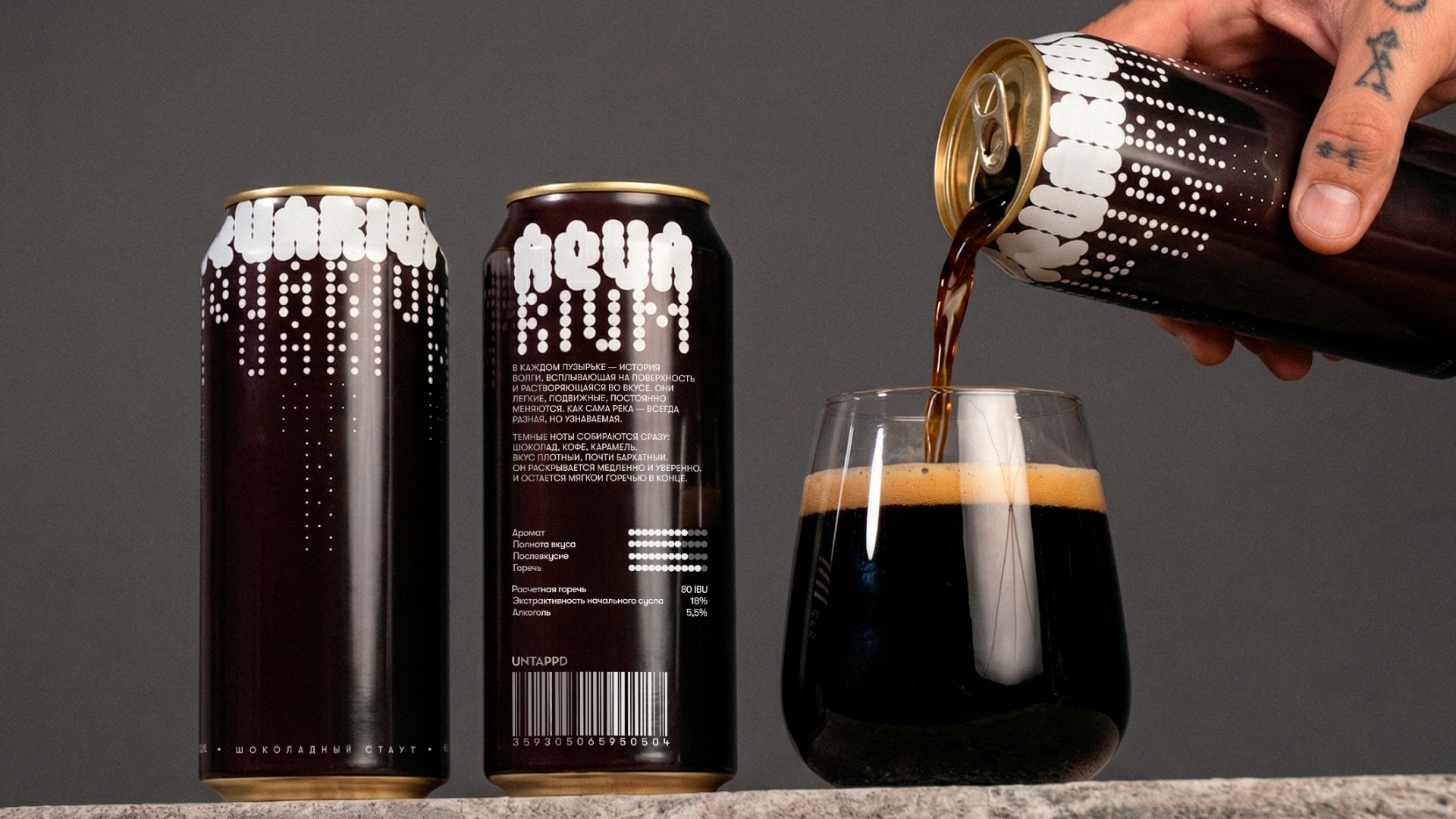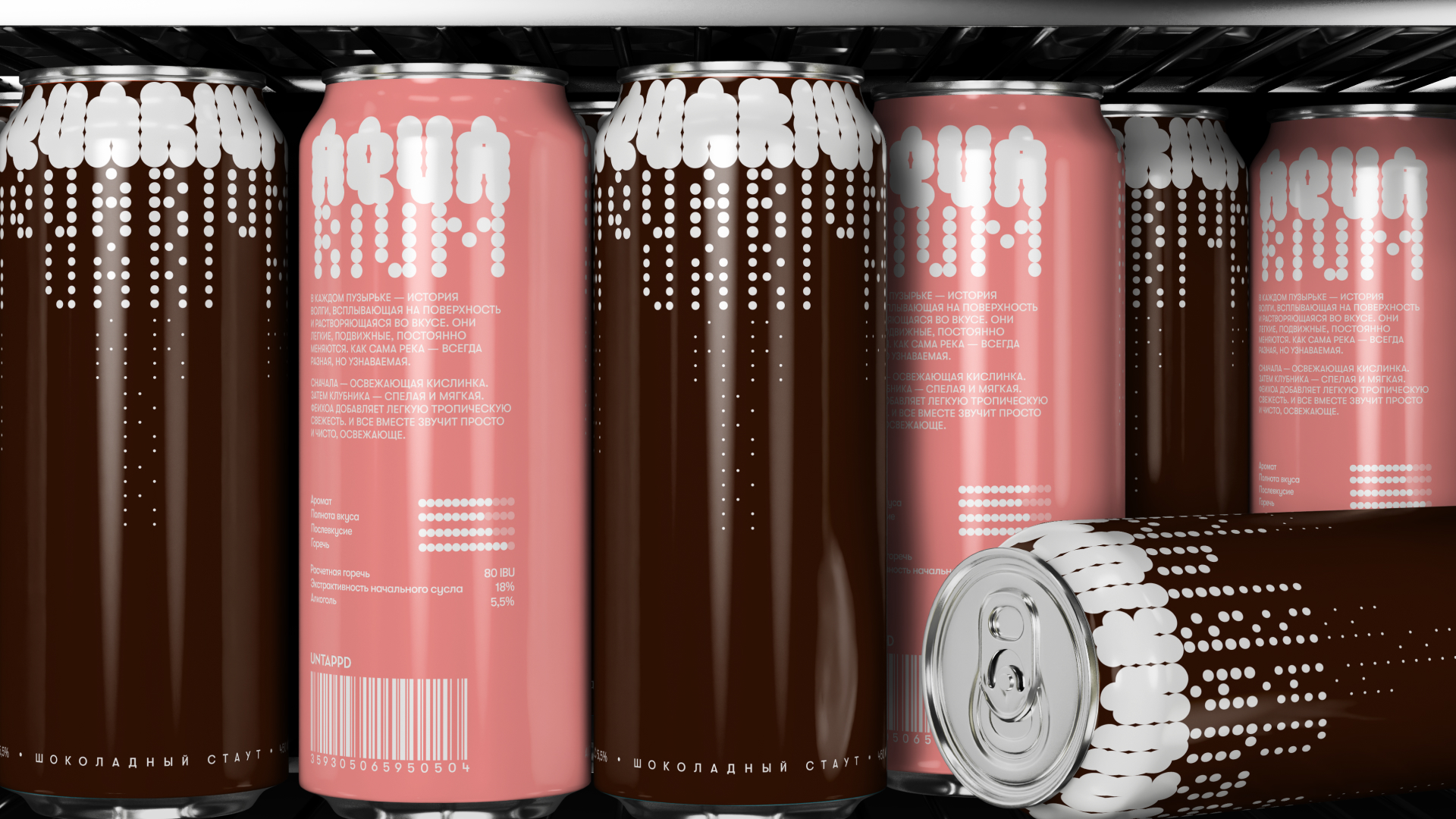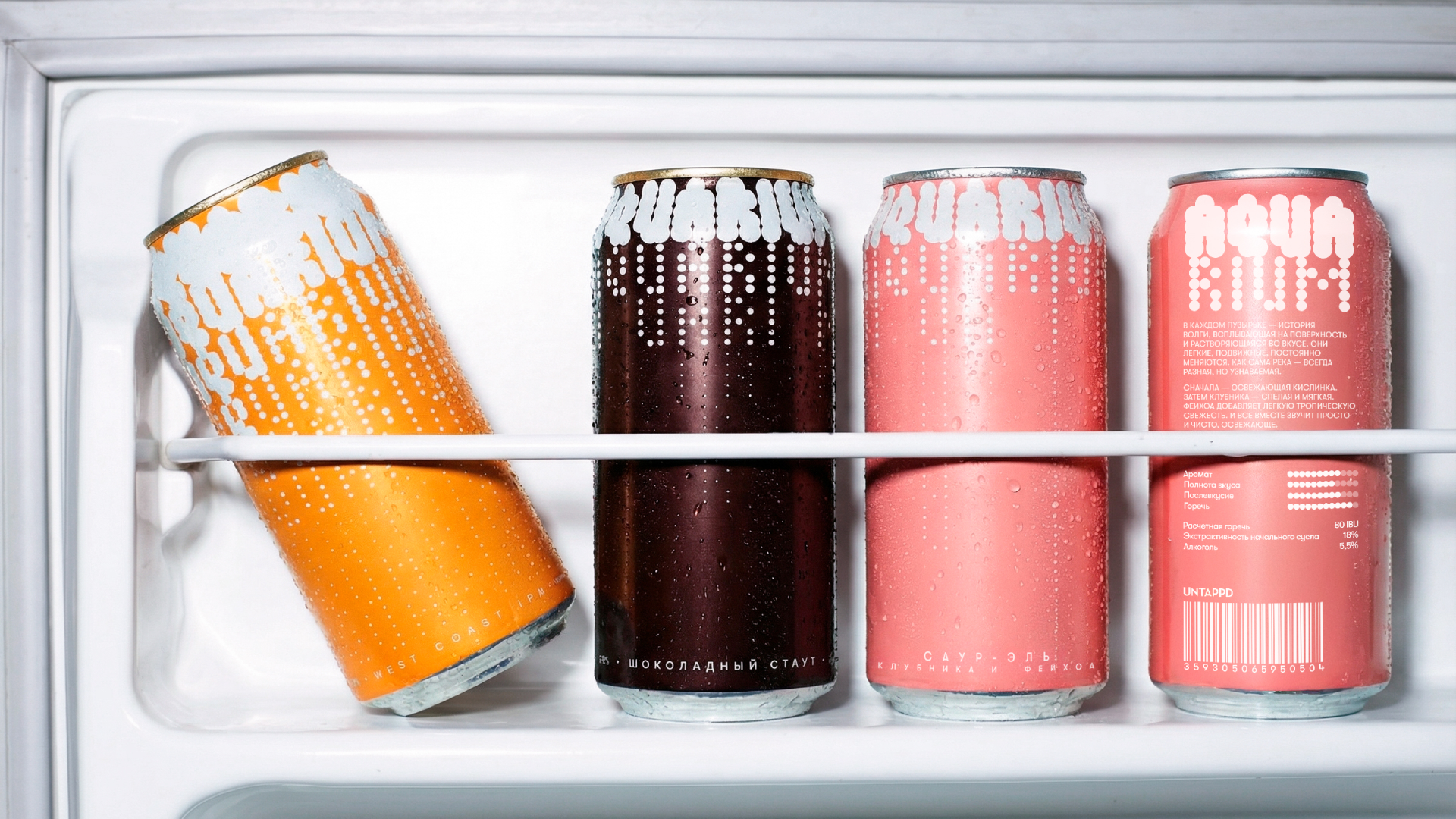 «Aquarium» — крафтовое пиво из Нижнего Новгорода. Концепция упаковки строится вокруг пены. Каждый сорт в линейке «Aquarium» отличается не только вкусом, но и характером пены: её плотностью, устойчивостью и поведением. Это становится ключевым визуальным кодом упаковки.