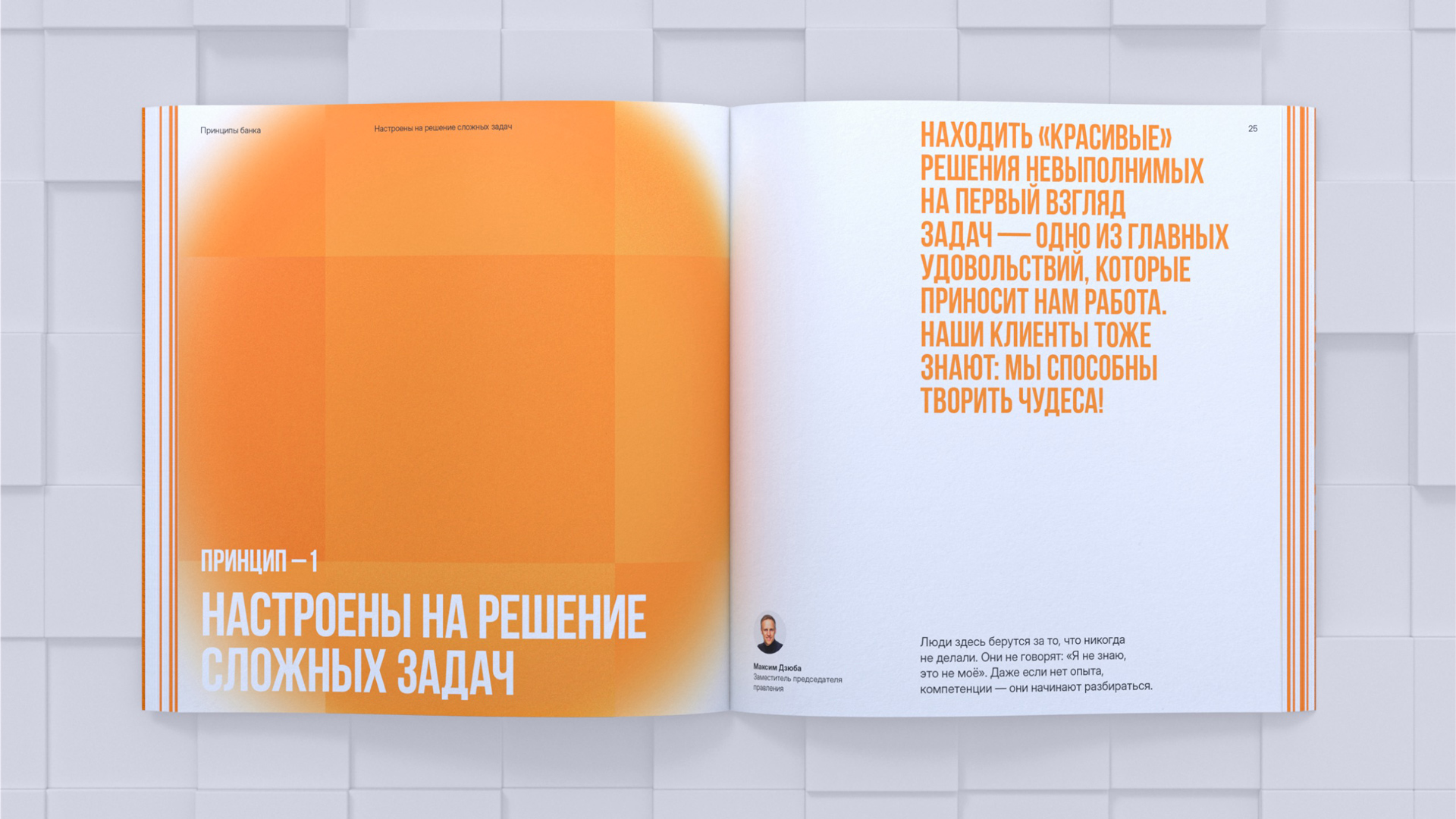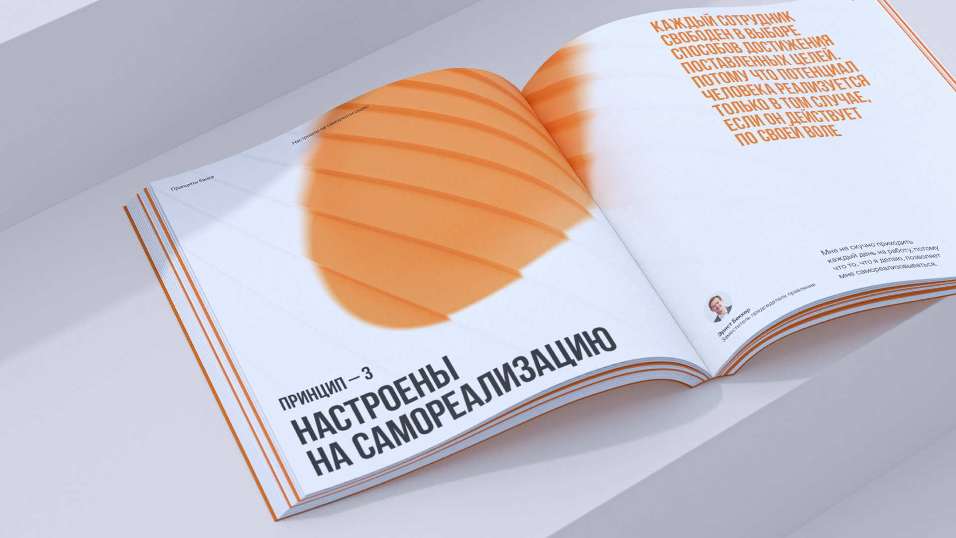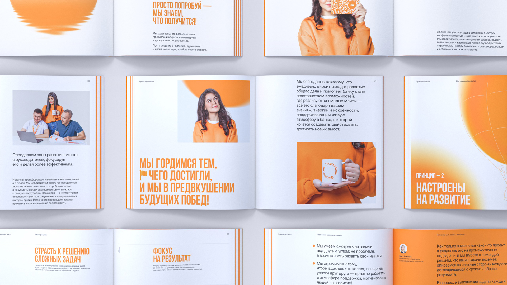 Так появилась идея Оранжевой книги Экспобанка, где оранжевый не просто фирменный цвет бренда — это цвет настроения, отношения, радости и жизнелюбия. Это раз.