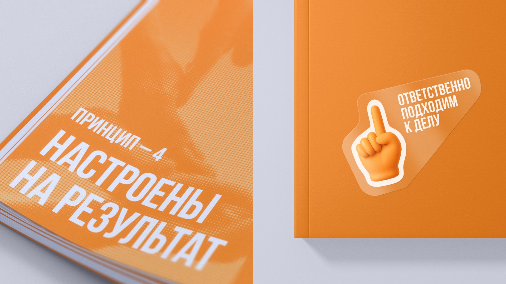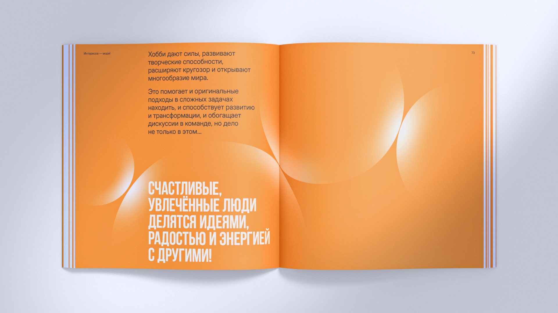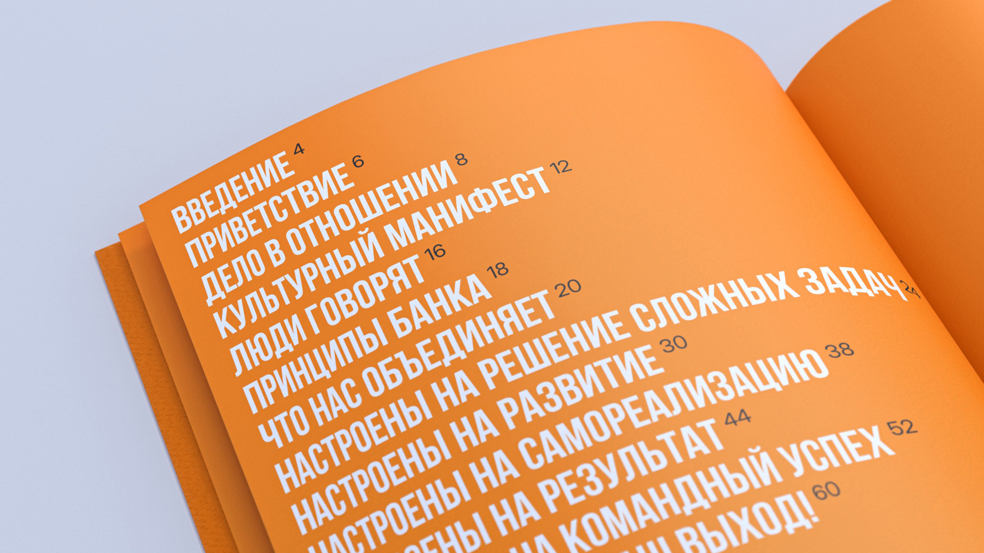 Так появилась идея Оранжевой книги Экспобанка, где оранжевый не просто фирменный цвет бренда — это цвет настроения, отношения, радости и жизнелюбия. Это раз.