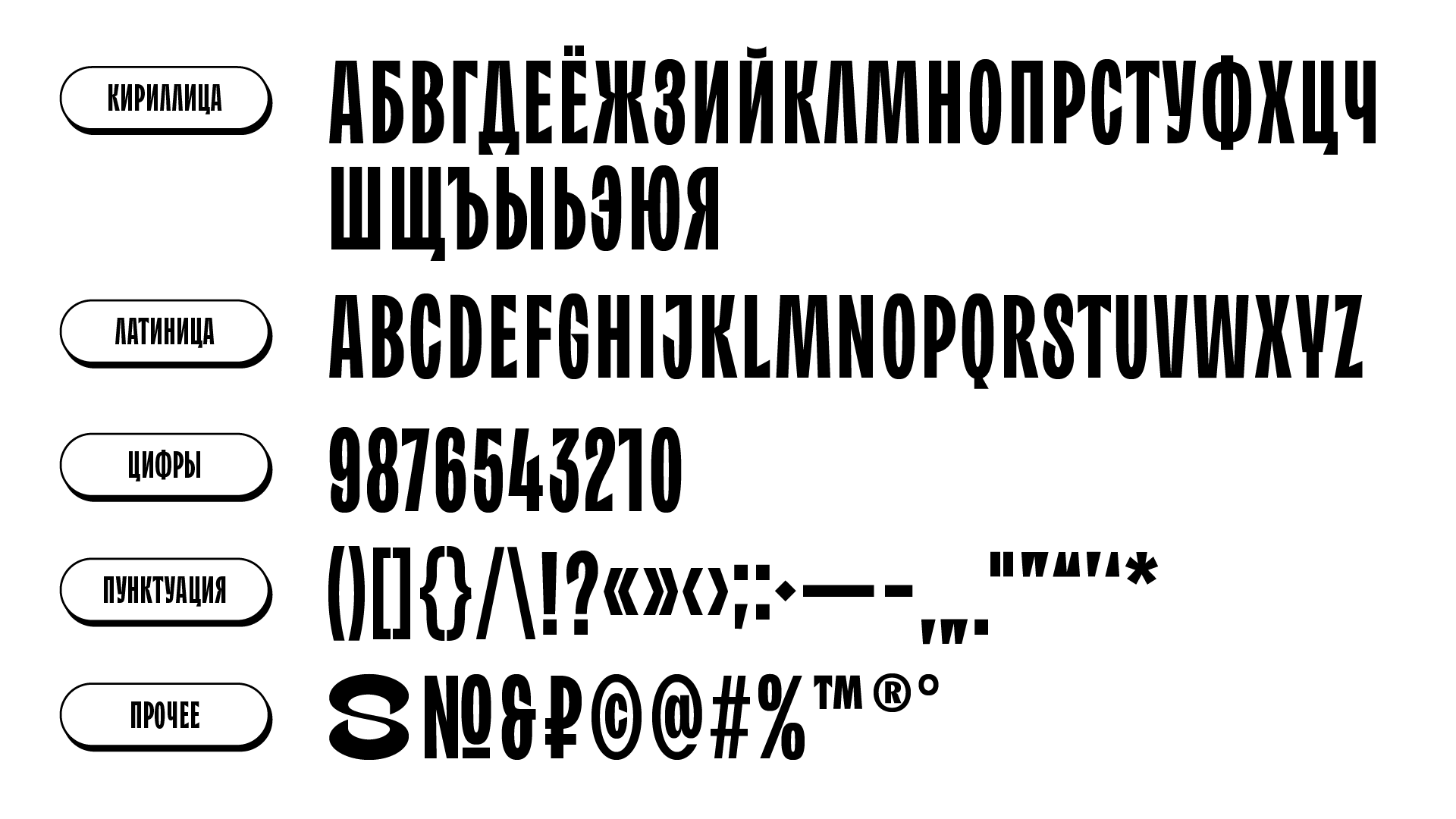 Узкий, плотный и колючий акцидентный гротеск. Обилие остроконечных элементов — его главная особенность. Закрытые круглые знаки шрифта обладают достаточно закрытой апертурой, но отличаются от привычных закрытых гротесков обращёнными вовнутрь наклонными срезами штрихов. Эти срезы поддерживаются треугольными терминалами, скошенными выносными элементами кириллических знаков и декоративными ловушками для краски. Тонкие соединения в знаках с наклонными штрихами также участвуют в усилении характера. Остроконечность шрифта уравновешивают приплюснутые овалы и полуовалы, которые делают шрифт дружелюбным.