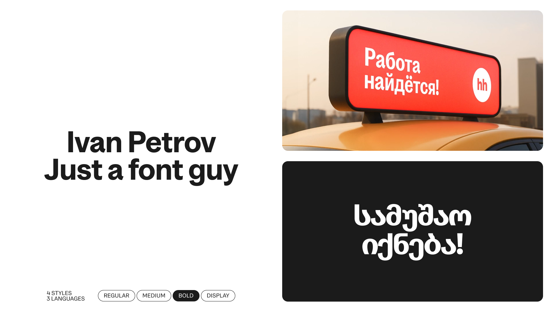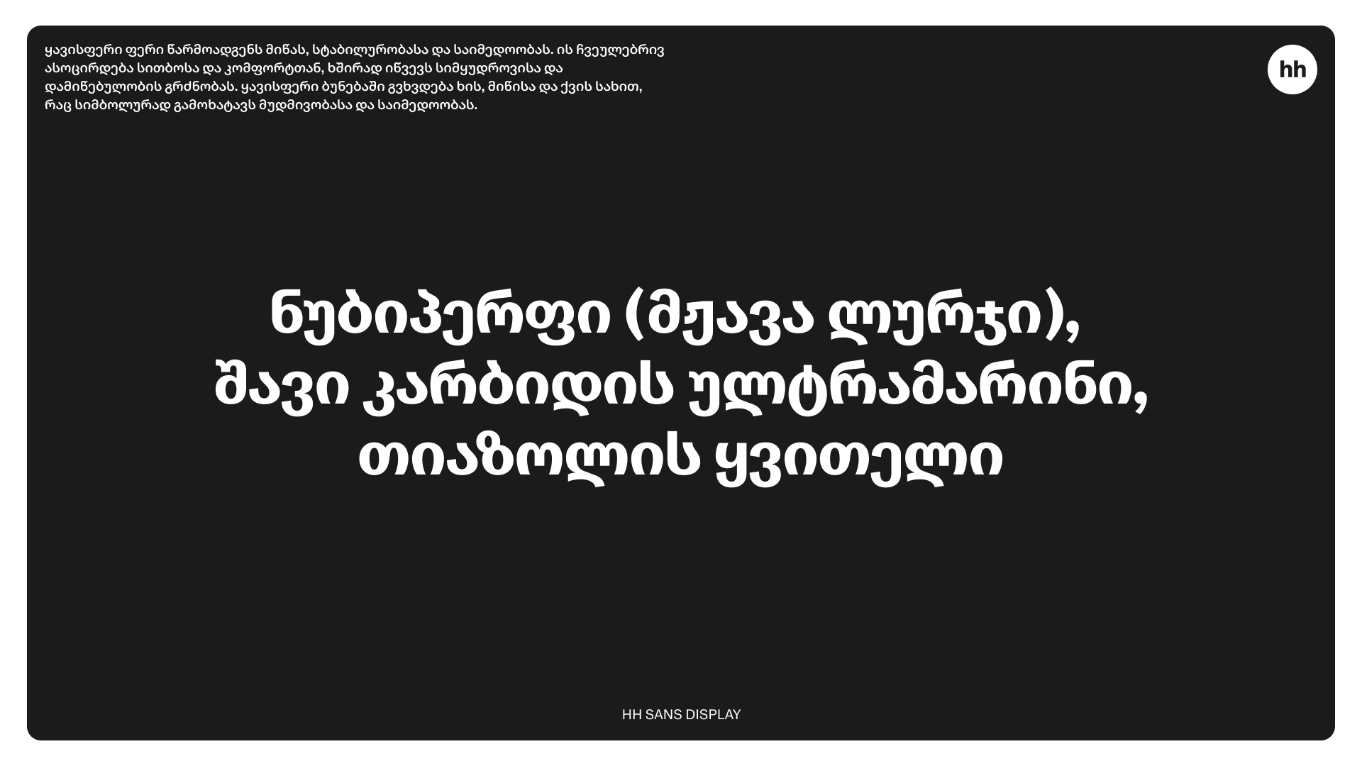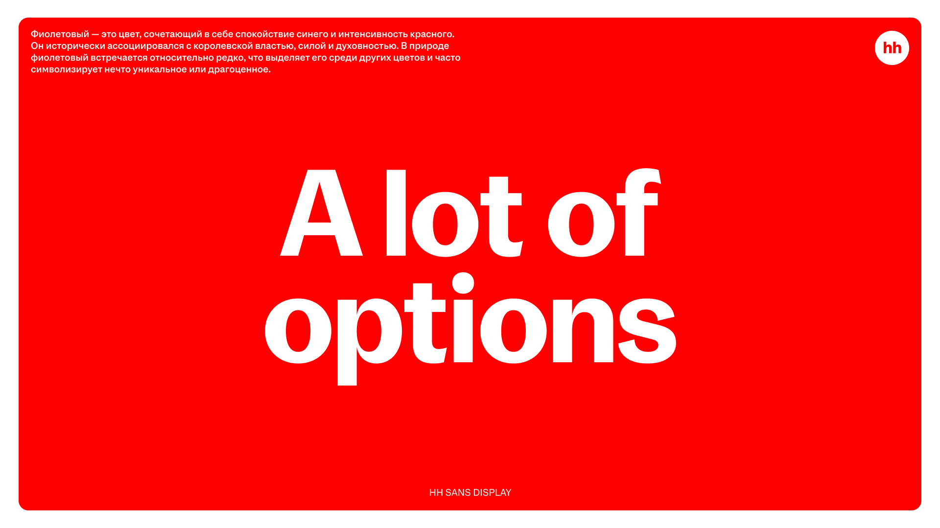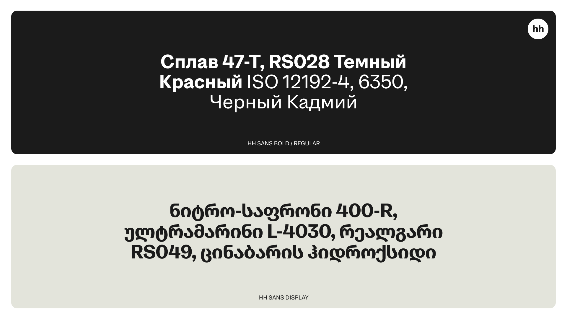 Набор включает три текстовых начертания и яркое дисплейное, которое используется в заголовках. Поддержка расширенной латиницы, кириллицы и грузинского алфавита делает hh sans универсальным инструментом для бренда с широкой географией.